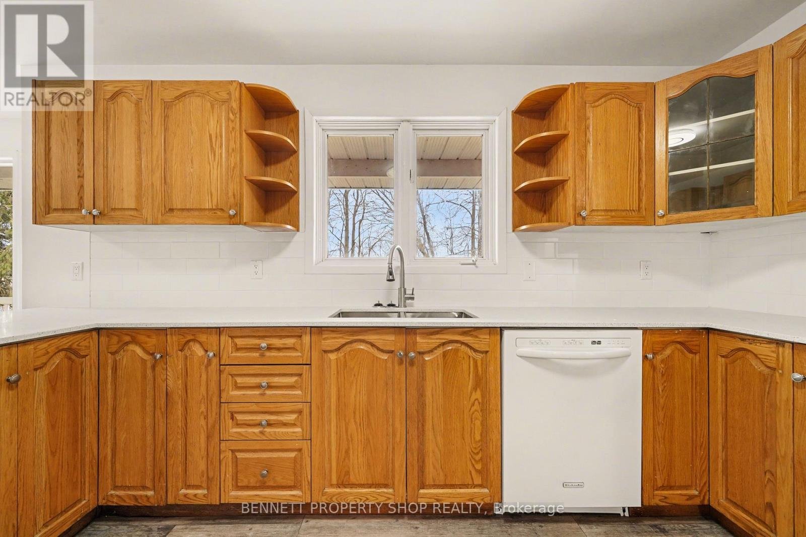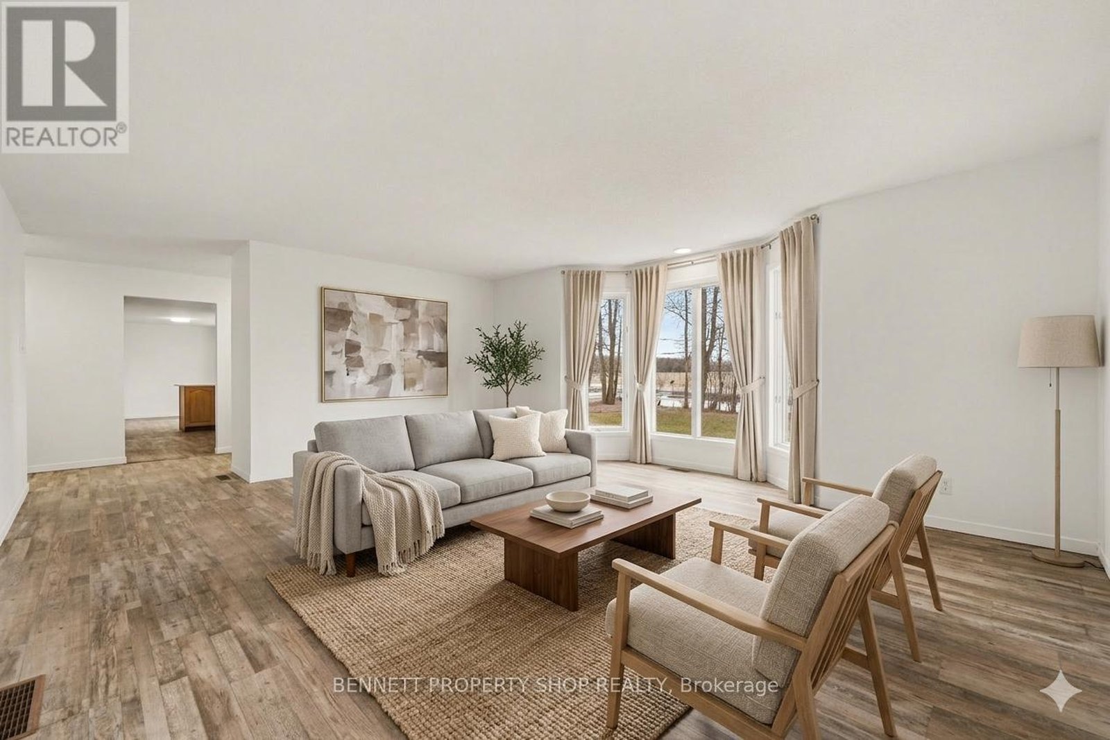 Welcome to your 3 bedroom country home, situated on nearly 1 acre; your own private escape! This bungalow features a large double car garage, newly updated (March 2026) kitchen, bathroom, paint, and lighting, and is surrounded by mature trees with no rear neighbours. Located just 5 minutes from Russell's historic village, parks, schools, and the W.E. Burton Conservation Area for hiking and dog walking, and a short 30-minute drive to downtown Ottawa, this property offers the perfect blend of suburban convenience and peaceful country living. This spacious home also features a large front porch for morning coffee, a bright main floor with a fantastic kitchen offering an abundance of cabinetry for all your storage needs, an adjoining eating area with gorgeous windows overlooking lush greenery. A well prepared lower level is complete with vapour barrier and ready for your personal touches, with a rough-in already in place to add a second bathroom. Don't miss this opportunity! Some photos are digitally enhanced.