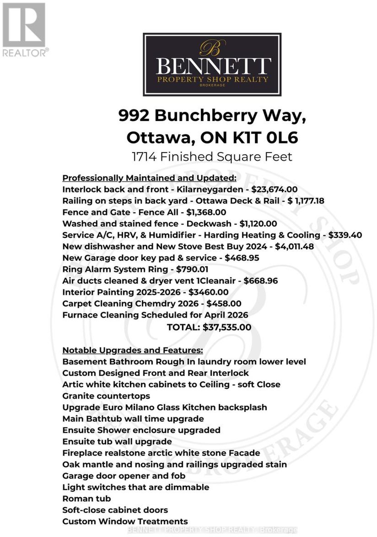 This Wonderful Tartan Built 3 Bed 3 Bath Topaz Model End Unit Townhome has over 1700 sq ft of finished space and is move-in ready in Family Friendly Findlay Creek. A community with expansive greenspace - nature trails, parks, great schools and endless ammenities. This bright and meticulously cared-for home has all the contemporary finishings you would want in a newer home with more in upgrades. Great Curb appeal! At first look you will notice the tasteful interlocked walkway -step professionally designed to expand the parking for 3 cars- 2 side by side on the driveway plus 1 garage parking-inside foyer access. The property is fully fenced with side gate and generous interlock patio with new stairs - railings to access for entertaining and family fun. The main tiled foyer is functional with a large coat closet and 2 piece bathroom. This home is well layed out for maximum interaction with family and friends. Main floor 9 ft ceilings - creates an Airy and Open area with large windows, patio doors and continuous well-presented neutral hardwood floors. Kitchen features Crisp Arctic White Cabinetry that extends to ceiling for an abundance of storage plus Sit up Island. Granite countertops and a stylish, upgraded backsplash complete the look. The Principle bedroom has a generous 4-piece ensuite with upgraded granite countertops, spa soaker tub and glass shower with upgraded tiled wall plus walk in Closet. 2 nicely sized bedrooms with double closets and room to hang out. The shared bathroom with tub and shower is generous with lots of storage. The bright finished lower level has a cozy gas fireplace with realstone facade and oversized EGRESS windows plus a laundry area with rough-in for future bathroom. You will appreciate how well-maintained this home is. Recently Painted, Vents and Ducts cleaned, Carpets cleaned 2026, New Stove & Dishwasher and more. Everything has been regularly serviced. Bring your discerning buyers - they will be impressed. 24 HR Irrevocable Offers