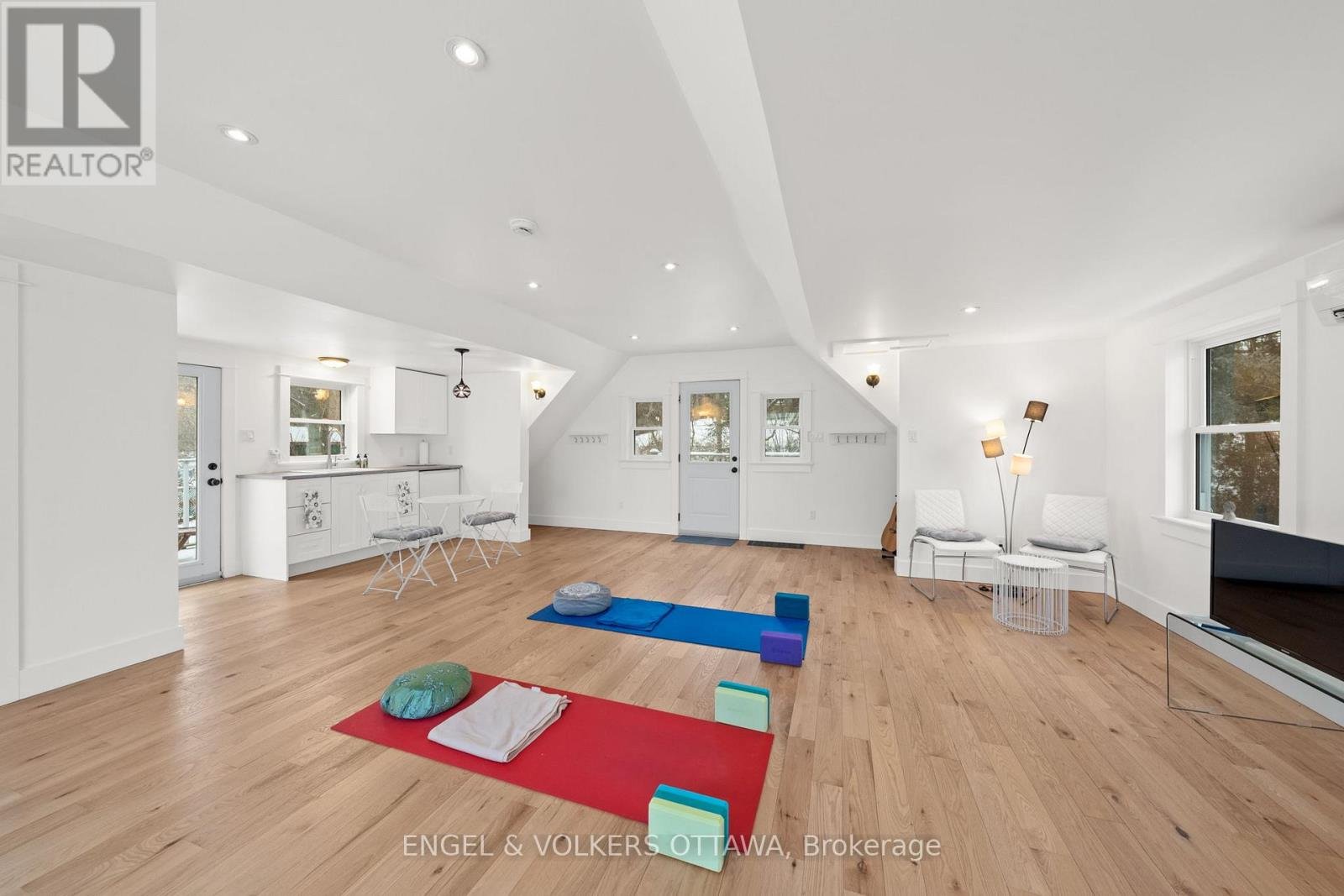 Welcome to this stunning, fully renovated bungalow nestled on the North Island in the charming Village of Manotick - where timeless character meets modern luxury. Set on a professionally landscaped lot, the outdoor space is a true sanctuary. Mature perennial rock gardens, waterfall, mature trees, and a stone patio, this property offers exceptional curb appeal and a truly serene outdoor retreat.The main residence has been thoughtfully reimagined with a well-designed addition that expands the living space without sacrificing warmth or flow. The addition impresses with soaring vaulted ceilings and expansive windows that flood the space with natural light. Step inside to a gracious living area anchored by a classic wood-burning fireplace - the perfect gathering place in every season. The layout has been artfully reconfigured from three bedrooms into an expansive two-bedroom plan, allowing for a truly luxurious primary suite complete with generous double closets. A beautifully appointed new full bath serves the main level, featuring a glass shower, brushed gold fixtures, and a heated towel bar - a spa-like retreat for the whole household.The finished lower level offers incredible versatility with two additional bedrooms, a fully renovated bath, a dedicated home gym, and a workshop.The showpiece of this property is the coach house with oversized, heated double car garage topped by an open concept living area, complete with a kitchenette, three-piece bath, and a charming private balcony - the perfect spot to enjoy your morning coffee overlooking those stunning gardens. Whether envisioned as a yoga or meditation studio, artist's retreat, private home office, or income-generating suite for a tenant or in-law, the possibilities are truly endless.All of this, just steps from the shops, restaurants, and scenic waterways that make Manotick one of Ottawa's most coveted communities. A rare opportunity - move in and make it yours.