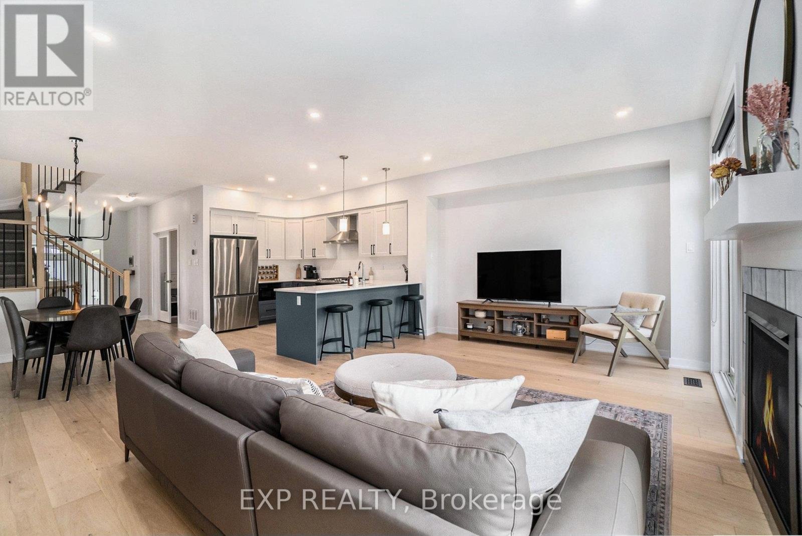 Welcome to this 2022 Richcraft Kenora model, offering over 2,100 sq. ft. of well-designed living space with 3 bedrooms and 2.5 bathrooms, including a custom main floor den not found in the standard model. This home features upgraded hardwood flooring throughout the main floor and second level, along with approximately $40,000 in upgrades. The main floor includes an enclosed office with doors, ideal for working from home, plus an open-concept living and dining area. The kitchen overlooks the backyard with no rear neighbours, providing added privacy. Upstairs offers three spacious bedrooms, a versatile loft space perfect for a second office or lounge, and convenient second-floor laundry. The finished basement includes a rec room for additional living space, along with a large storage area.