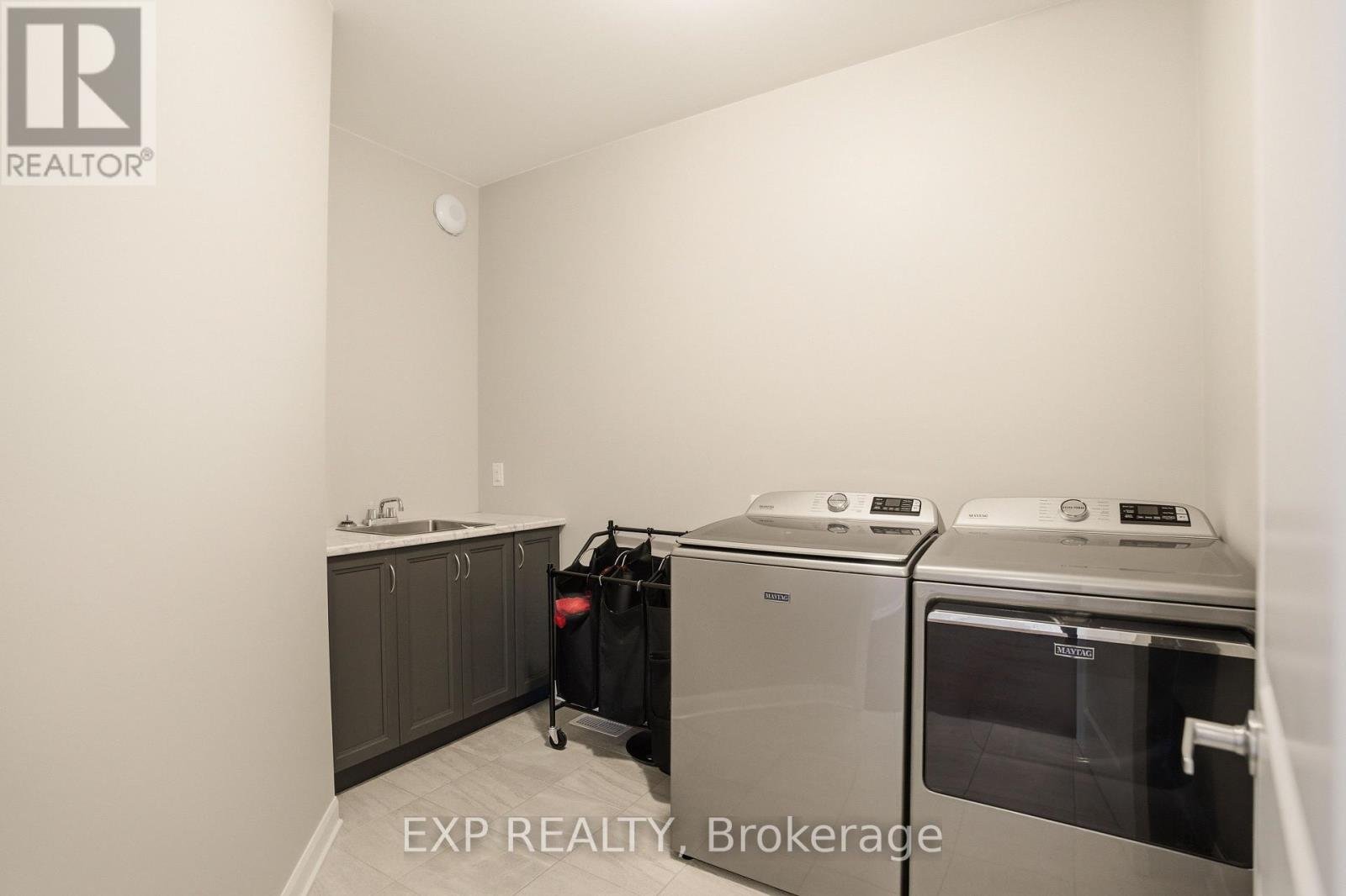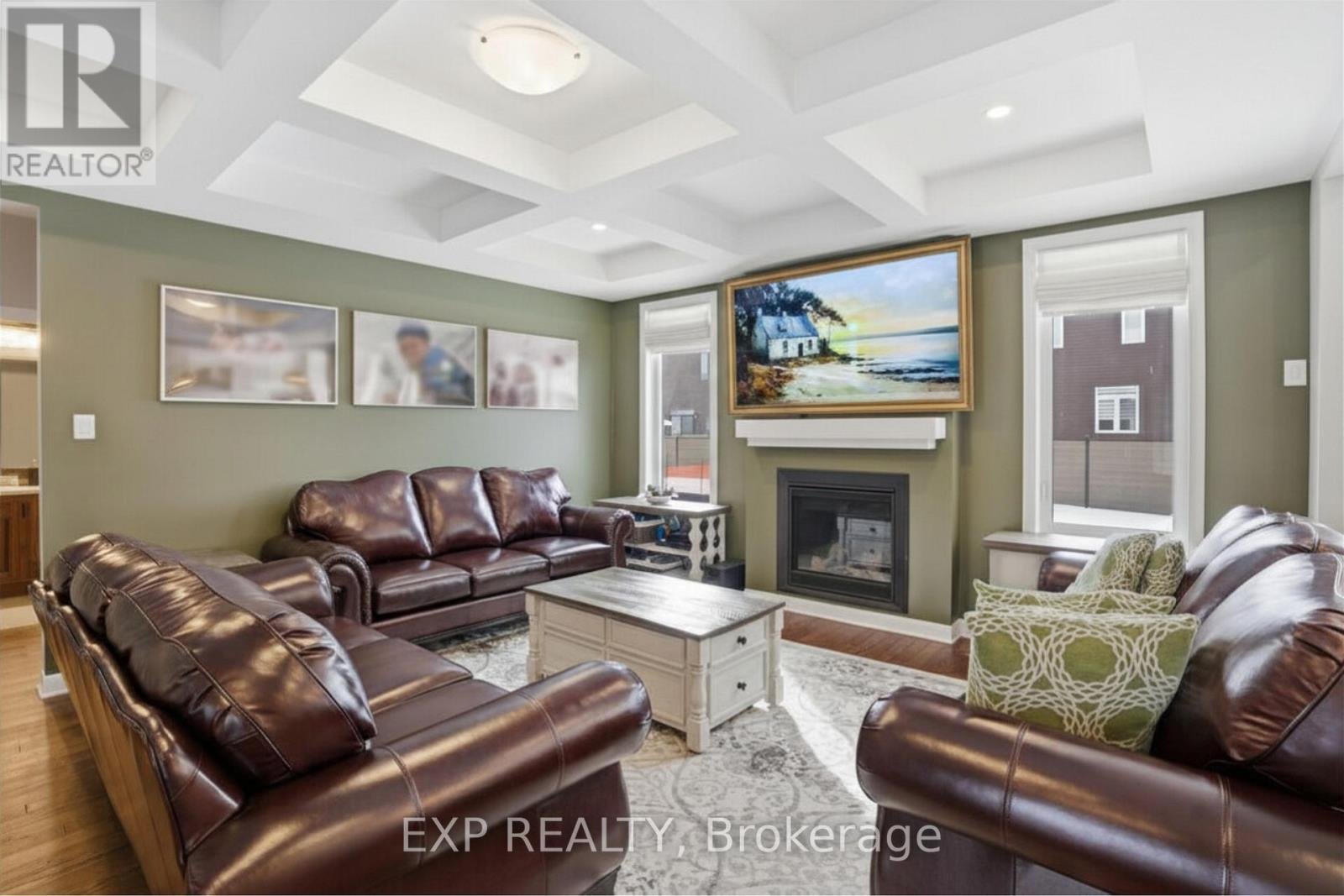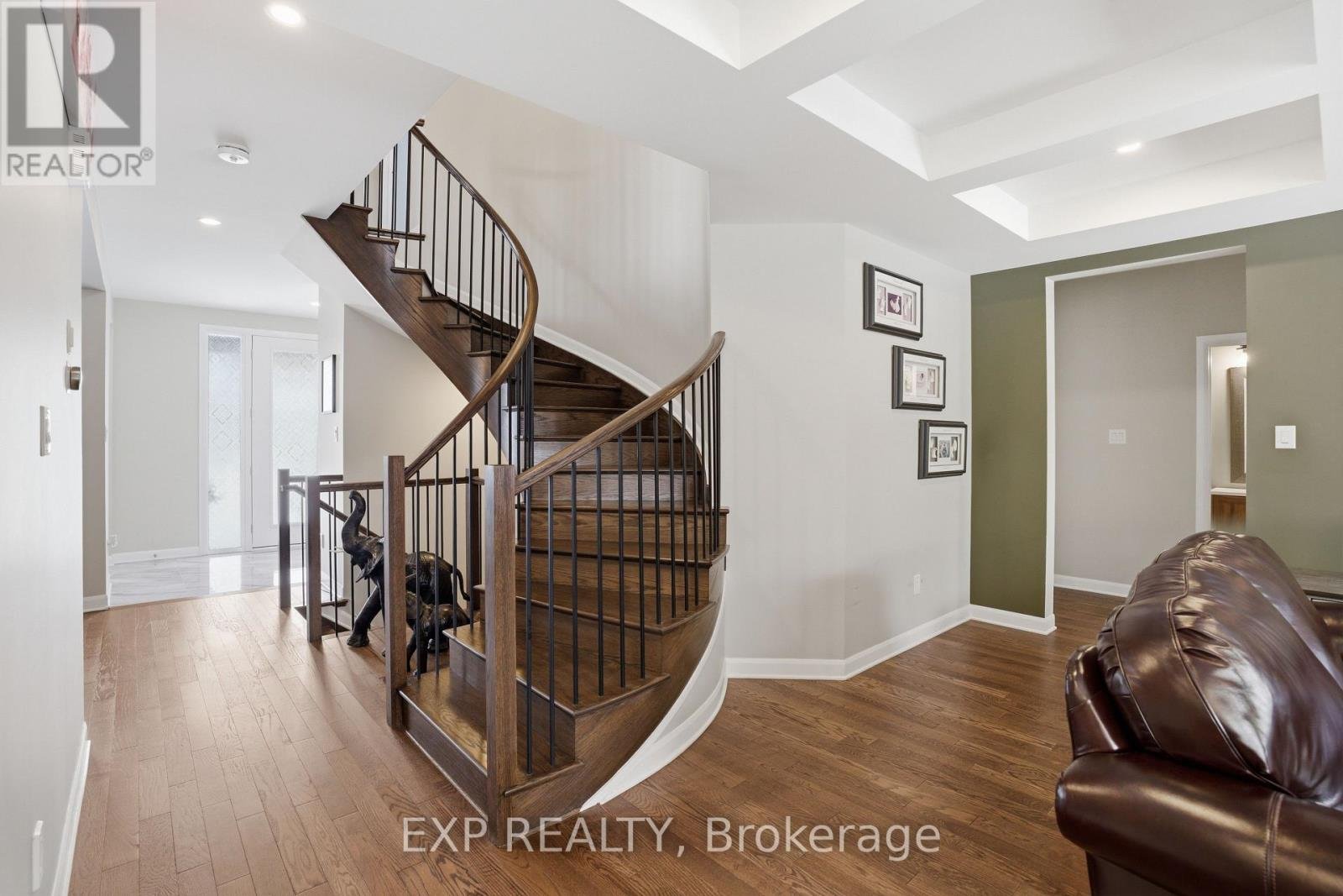 This exceptional Elderberry II model offers approximately 3218 sq ft above grade, plus an additional 1,100 sq ft in the finished basement, with 4 bedrooms, a den, and 5 bathrooms. From the dramatic hardwood spiral staircase and vaulted ceilings to the rare walkthrough kitchen layout, this home offers a beautiful blend of elegance and functionality. With over $200,000 in upgrades, a freshly painted interior, and thoughtfully selected finishes throughout, every detail has been carefully curated. The main level features 9-foot ceilings, a gracious front sitting room, a formal dining area, and a chef's kitchen with top-tier upgrades including a striking waterfall island, oversized sinks, extended cabinetry, custom garbage and recycling drawers, and a walk-in pantry with servery. The kitchen opens to a bright living room with a stunning coffered ceiling. A main-level office or den and an oversized mudroom with a walk-in closet add flexibility and function. Upstairs, you'll find 9-foot ceilings and walk-in closets in every bedroom. The spacious primary suite includes two walk-in closets and a luxurious 5-piece ensuite with a freestanding soaker tub, separate shower, and double sinks. A second oversized bedroom has its own 3-piece ensuite, while the remaining two bedrooms share a Jack-and-Jill 4-piece bath. A large laundry room with sink and cabinet storage adds everyday convenience. The fully finished basement, completed in 2025, adds approximately 1,100 sq ft of living space with pot lights, a wet bar with sink, a full bathroom, and excellent storage. Outside, enjoy a fenced backyard with a gazebo, an oversized 16' x 24' deck, a fully interlocked front yard, double-car garage, 4-car driveway, and exterior lighting on three sides.
