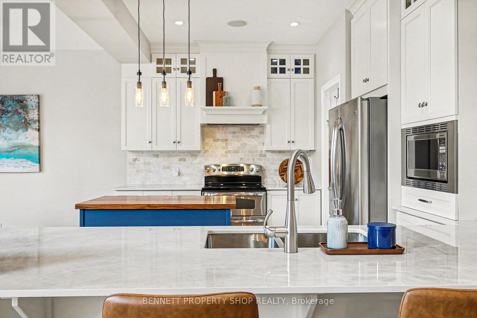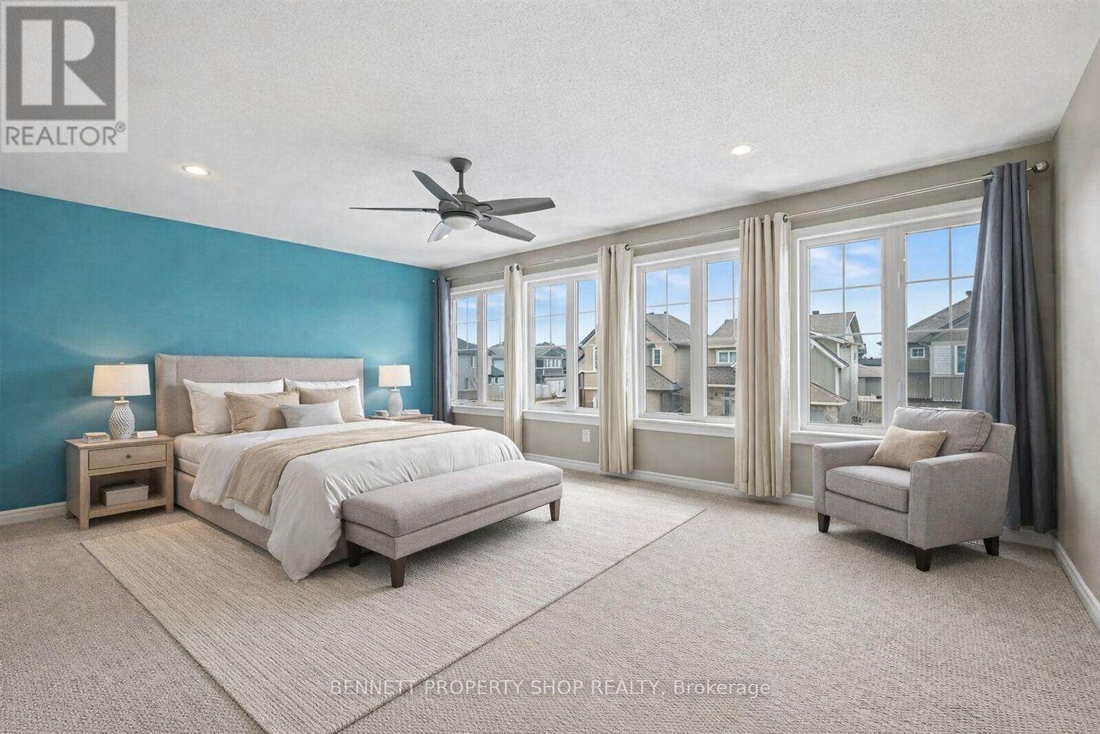 Welcome to this beautifully maintained and extensively upgraded 4-bedroom Cardel home in the highly desirable Blackstone community, ideally located on the Kanata/Stittsville border. Steps to scenic ponds, parks, playgrounds, and walking distance to three new schools, this location offers exceptional convenience and a true family-friendly lifestyle. The popular North Hampton model provides approx. 2,685 sq ft above grade, featuring 9' ceilings, hand-scraped walnut hardwood, and a bright open-concept layout with a spacious great room, gas fireplace, and floor-to-ceiling windows. The showstopping 2024 kitchen renovation includes custom cabinetry, a walk-in pantry, Naturali porcelain countertops by Lamilam, and a striking black walnut island. A main-floor office with French doors and a mudroom with garage access add everyday practicality. Upstairs, enjoy a versatile loft, a laundry room with built-ins, and a generous primary suite with walk-in closet and ensuite. The partially finished basement offers additional space for an office or den. Outside, the fully fenced yard features a deck, gazebo, and in-ground irrigation system, while the front showcases beautiful interlock landscaping for standout curb appeal. A double garage and parking for four complete this exceptional property. Flexible showing times available. Some photos digitally enhanced.