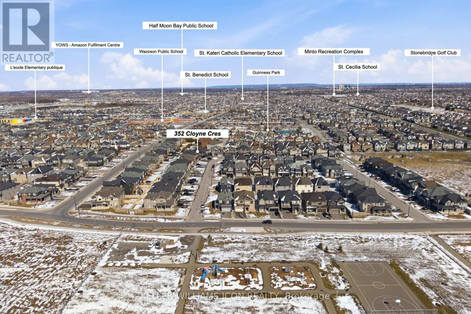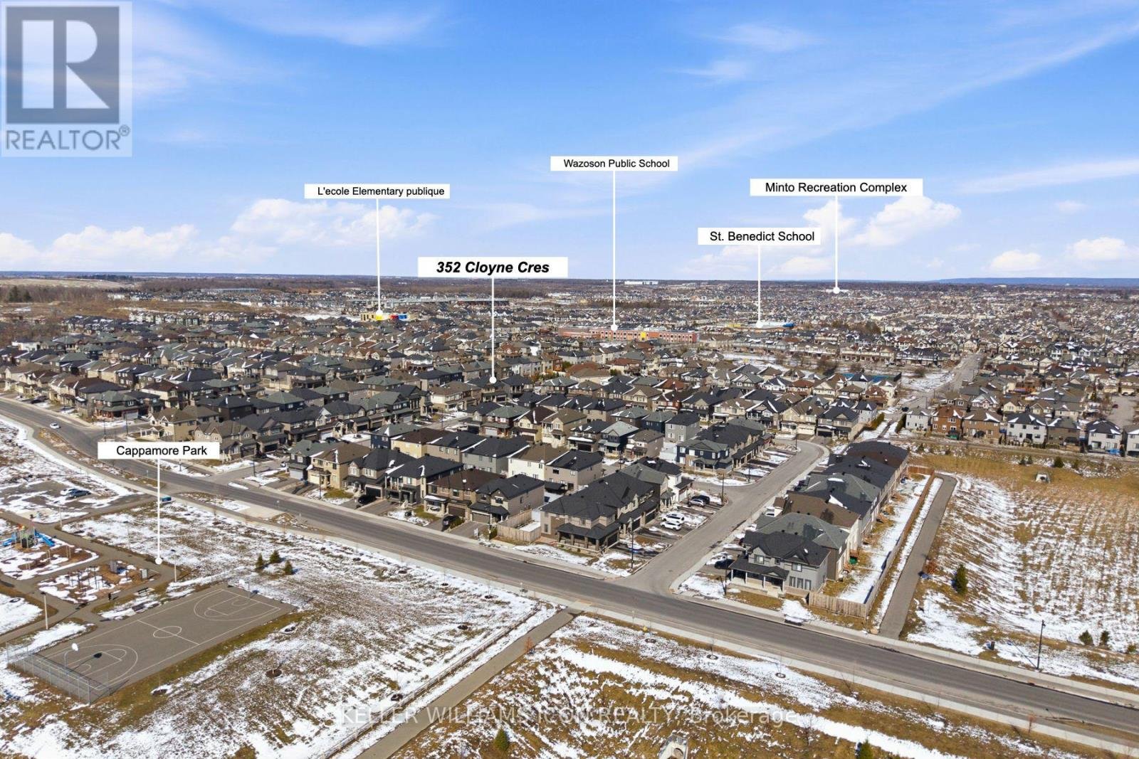 Over $260,000 in Upgrades - Truly Move-In Ready. Welcome to 352 Cloyne with Quinton model & guest suite in sought-after Quinn's Pointe. Offering over 4,000 sq.ft. of living space with 6 bedrooms + den, 5.5 bathrooms, a fully finished basement with full bath, and a fenced & interlocked backyard. Every upgrade is visible, every cost is known, and the closing timeline is clear - zero uncertainty, zero surprises. Situated on a rare, oversized pie-shaped lot, significantly larger than typical lots, fully enclosed with fencing and interlock - a private backyard oasis that most new builds simply can't offer. 9-foot ceilings on both levels and hardwood floors throughout the main and second floors, including the staircase. The main floor is bright and open, with a flexible den that works as a home office or 7th bedroom. The chef-ready kitchen features quartz countertops, upgraded cabinetry, and premium appliances, flowing naturally into the dining and living areas - anchored by a warm fireplace. The main floor ensuite bedroom is a rare bonus, ideal for grandparents, in-laws, or guests needing their own private space. Upstairs, 5 bedrooms and 3 full bathrooms give every family member room to breathe. The primary suite features a large WIC and a spa-style 5-piece ensuite. 2 additional bedrooms share a Jack & Jill bathroom, and every room comfortably fits a queen or king bed. Fully finished basement with full bathroom, a large recreation area, and ample storage - ready to become whatever your family needs. All of this in Quinn's Pointe - a family-friendly neighbourhood minutes from parks, trails, schools, and the Minto Recreation Complex. In today's market, pre-construction comes with real risks - rising prices, long delays, uncertain rebate policies, and unexpected costs. This home removes all of that. A rare opportunity to own a premium home where everything is already done - and done right.