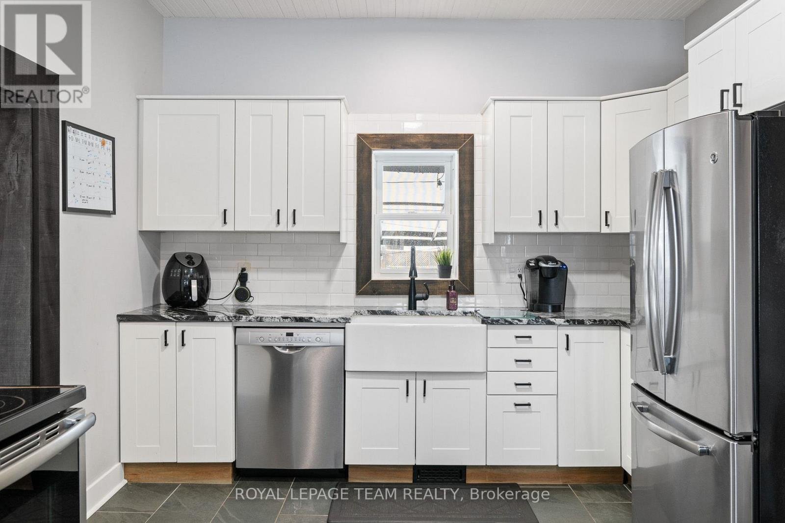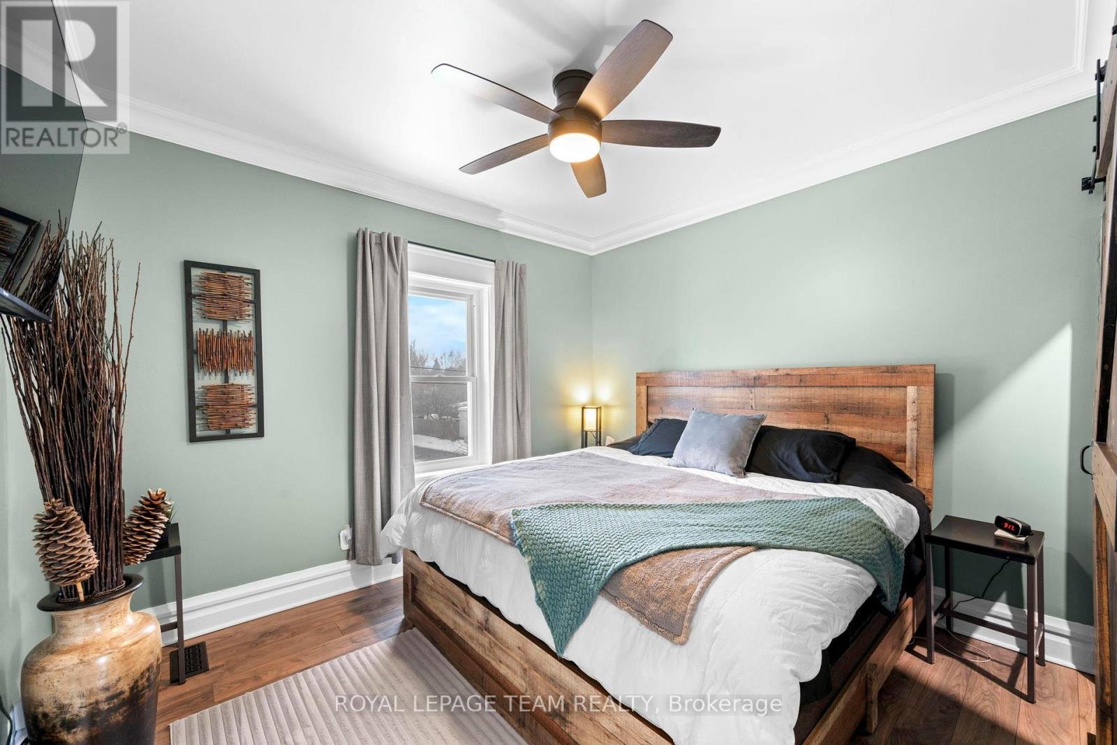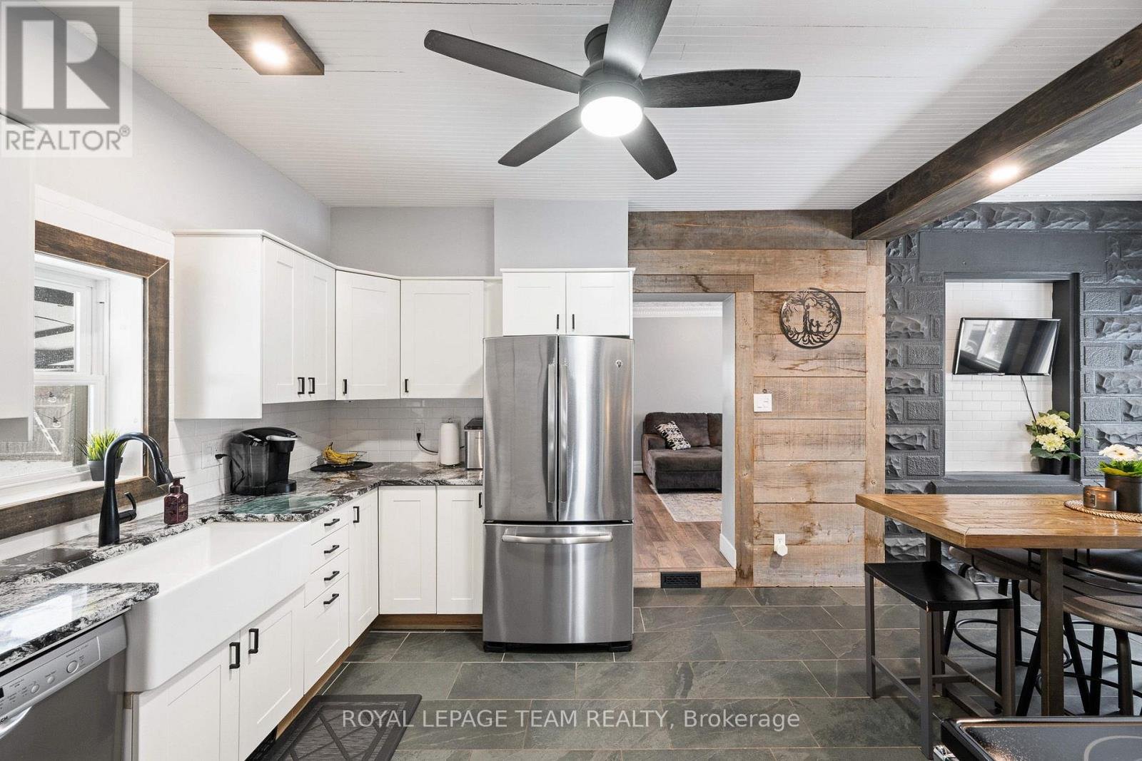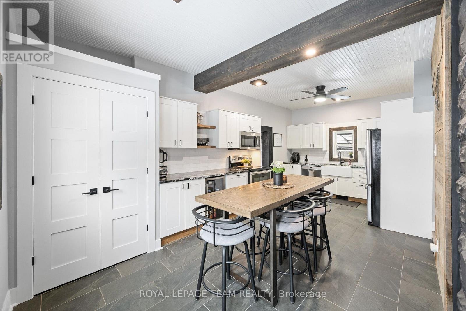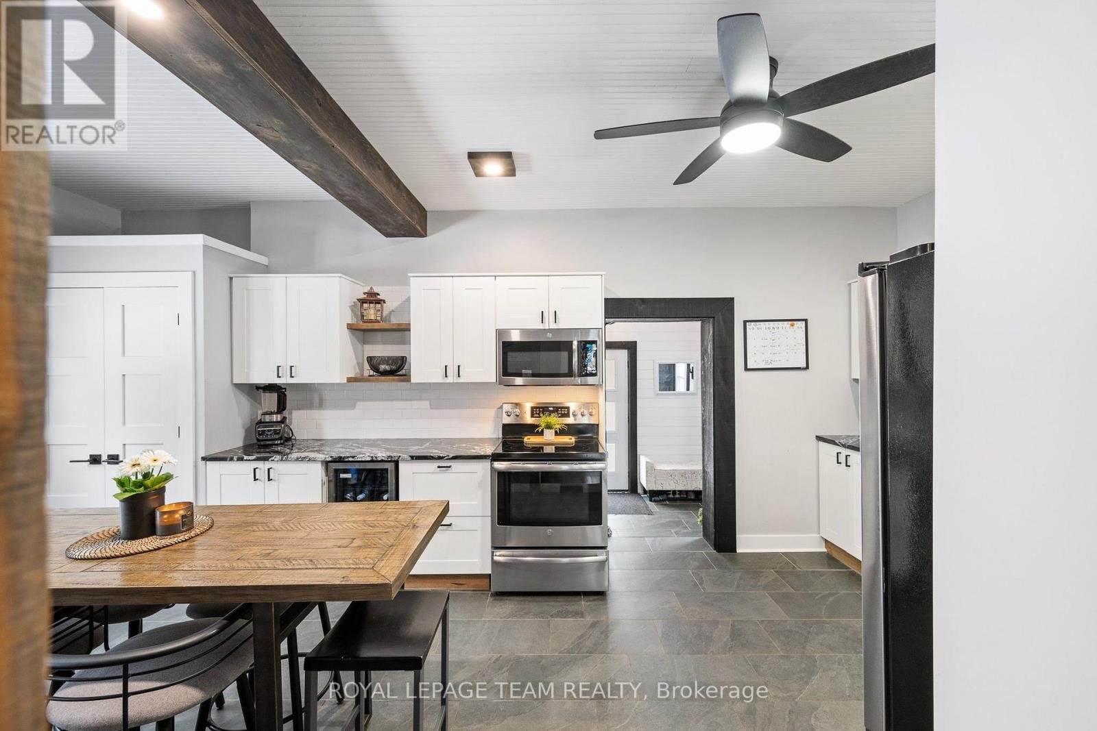 Beautifully renovated home blending modern upgrades with timeless character, ideally situated on a desirable corner lot. Extensive improvements since 2020 include all new flooring throughout, fresh neutral paint, updated lighting, and widened interior doorways with modern 4-panel doors and hardware. The main floor features a fully redesigned kitchen with GE stainless steel appliances, granite countertops, white shaker cabinetry, subway tile backsplash, LED pot lighting, and a 32" farmhouse sink. Original 1920 tin ceilings and crown moulding have been refinished in crisp white, adding charm and character. A convenient mudroom addition off the kitchen offers additional storage and access to the backyard, along with a stylish black steel entry door. Upstairs, the second floor includes a renovated full bathroom with new plumbing, a large porcelain tub with full-height tile surround, new vanity and toilet, plus a custom barn board accent wall. The primary bedroom features a newly created walk-in closet. The third floor offers additional living space with updated laminate flooring. Step outside to enjoy a fully fenced yard with double gate access from the street, perfect for trailers, equipment, or added convenience. A standout feature is the authentic original barn with loft, ideal for a workshop, hobby space, or at-home business setup. Additional updates include armour stone front steps, refinished staircases on all three levels, interior barn doors, updated half bath with full-size stackable laundry and new mechanicals including furnace (2024), hot water tank (2020, gas), air conditioning (2020) and sand point well (2025). Windows were previously updated (approx. 2013). Located within walking distance to the public school, post office, and general store, and just a 2-minute drive to the grocery store, this home offers the perfect blend of small-town convenience and modern living.All measurements as per Iguide Floorplan. Buyer to confirm all room sizes.