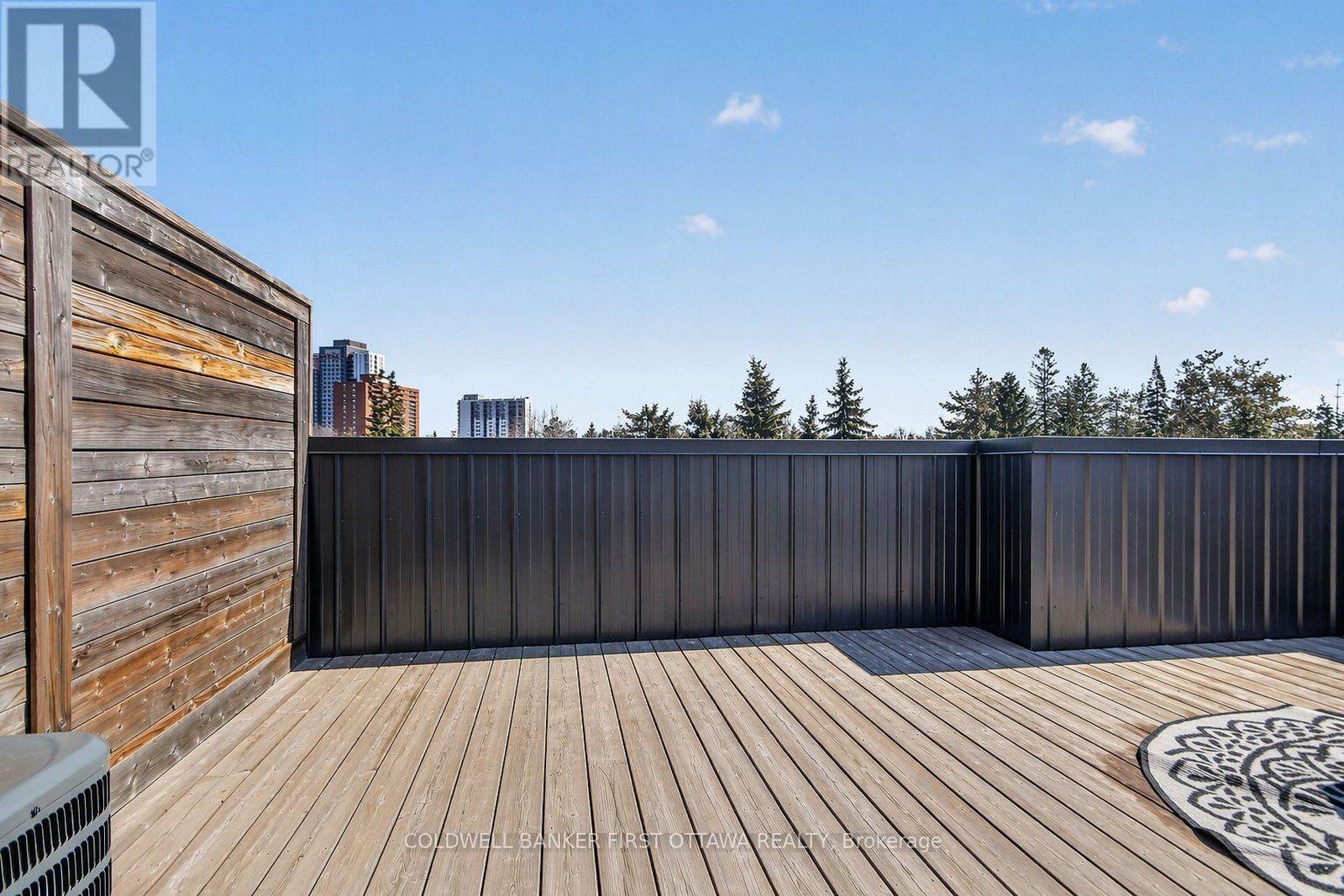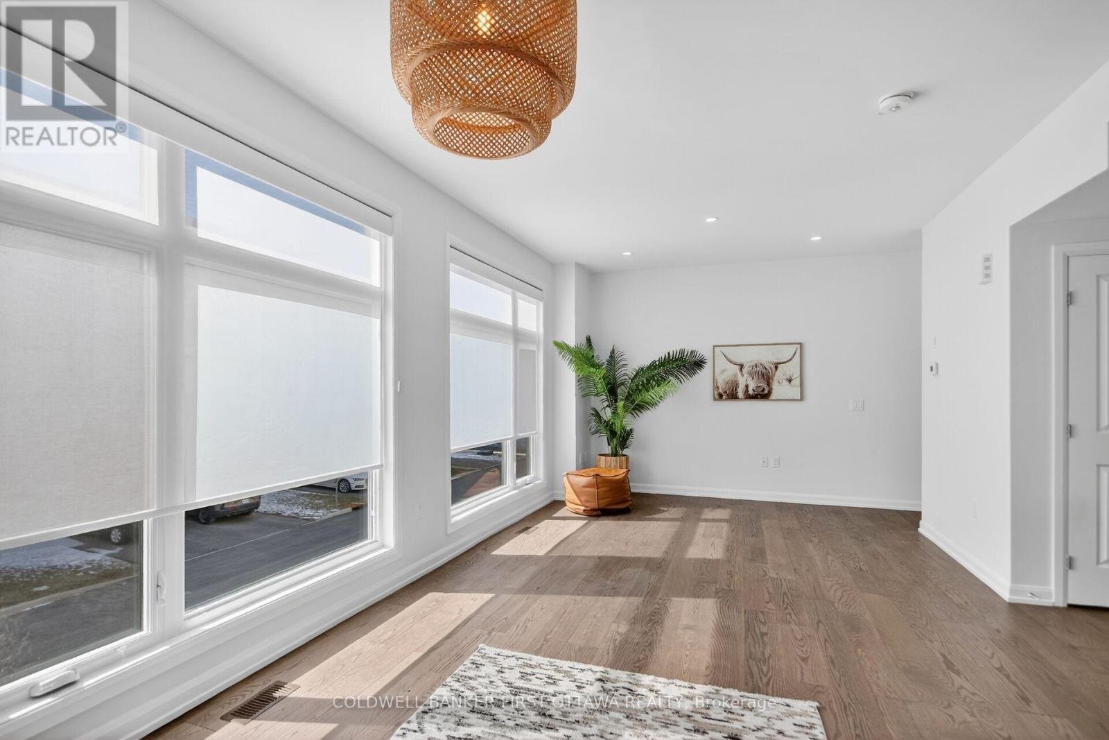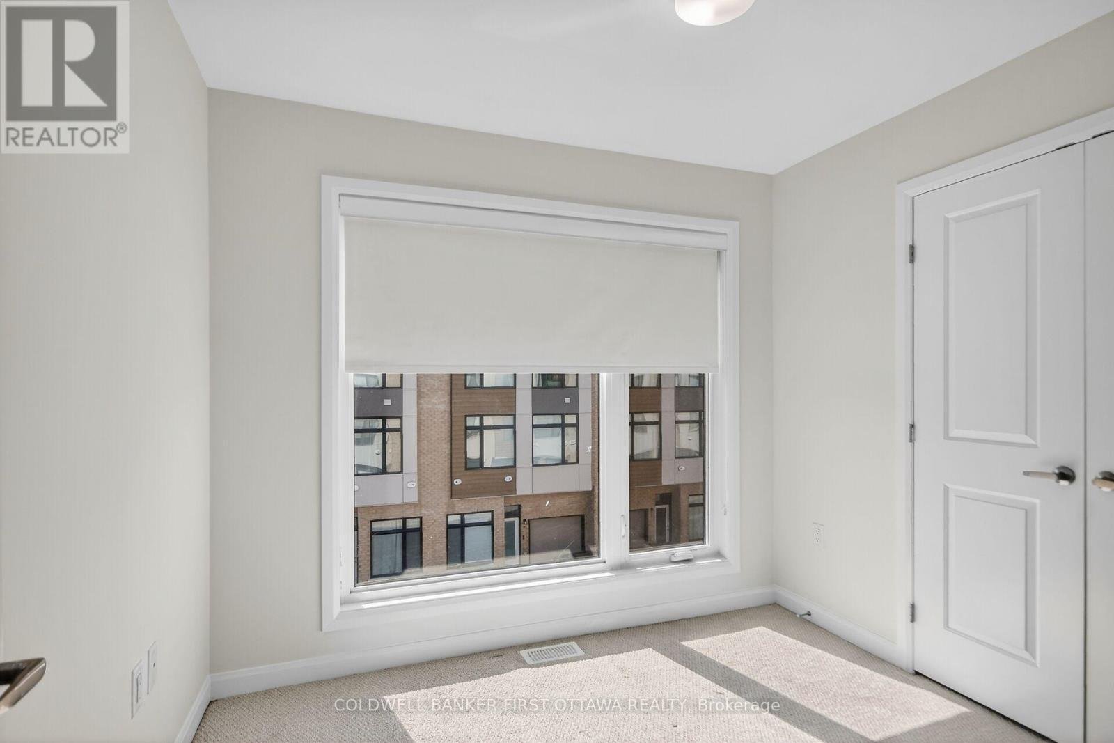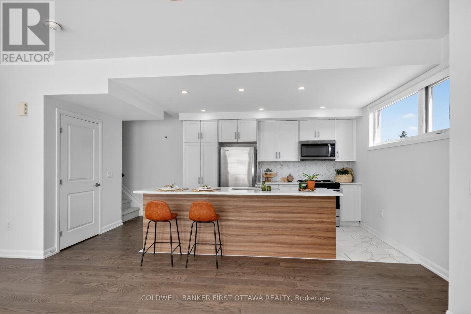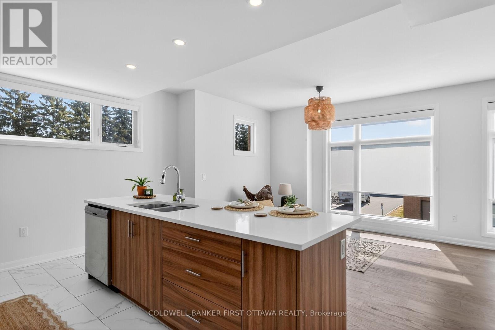 This stunning modern end-unit townhome is filled with natural light and offers an exceptional blend of style, functionality, and urban convenience. Ideally located with effortless access to transit and everyday amenities, it is perfectly suited for contemporary living. The sun-filled interior begins at the entry level with a versatile den-ideal as a home office, fitness space, or cozy retreat and a convenient powder room. Wide-plank hardwood flooring accents the second level, where expansive windows flood the open-concept living and dining area with light, creating a warm and inviting atmosphere. Upgraded automated blinds included. The sleek kitchen is beautifully appointed with stunning countertops, stainless steel appliances, pot lights and designer accent lighting with a large island-perfect for entertaining, casual dining, and gathering with family and friends. Upstairs, three well-proportioned bedrooms provide flexible living arrangements, including a primary suite complete with its own private ensuite bath. A standout feature of this home is the fantastic private rooftop terrace-an ideal extension of your living space. Enjoy sweeping views, all-day sun, and the perfect setting for entertaining, relaxing, or unwinding under the stars. Located in a highly desirable neighbourhood close to Algonquin College, Britannia Beach, Queensway Carleton Hospital, and Highways 416 and 417. Home was freshly painted 2026. Monthly Assoc Fee $121.71 Move right in and enjoy your summer!