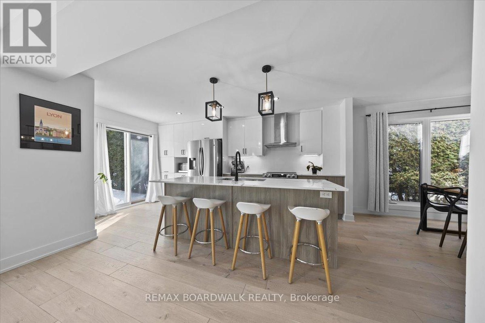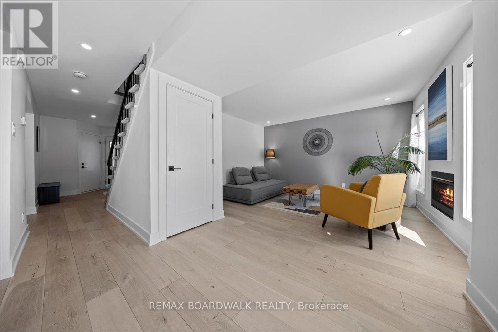 Welcome to a thoughtfully updated home blending classic architecture with refined modern interiors. The brick facade is complemented by black trimmed windows and an upgraded front entry, creating a strong exterior presence. An interlock walkway leads to a covered veranda, while the extended driveway accommodates parking in addition to the garage w EV charger. Inside, a bright foyer introduces wide plank 5" luxury flooring, flat ceilings, and clean baseboards throughout the main level. A staircase with wrought iron spindles creates a striking architectural feature. Main floor room offers flexibility as a home office or additional living space. The open concept layout connects the kitchen, dining, and living areas, designed for both everyday living and entertaining. Expansive windows and dual garden doors bring in natural light and lead to the backyard. The dining area is highlighted by statement lighting, while the living room offers space to unwind. The kitchen features quartz countertops, an extended island with seating for 4, SS appliances, fluted hood fan, wall pantry, and pendant lighting. White cabinetry with matte black hardware adds a clean contemporary contrast. The 2nd level offers 4 great sized bedrooms, updated bathrooms, and a dedicated laundry area. The primary suite features 5 windows, a walk in closet, and a 5 pce ensuite with oversized tile, double vanity w quartz counters, glass shower, and deep soaker tub under a window. A bay window enhances the largest secondary bedroom. The finished basement adds a spacious rec room with pot lights, flat ceilings, and a flex room for gym, office, or play space. The backyard is bordered by mature hedges for privacy and includes a patio stone area with open green space. Located in an established neighbourhood with quick access to HWY, transit, parks, FR + EN Schools, groceries, library, etc. 24 Hour Irrevocable on offers
