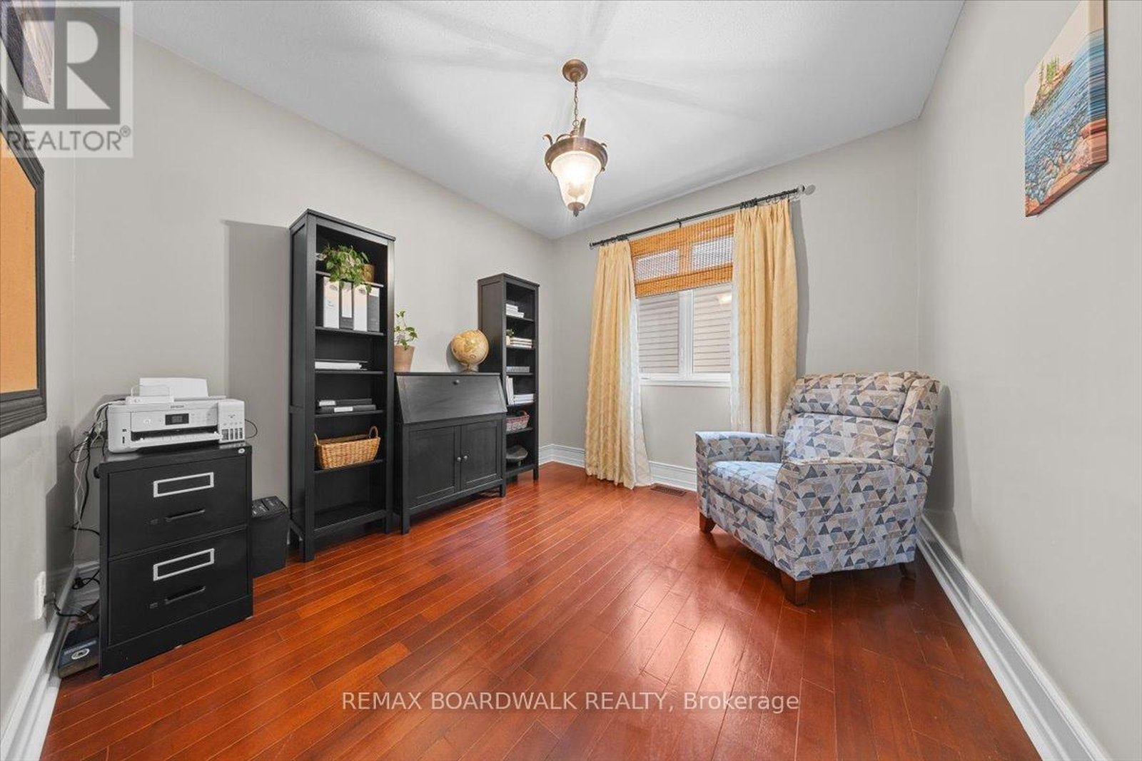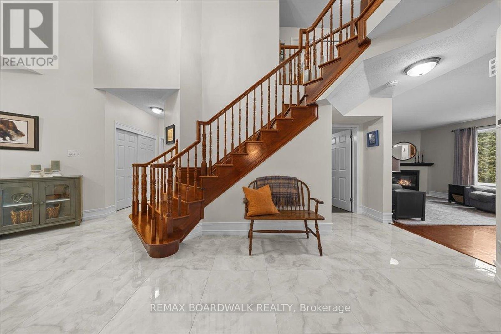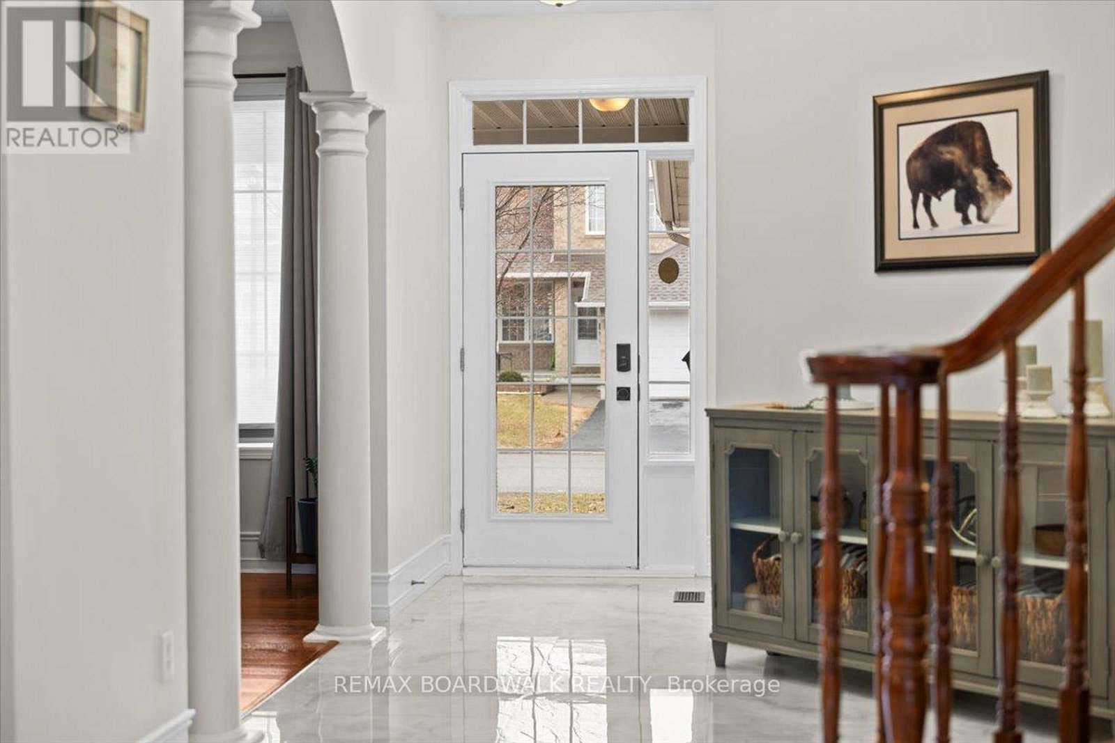 Positioned on a quiet interior street, this detached 4 bedroom home w/main floor den is defined by a balanced twin roof peaks, a covered front veranda, taupe brick front exterior, interlock walkway, & double car garage. The front entrance is highlighted by front door w/transom, opening to a two-storey high foyer w/oversized tile, hardwood flooring, high baseboards, & a circular staircase. Architectural detailing continues into the formal living room, introduced through a curved archway w/Roman columns, 9' high ceilings, & a full-height picture window. The open dining area connects seamlessly to a redesigned centre island kitchen featuring granite countertops, extended breakfast bar, multiple drawers, 24" deep pantry, horizontal tile backsplash, glass accent cabinetry, upper mouldings, & a recessed 3/4 split sink. The adjoining eating area is framed by a three-panel patio door w/transom, enhancing natural light & outdoor living connection.The family room is anchored by a corner fireplace, w/an adjacent main floor den/office offering functional flexibility. A two-piece powder room & laundry room w/overhead cabinetry complete the main level. The upper level presents hardwood throughout the landing, a primary suite w/multiple windows, front window seat, sitting area, double closet including walk-in, & a renovated ensuite w/moulded soaker tub, quartz topped vanity, glass shower, & oversized tile. Three additional bedrooms offer generous proportions & ample storage. The main bath features a raised sink & vanity.The lower level includes a finished recreation room w/pot lighting & wide plank flooring, storage area, rough-in for future bathroom, & a hobby room w/oversized window accessed through twin doors. Additional features include inside access to the garage. The private rear yard offers western exposure, stone patio, PVC fencing, & hot tub, 24 hour irrevocable on all offers.