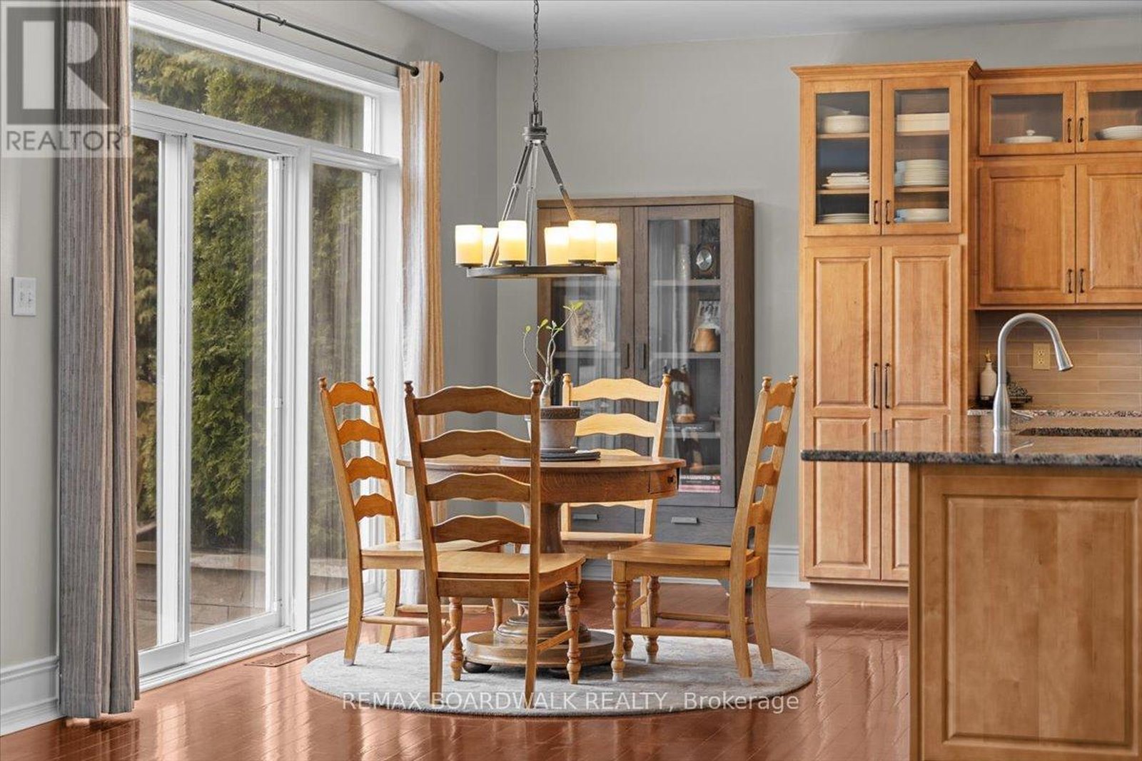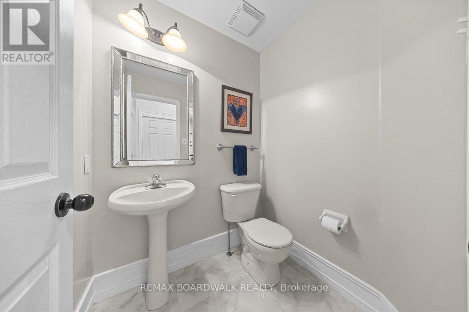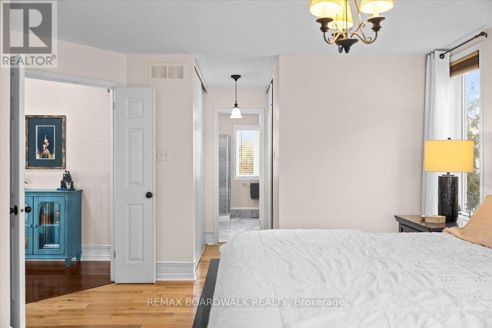 Positioned on a quiet interior street, this detached 4 bedroom home w/main floor den is defined by a balanced twin roof peaks, a covered front veranda, taupe brick front exterior, interlock walkway, & double car garage. The front entrance is highlighted by front door w/transom, opening to a two-storey high foyer w/oversized tile, hardwood flooring, high baseboards, & a circular staircase. Architectural detailing continues into the formal living room, introduced through a curved archway w/Roman columns, 9' high ceilings, & a full-height picture window. The open dining area connects seamlessly to a redesigned centre island kitchen featuring granite countertops, extended breakfast bar, multiple drawers, 24" deep pantry, horizontal tile backsplash, glass accent cabinetry, upper mouldings, & a recessed 3/4 split sink. The adjoining eating area is framed by a three-panel patio door w/transom, enhancing natural light & outdoor living connection.The family room is anchored by a corner fireplace, w/an adjacent main floor den/office offering functional flexibility. A two-piece powder room & laundry room w/overhead cabinetry complete the main level. The upper level presents hardwood throughout the landing, a primary suite w/multiple windows, front window seat, sitting area, double closet including walk-in, & a renovated ensuite w/moulded soaker tub, quartz topped vanity, glass shower, & oversized tile. Three additional bedrooms offer generous proportions & ample storage. The main bath features a raised sink & vanity.The lower level includes a finished recreation room w/pot lighting & wide plank flooring, storage area, rough-in for future bathroom, & a hobby room w/oversized window accessed through twin doors. Additional features include inside access to the garage. The private rear yard offers western exposure, stone patio, PVC fencing, & hot tub, 24 hour irrevocable on all offers.