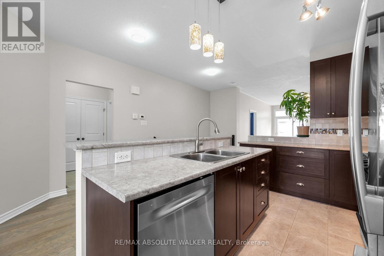 Welcome to 261 Bulrush Crescent, a well-maintained bungalow in the highly sought-after adult lifestyle community of Findlay Creek, offering low-maintenance living with convenient access to nearby amenities. The main level features a bright, open-concept layout with 9-foot ceilings and a seamless flow between the kitchen, living, and dining areas, highlighted by a gas fireplace with stone detailing. The kitchen includes a functional breakfast bar, eating area, and a brand new dishwasher, while the primary bedroom offers a walk-in closet and a private 4-piece ensuite. The finished basement extends the living space with a spacious recreation room, an additional bedroom or home office, a full bathroom, and ample storage. Recent updates include new hardwood flooring on the main level (2024), updated carpeting on the stairs (2024), luxury vinyl tile in the basement (2024), and freshly painted (2026), along with added security features on windows and doors. Outside, enjoy a west-facing backyard and a welcoming front verandah, completing this turnkey home in a well-established and desirable community.