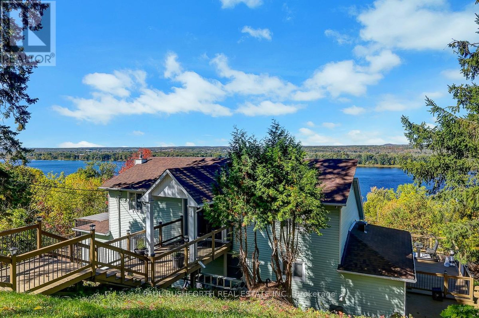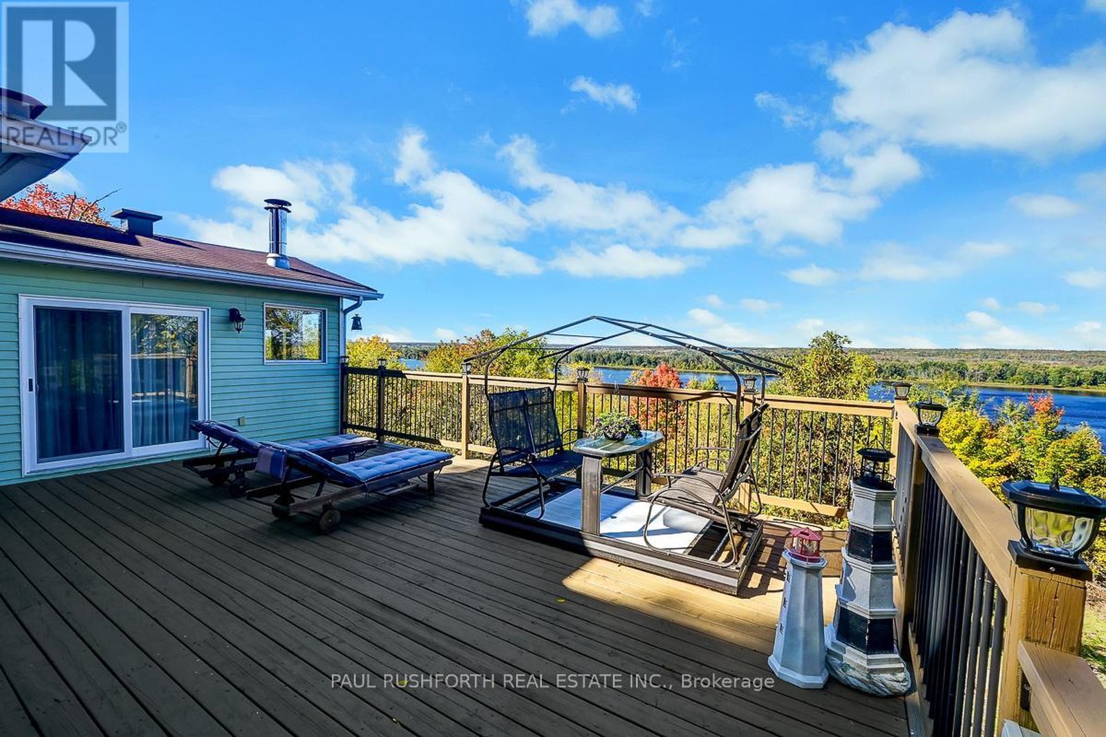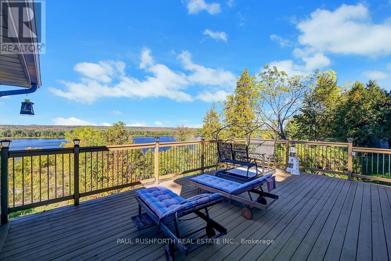 Absolutely one of a kind property on a 1.73 acre lot with unbelievable views of the Ottawa river and Gatineau hills. This unique home offers an open layout with a loads of function including a kitchen that offers lots of cabinet and counter space with a handy breakfast bar, quartz counters and stainless appliances overlooking the expansive living and dining room that can accommodate any sized table and features a gas fireplace, a sunroom with wood burning stove and incredible views, a family room, a den/library, a newly renovated full bath and laundry room. The upper level boasts three large bedrooms, a large foyer and a stunning brand new full bath with walk in glass shower, dual sinks with lighted/fog free mirrors and a giant soaker tub. With mostly hardwood throughout the house, brand new fridge, dishwasher and microwave, ultra quiet windows, fresh paint and new carpets and boasting a large deck on the east side and a deck with gazebo on the west side, two storage sheds, an oversized detached insulated and heated garage all on a huge private lot with a park nearby and just minutes to town this is one of those homes you just have to see to believe. Some photos have been virtually staged.