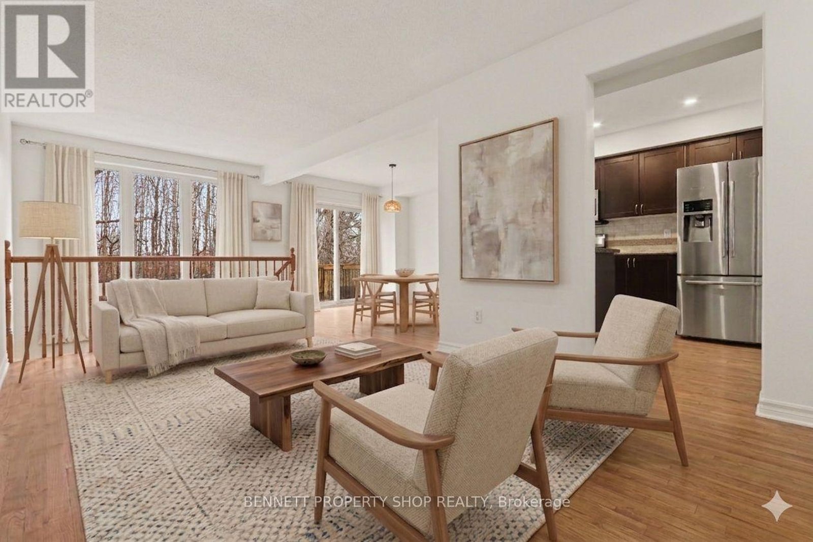 With unbeatable access to every daily convenience, this end unit townhome delivers the space, comfort, and privacy families look for. Hardwood floors, a separate dining room, and multiple living areas create a layout that adapts effortlessly to busy routines and gatherings alike. Upstairs, three generous bedrooms include a spacious primary suite with a 4-piece ensuite and walk-in closet, plus a dedicated laundry room for true day-to-day ease. An impressive upper-level family room with vaulted ceilings and a gas fireplace adds a dramatic, light-filled retreat perfect for relaxing or entertaining. With three distinct living spaces, the home offers exceptional flexibility: a welcoming main floor living area, the striking upper level family room, and a fully finished lower level rec room ideal for a home theatre, games room, or hobby zone. Step outside to a large deck overlooking a private, treed backdrop with no rear neighbours-a rare, peaceful outdoor escape. Close to shopping, schools, parks, trails and public transit, this home blends comfort, privacy, and convenience in one standout package. Recent updates include New Carpet on stairs, paint and LED lighting throughout (April 2026). Some photos are digitally enhanced.