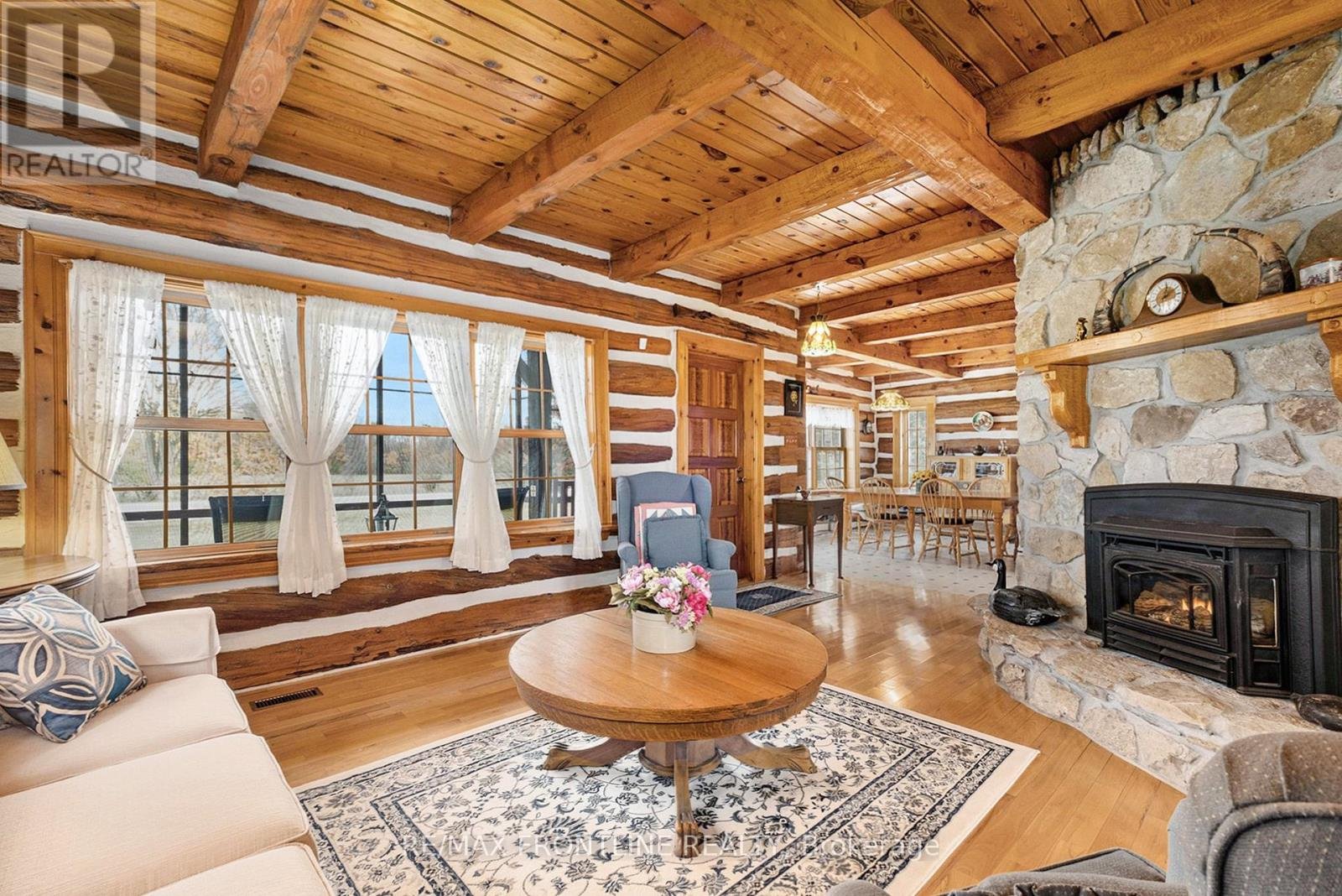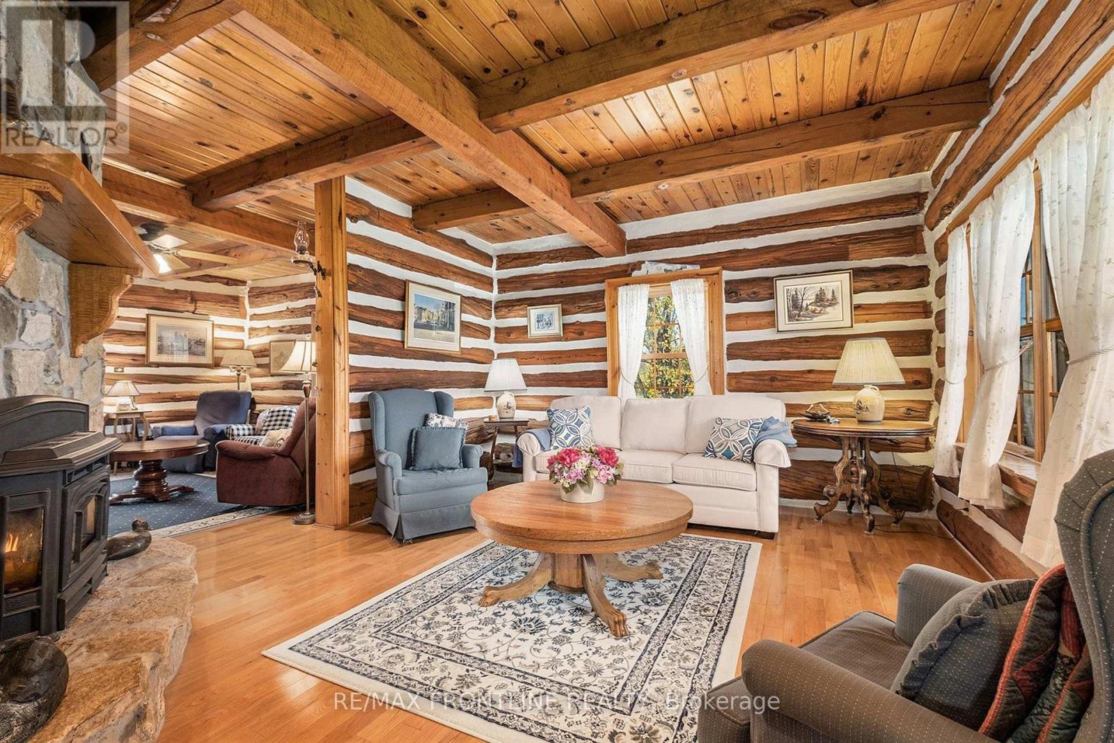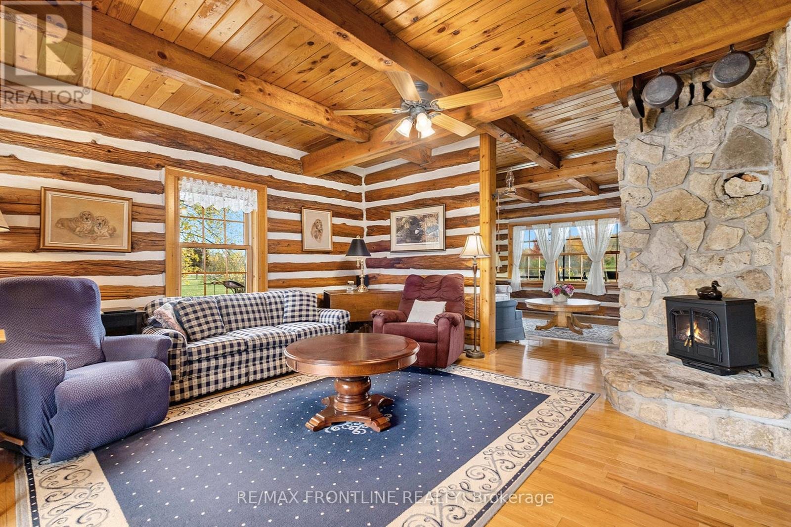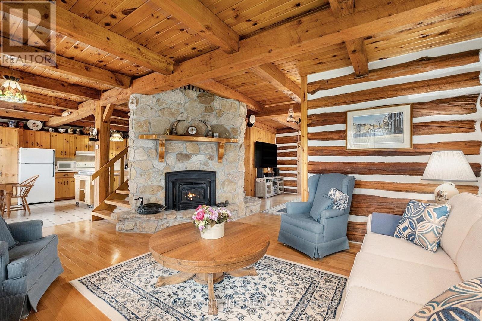 Welcome to one of the area's most admired homes. This stunning, custom-built log residence is a true showpiece, offering timeless character, exceptional craftsmanship, and unmatched charm throughout. Mins. to Upper Beveridges locks boat launch.Featuring 3 spacious bedrooms and 2 charming bathrooms, this home is defined by its incredible attention to detail, highlighted by exquisite, hand-crafted stonework that creates a warm and inviting atmosphere unlike any other. Designed for both everyday living and unforgettable entertaining, the property offers a seamless blend of indoor comfort and outdoor luxury. Enjoy your own private retreat with an in-ground salt water pool, a hot tub, dry or steam sauna, and a sun-filled 3-season solarium-perfect for relaxing in every season. Set on a beautifully maintained lot with a paved laneway, the property also includes a detached garage with exciting future development potential above, ideal for a guest suite, studio, or additional living space.Located in a highly desirable area, this is a rare opportunity to own a truly special home that is both well-known and deeply admired within the community. A one-of-a-kind property where craftsmanship, character, and lifestyle come together. This home is a must see!!