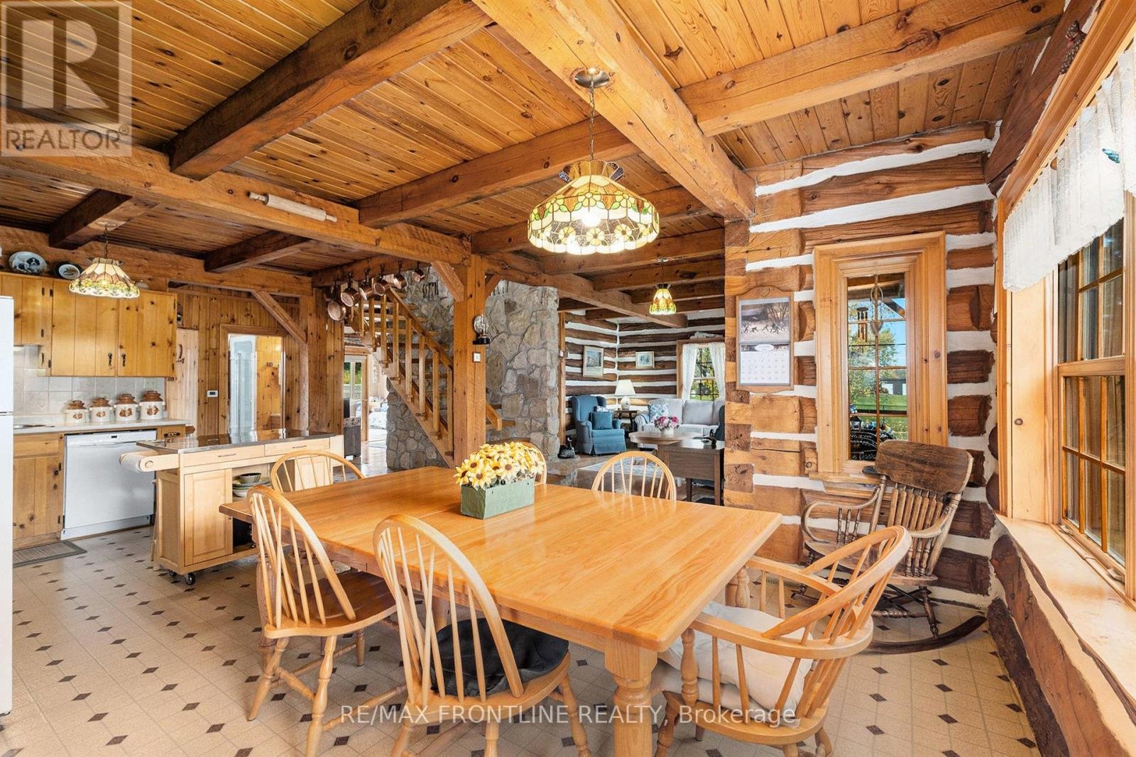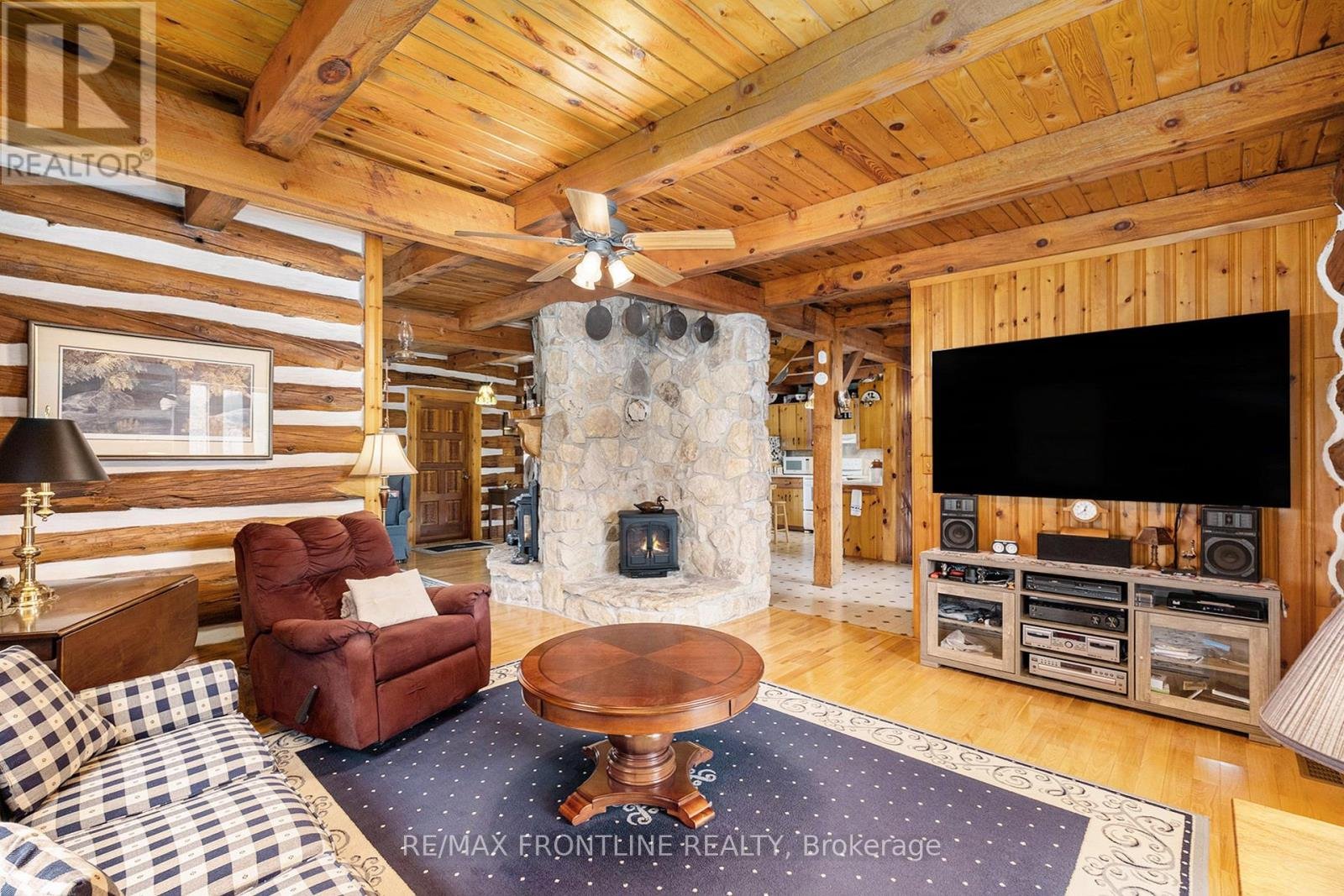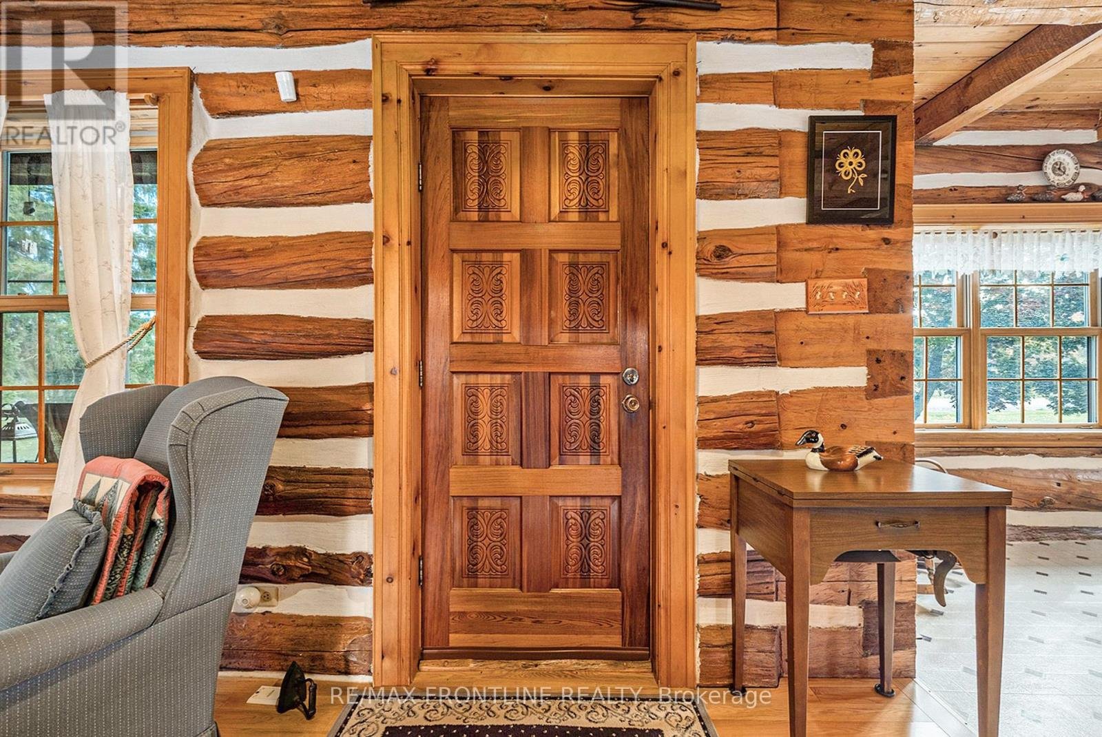 Welcome to one of the area's most admired homes. This stunning, custom-built log residence is a true showpiece, offering timeless character, exceptional craftsmanship, and unmatched charm throughout. Mins. to Upper Beveridges locks boat launch.Featuring 3 spacious bedrooms and 2 charming bathrooms, this home is defined by its incredible attention to detail, highlighted by exquisite, hand-crafted stonework that creates a warm and inviting atmosphere unlike any other. Designed for both everyday living and unforgettable entertaining, the property offers a seamless blend of indoor comfort and outdoor luxury. Enjoy your own private retreat with an in-ground salt water pool, a hot tub, dry or steam sauna, and a sun-filled 3-season solarium-perfect for relaxing in every season. Set on a beautifully maintained lot with a paved laneway, the property also includes a detached garage with exciting future development potential above, ideal for a guest suite, studio, or additional living space.Located in a highly desirable area, this is a rare opportunity to own a truly special home that is both well-known and deeply admired within the community. A one-of-a-kind property where craftsmanship, character, and lifestyle come together. This home is a must see!!