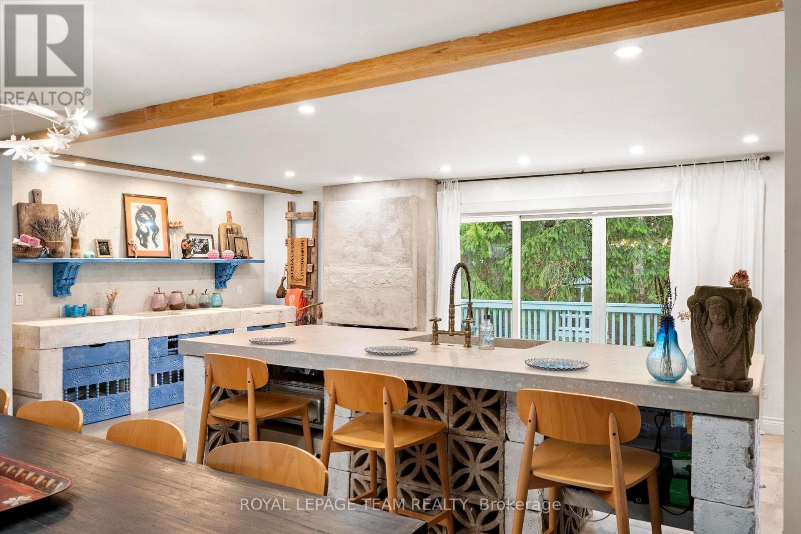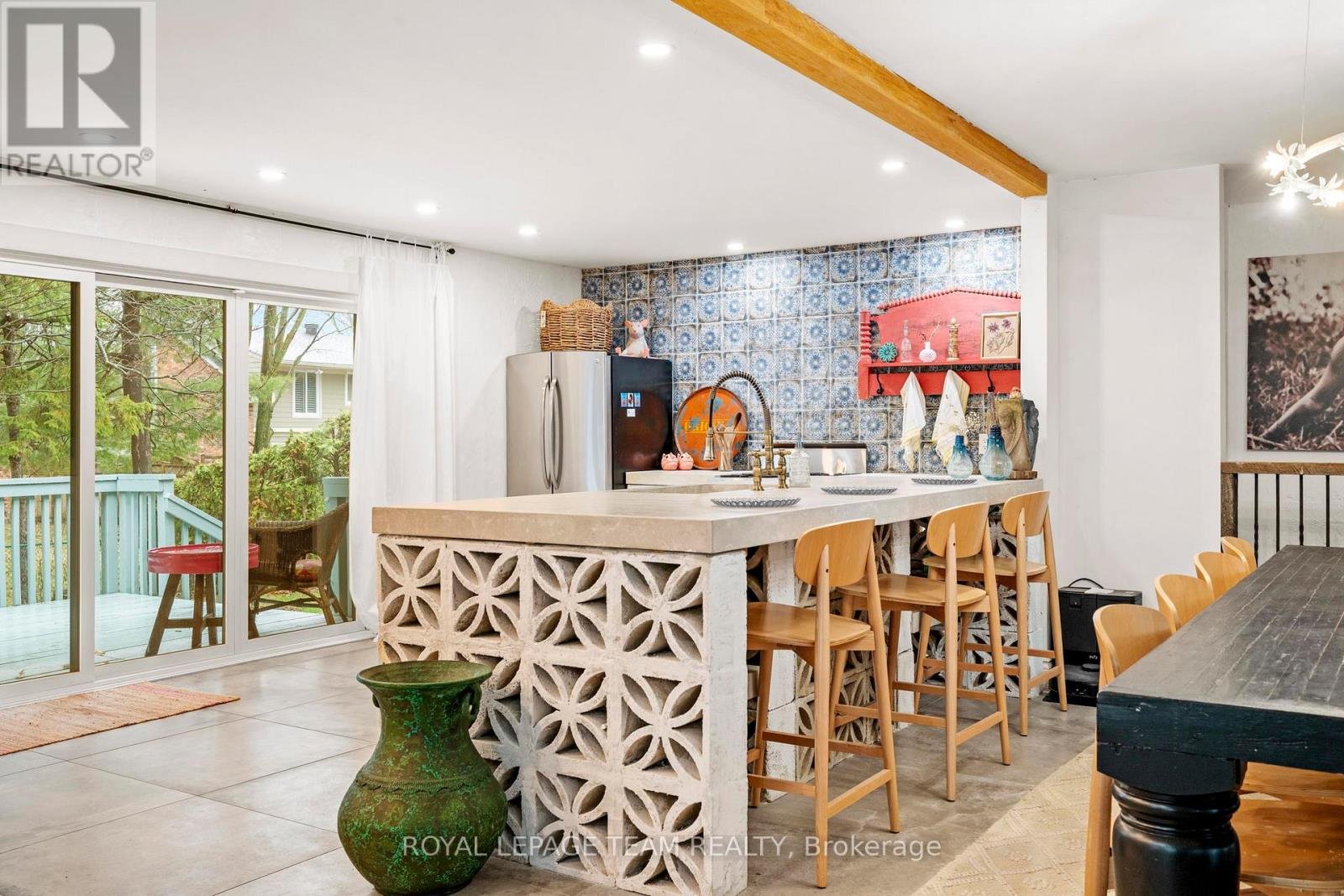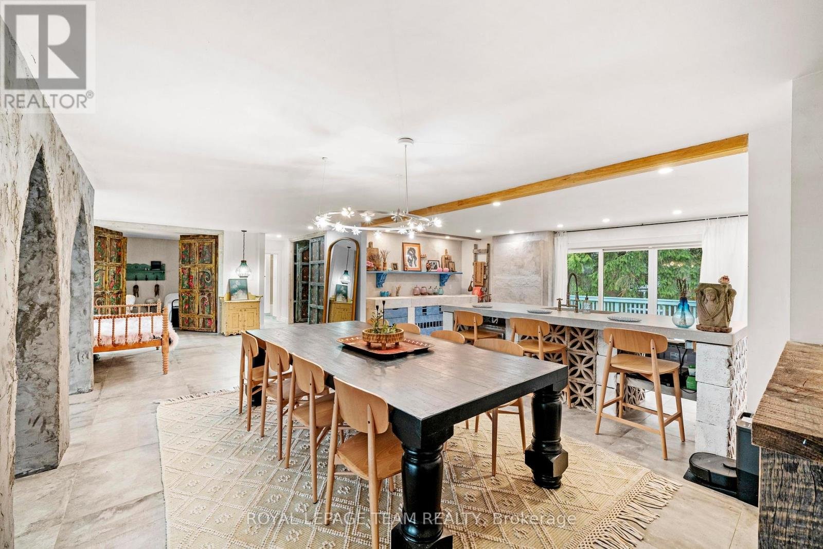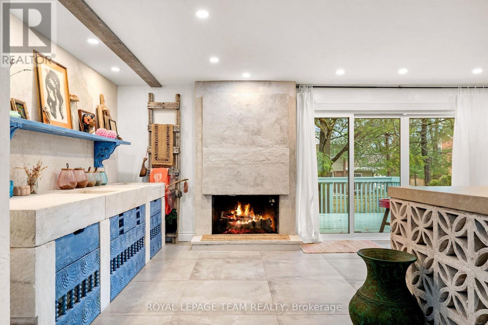 Experience a globally-inspired design with this extraordinary 1800 sq ft, 3-bedroom bungalow, where bohemian elegance meets modern architectural flair. This home is a curated sanctuary, featuring premium finishes including imported French porcelain ceramic flooring that flows seamlessly through the expansive, open-concept layout. Step in to the heart of the home; a sun-drenched great room addition (2010) anchored by a soaring floor-to-ceiling stone gas fireplace and cathedral ceiling with exposed timber beam. Outside this space, the private courtyard patio offers an intimate escape, featuring rugged flagstone and raised garden beds, perfect for morning coffee or relaxation in nature. Dramatic, hand-textured grey archways create a stunning transition from the great room into the formal dining space and gourmet kitchen, which centers around a massive concrete-topped island with intricate geometric breeze-block detailing. Custom Mediterranean-blue cabinetry and a professional-grade stainless steel range make this a true chef's retreat. Dine outside on the deck while your animal companions frolick in the fully fenced back yard. Both main floor bedrooms offer a world-class aesthetic, headlined by breathtaking hand-carved palace doors imported from India. In the primary suite, complete with 2 pce powder room, these masterpieces serve as a functional work of art, opening to a serene space filled with natural light. Expansive windows throughout the home frame the lush, mature greenery outside. The partially finished lower level includes a spacious laundry/storage, and a 3rd bedroom. A garage entrance provides direct basement access, offering potential for a future in-law suite. Book your showing today and step inside a home that truly defies the ordinary.