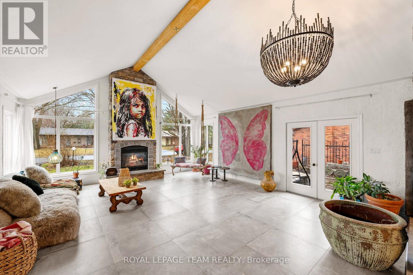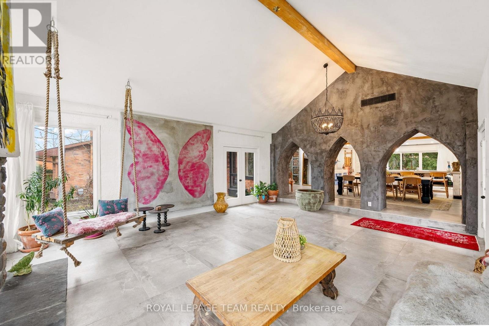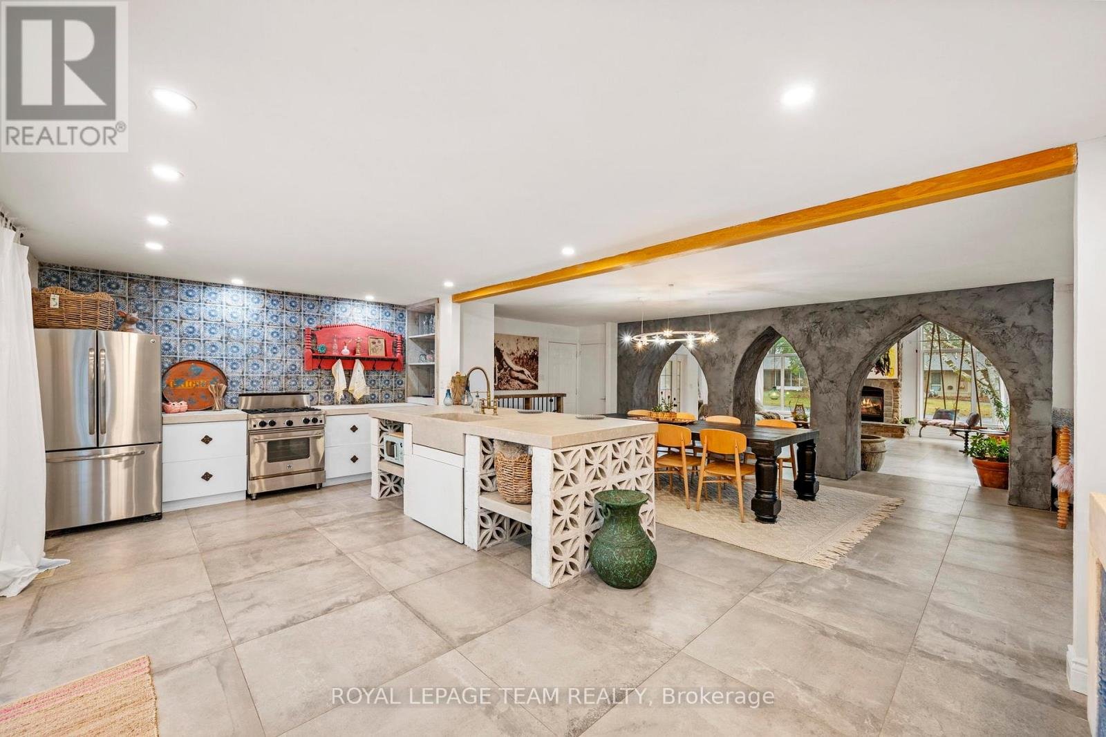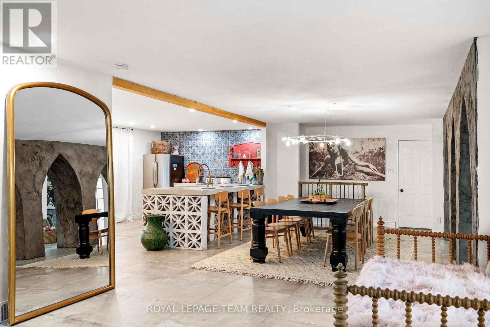 Experience a globally-inspired design with this extraordinary 1800 sq ft, 3-bedroom bungalow, where bohemian elegance meets modern architectural flair. This home is a curated sanctuary, featuring premium finishes including imported French porcelain ceramic flooring that flows seamlessly through the expansive, open-concept layout. Step in to the heart of the home; a sun-drenched great room addition (2010) anchored by a soaring floor-to-ceiling stone gas fireplace and cathedral ceiling with exposed timber beam. Outside this space, the private courtyard patio offers an intimate escape, featuring rugged flagstone and raised garden beds, perfect for morning coffee or relaxation in nature. Dramatic, hand-textured grey archways create a stunning transition from the great room into the formal dining space and gourmet kitchen, which centers around a massive concrete-topped island with intricate geometric breeze-block detailing. Custom Mediterranean-blue cabinetry and a professional-grade stainless steel range make this a true chef's retreat. Dine outside on the deck while your animal companions frolick in the fully fenced back yard. Both main floor bedrooms offer a world-class aesthetic, headlined by breathtaking hand-carved palace doors imported from India. In the primary suite, complete with 2 pce powder room, these masterpieces serve as a functional work of art, opening to a serene space filled with natural light. Expansive windows throughout the home frame the lush, mature greenery outside. The partially finished lower level includes a spacious laundry/storage, and a 3rd bedroom. A garage entrance provides direct basement access, offering potential for a future in-law suite. Book your showing today and step inside a home that truly defies the ordinary.