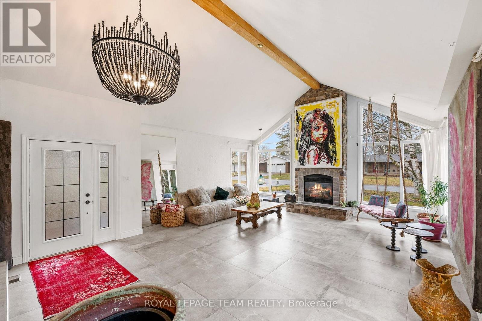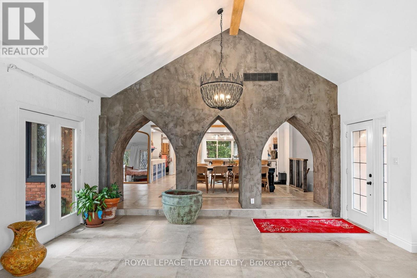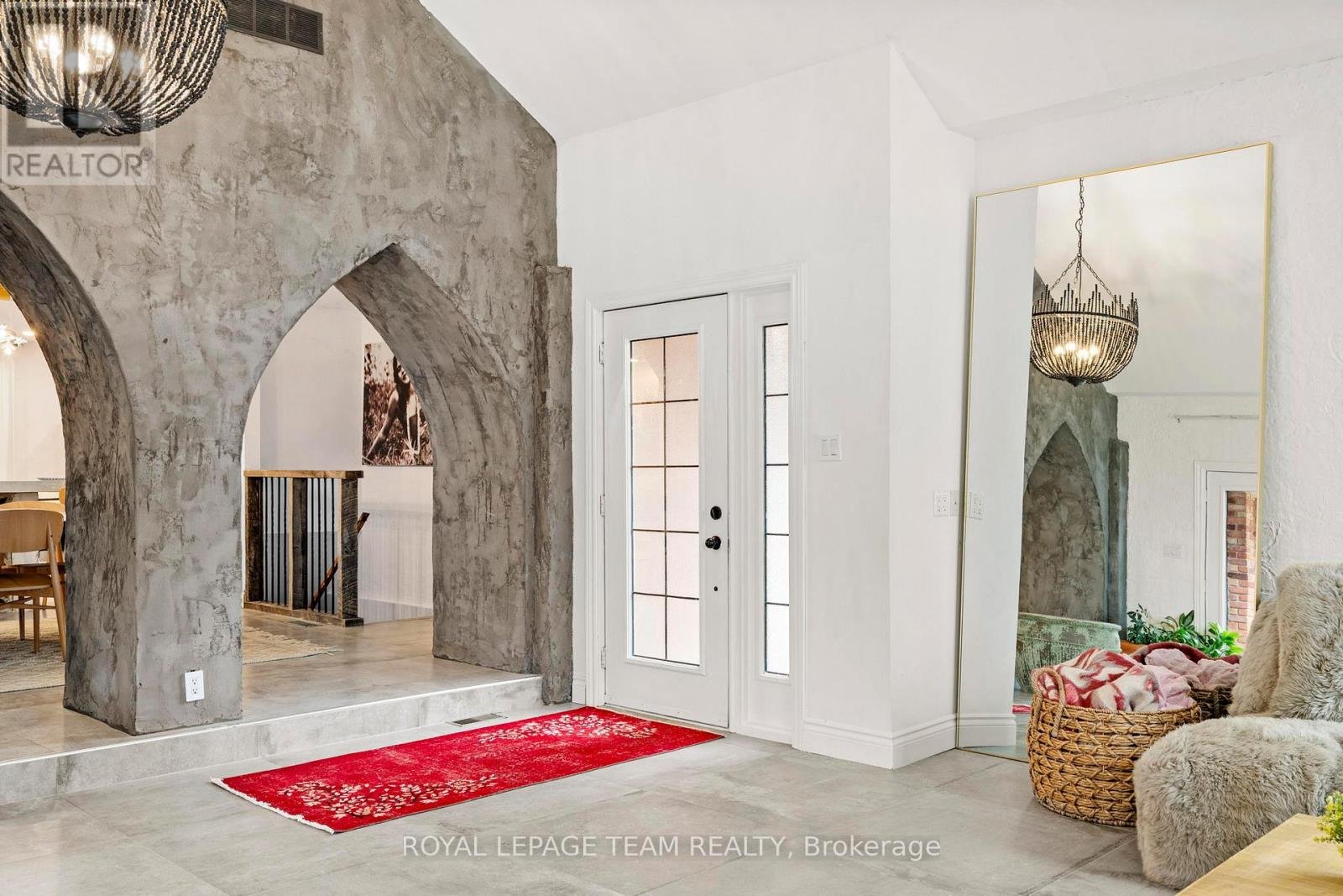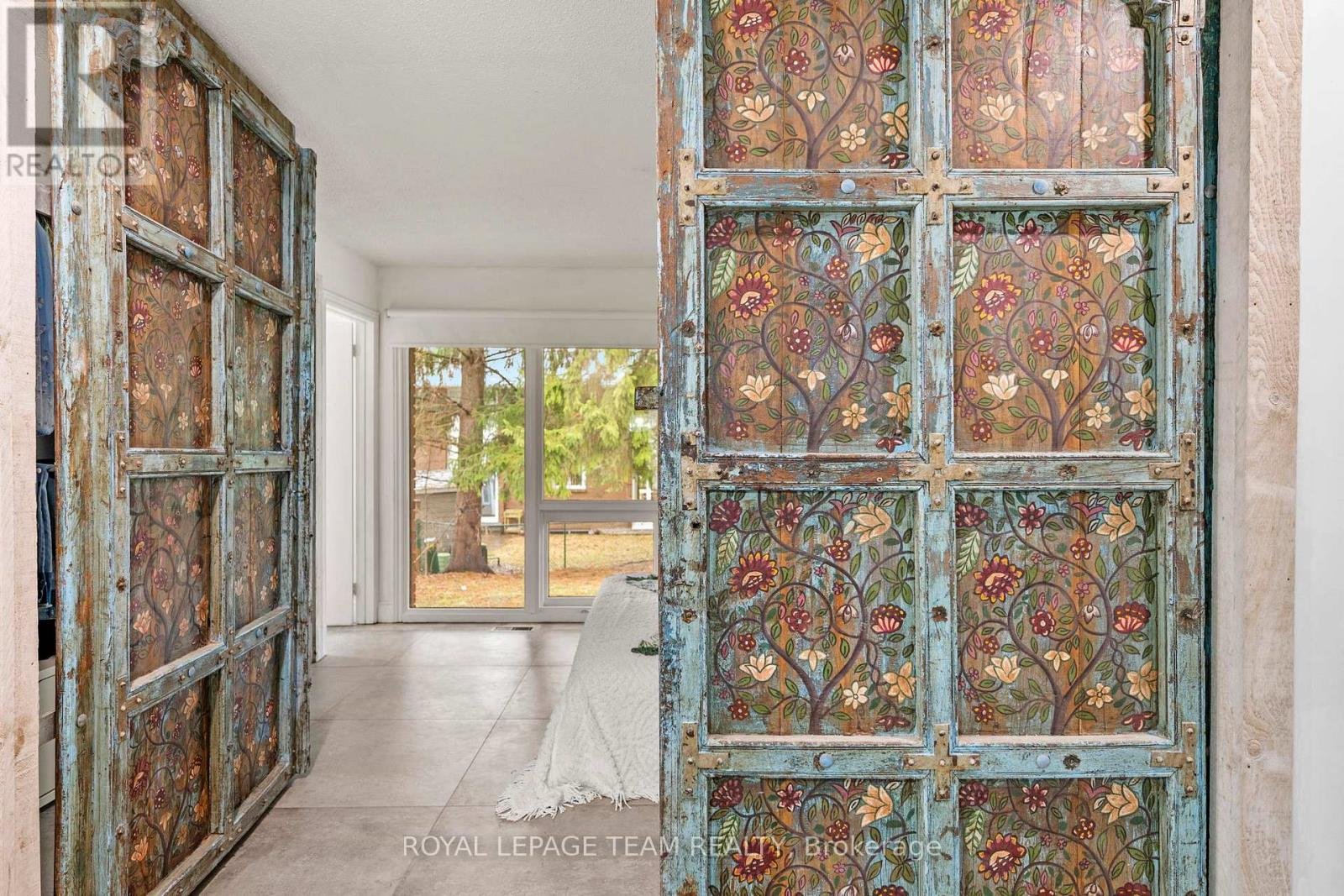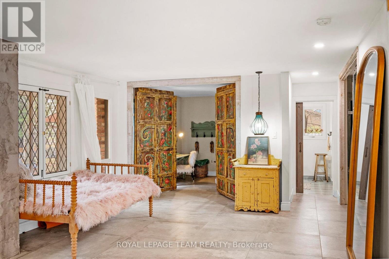 Experience a globally-inspired design with this extraordinary 1800 sq ft, 3-bedroom bungalow, where bohemian elegance meets modern architectural flair. This home is a curated sanctuary, featuring premium finishes including imported French porcelain ceramic flooring that flows seamlessly through the expansive, open-concept layout. Step in to the heart of the home; a sun-drenched great room addition (2010) anchored by a soaring floor-to-ceiling stone gas fireplace and cathedral ceiling with exposed timber beam. Outside this space, the private courtyard patio offers an intimate escape, featuring rugged flagstone and raised garden beds, perfect for morning coffee or relaxation in nature. Dramatic, hand-textured grey archways create a stunning transition from the great room into the formal dining space and gourmet kitchen, which centers around a massive concrete-topped island with intricate geometric breeze-block detailing. Custom Mediterranean-blue cabinetry and a professional-grade stainless steel range make this a true chef's retreat. Dine outside on the deck while your animal companions frolick in the fully fenced back yard. Both main floor bedrooms offer a world-class aesthetic, headlined by breathtaking hand-carved palace doors imported from India. In the primary suite, complete with 2 pce powder room, these masterpieces serve as a functional work of art, opening to a serene space filled with natural light. Expansive windows throughout the home frame the lush, mature greenery outside. The partially finished lower level includes a spacious laundry/storage, and a 3rd bedroom. A garage entrance provides direct basement access, offering potential for a future in-law suite. Book your showing today and step inside a home that truly defies the ordinary.