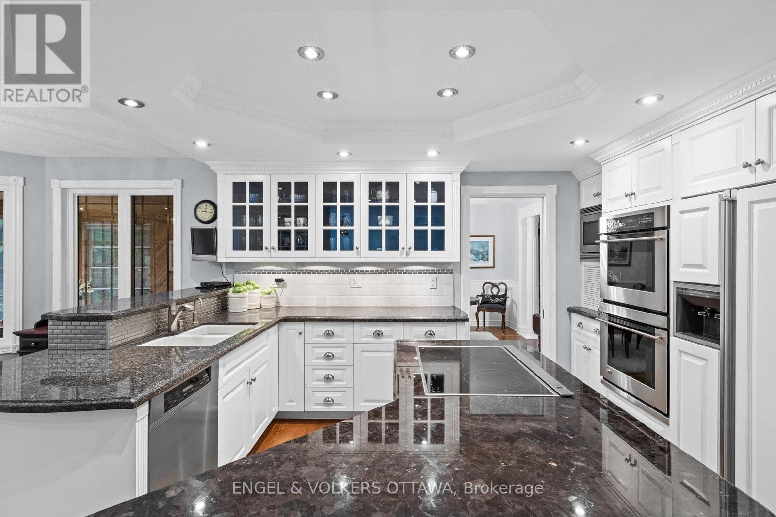 Meticulously maintained and beautifully appointed, this elegant 4-bedroom, 4-bathroom home is ideally situated on a quiet court in sought-after Kanata Lakes. Offering privacy, space, timeless design and backing treed land with scenic walking trails. As you arrive, pride of ownership is evident, highlighted by an extensive interlock walkway and exceptional curb appeal. Inside, a traditional layout features formal living and dining rooms, perfect for entertaining. A gorgeous sunken family room with soaring ceilings and a gas fireplace creates a warm, inviting gathering space.The eat-in kitchen has been updated, complete with granite countertops and high-end appliances including an induction cooktop, double ovens, and a wine fridge. Stunning three-season, two-tiered sunroom with a gas stove overlooks the private, treed backyard-an ideal space to relax and unwind while enjoying nature in the warmer months. Second level boasts a spacious primary suite with fully renovated luxurious ensuite and walk-in closet. Three additional well-sized bedrooms share a fully renovated full bath, providing comfort and functionality for family living. The fully finished lower level expands the living space with a large recreation room featuring custom built-ins surrounding a second gas fireplace, a beautifully crafted wood-panelled home office, a versatile hobby room, a 3-piece bath, and ample storage.The backyard is a private oasis with mature gardens, interlock patio, and no rear neighbours, overlooking the tranquil green space. Located in one of Kanata's most desirable communities, close to top-rated schools, parks, and amenities, this exceptional home delivers refined living in a truly special setting.