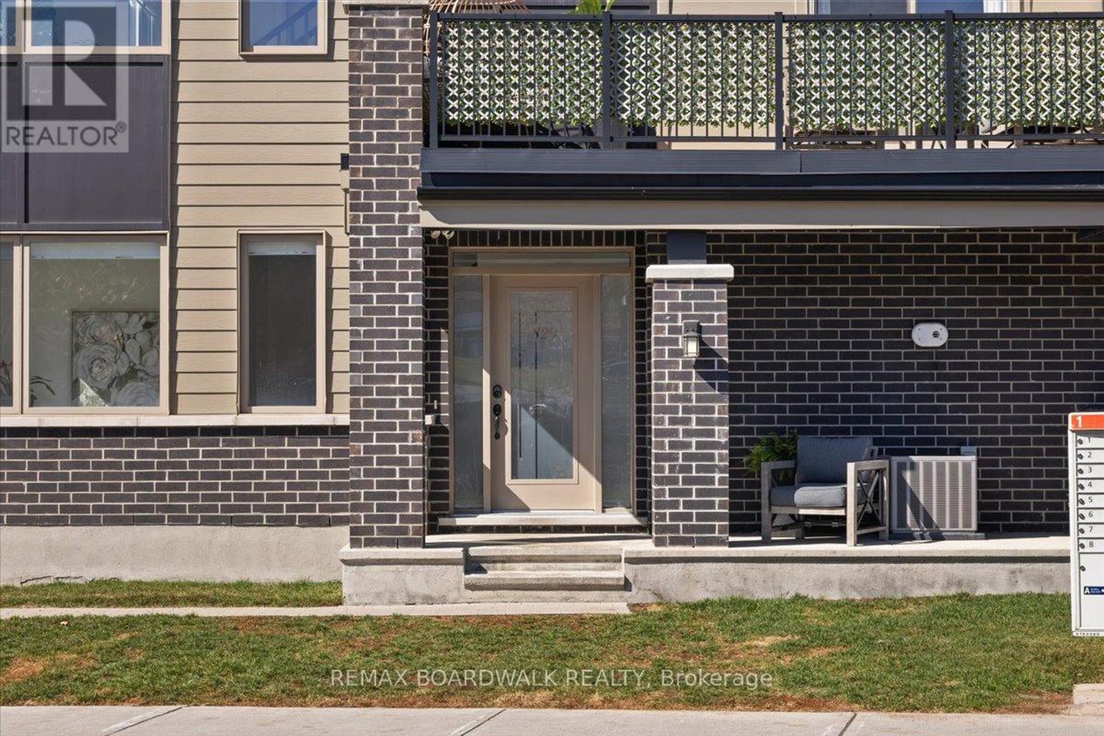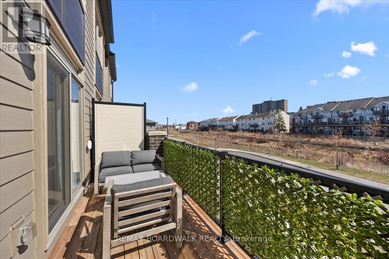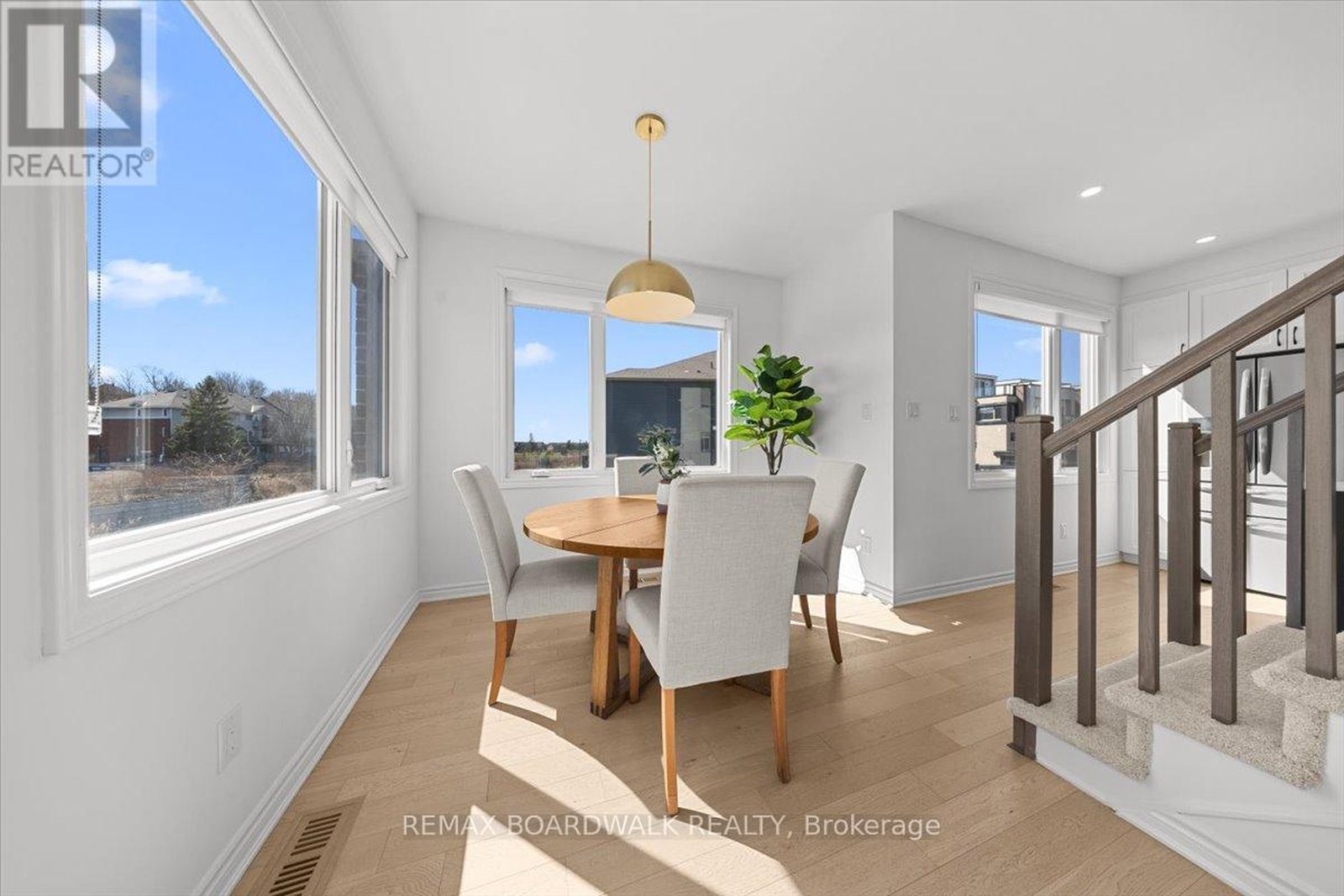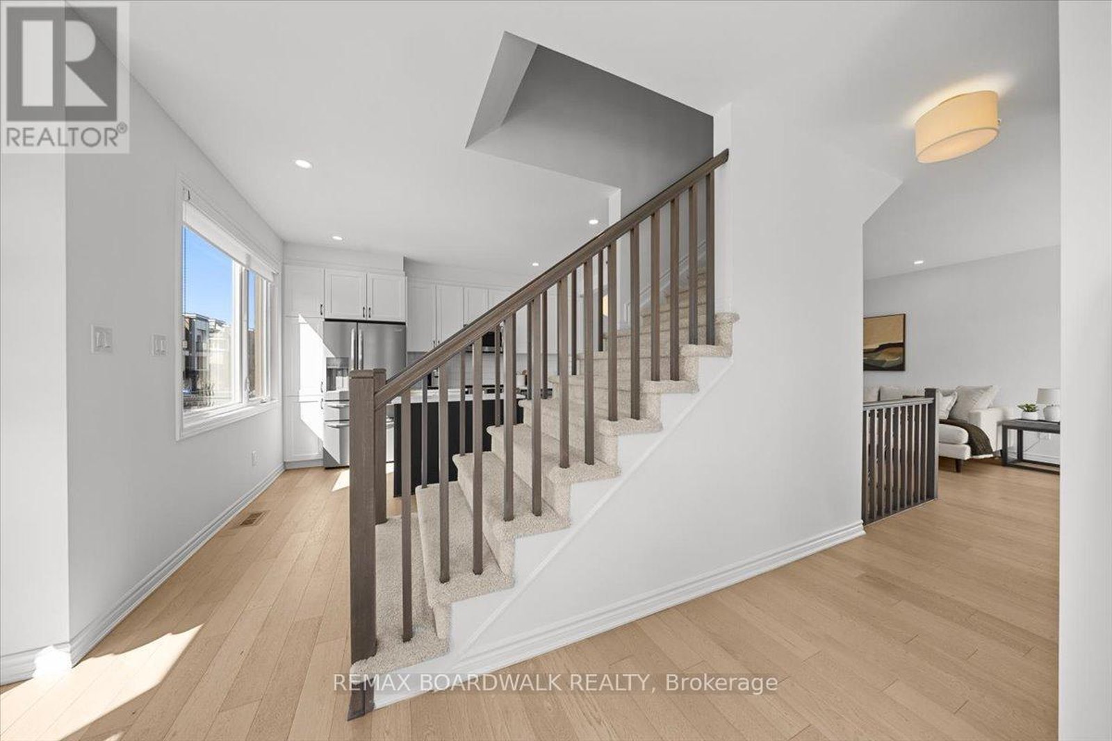 If you've been waiting for something elevated, intentional, and completely move in ready, this is the one. Welcome to this upgraded corner unit townhome offering 3 levels of refined living in Wateridge Village on Kiniw. A vibrant, sustainable community just minutes from downtown Ottawa. Set on a corner lot with a long driveway and a covered porch that wraps to the front door, this home makes a strong first impression. Inside, tall flat ceilings and oversized windows create a bright, open feel throughout. The main level features tiled flooring, a dedicated office or den, generous closet space, and interior access to an extended 30 ft garage with built in shelving. The second level is the heart of the home with an open concept layout designed for everyday living and entertaining. Enjoy a sun filled family room, dining area with corner windows, and a beautifully finished kitchen with quartz counters, prep island, peninsula with extended breakfast bar, recessed sink, tile backsplash, and upgraded lighting. Step onto your private balcony with a privacy wall. Upstairs offers 3 bedrooms including a primary retreat with walk in closet with custom shelving and an ensuite with glass shower. Two additional bedrooms, full bath with quartz, and a convenient laundry room complete the level. Features include wide plank pre engineered flooring, upgraded carpet, designer plumbing fixtures, shaker style doors, and pot lights throughout. Close to parks, bike paths, Montfort Hospital, and everyday amenities including pharmacy, Pilates, physio, dental, and a future coffee shop. Quick access to downtown, Beechwood Village, and the 417. A home that feels right the moment you walk in. Association fee of $175.00 per month for Private rd, grass cutting, snow removal, windows and common gardening