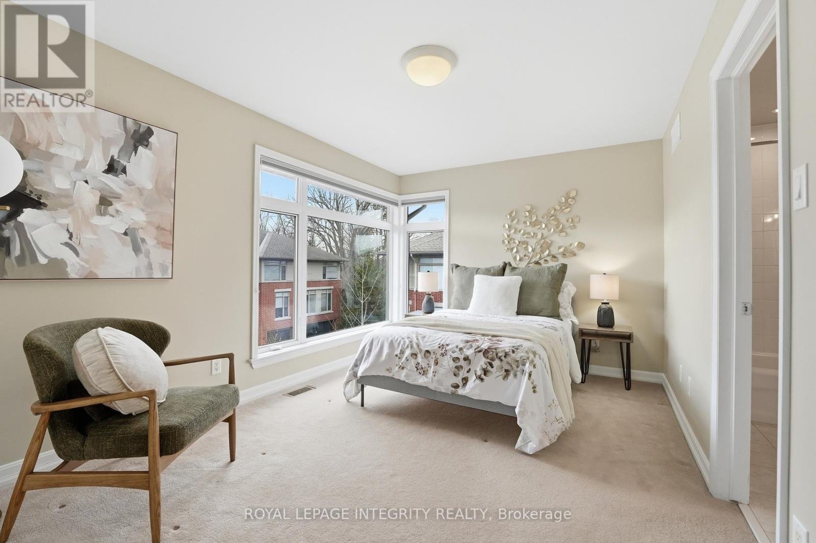 This Uniform-built end unit townhouse, designed by renowned architect Barry Hobin, is set within an exclusive enclave of executive residences in Beaverbrook. Steps to trails with easy access to highway or transit for an easy commute. You immediately notice the natural light-large windows, great exposure, and a layout that just lets the light move through the space. The main floor is where this home really shines. It's open, functional, and just easy to live in. The kitchen is both stylish and functional, featuring quartz countertops, a large island, ample cupboard space, and access to a spacious balcony. The balcony has a motorized awning and is an ideal spot for your morning coffee! The living and dining areas feature hardwood floors, expansive windows, a hardwood staircase, and a fireplace that anchors the space. Upstairs, you'll find two spacious, bright bedrooms, each with its own private ensuite. The primary ensuite features a separate tub, large window, double sink, and large shower. The second upstairs bedroom includes its own 3-piece ensuite, making it ideal for guests, family, or shared living. The first floor provides for a 3rd bedroom, a great office or other flex space. The floor also hosts a finished powder room. An unexpected double car garage is a rare bonus, adding even more appeal to this unique home.