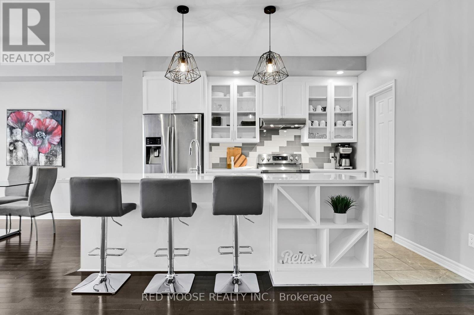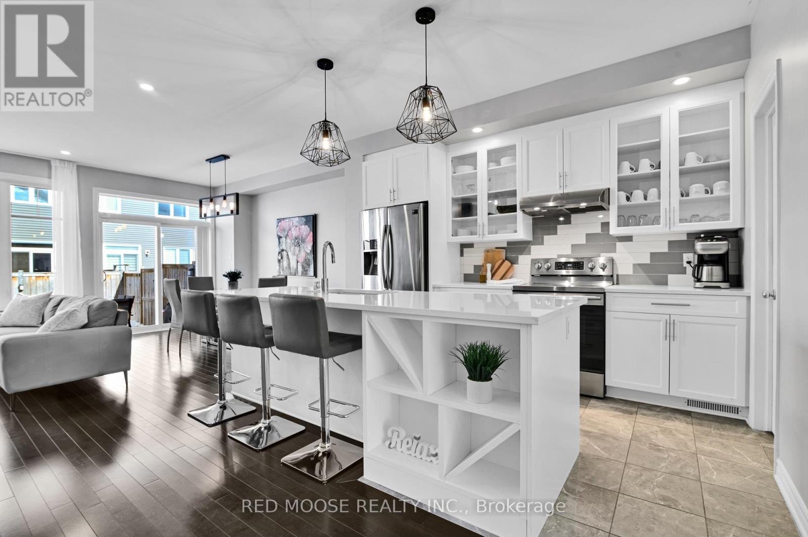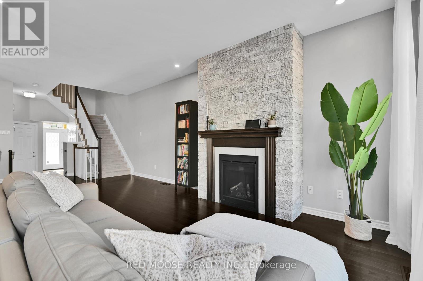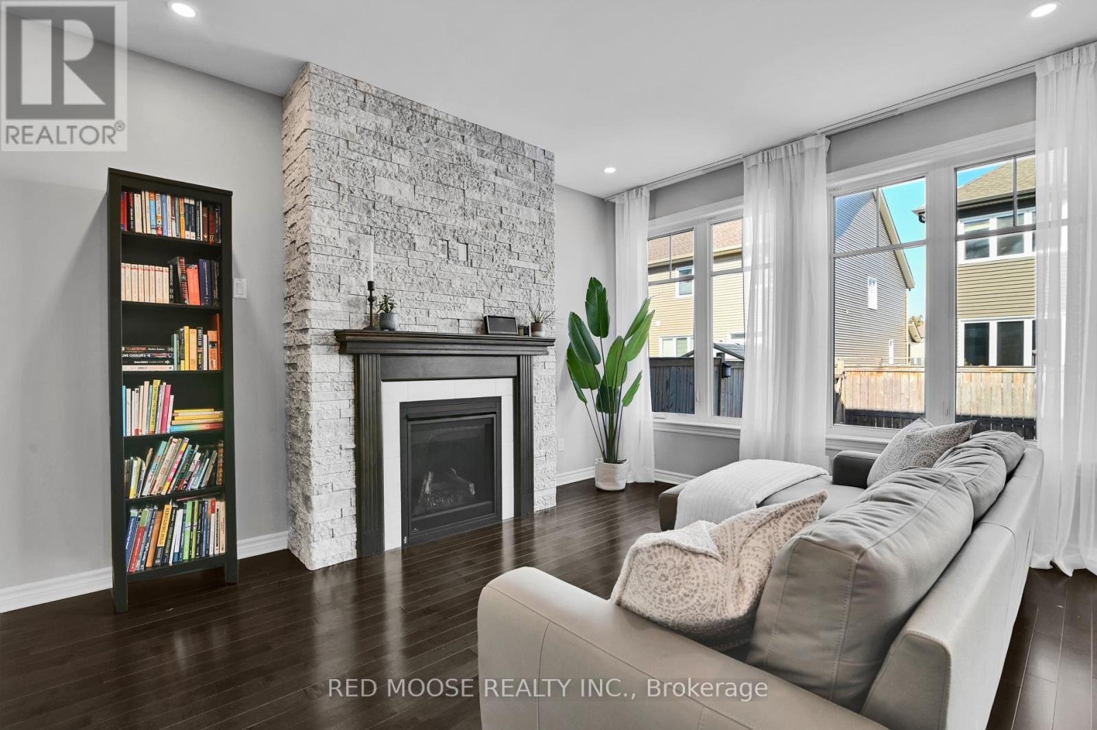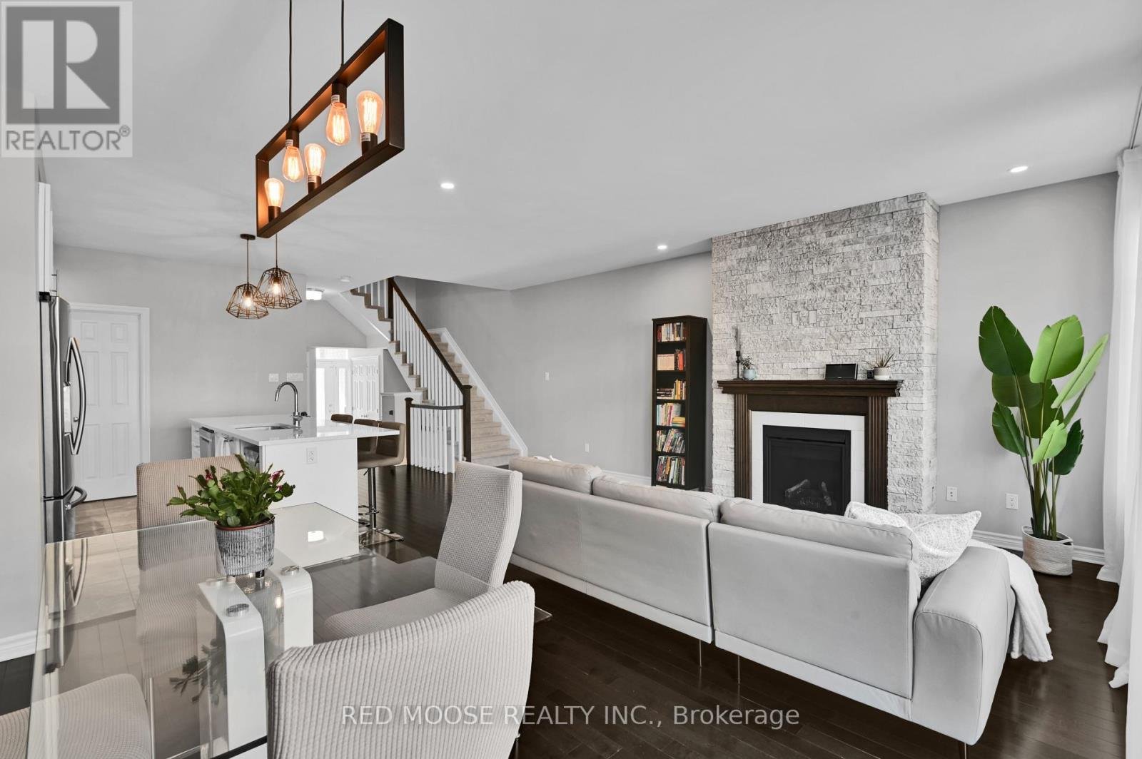 Welcome to this beautifully appointed Chelsea model townhome by Tamarack, offering an exceptional blend of space, style, and functionality. The main level impresses with soaring 9-foot ceilings and stunning hardwood floors that flow seamlessly throughout. The modern kitchen is designed for both everyday living and entertaining, featuring stainless steel appliances, a large island with granite counters, and large pantry for ample storage. The inviting living room is anchored by a striking gas fireplace with a stone tile surround and elegant mantle - perfect for cozy evenings at home. Upstairs, you'll find three generously sized bedrooms, including a spacious primary retreat complete with his and hers walk-in closets and a modern 4-piece ensuite with glass shower. The convenience of second-floor laundry and an additional full bathroom enhances the home's practical layout. The fully finished lower level offers a versatile rec room ideal for a home theatre, gym, or play space, while still having space for a potential home office AND plenty of additional storage. Step outside to enjoy the fully fenced backyard, featuring a beautifully finished interlock patio completed last year - perfect for outdoor dining and relaxation. This thoughtfully designed home delivers outstanding square footage in one of Tamarack's most sought-after layouts - ideal for families and professionals alike.