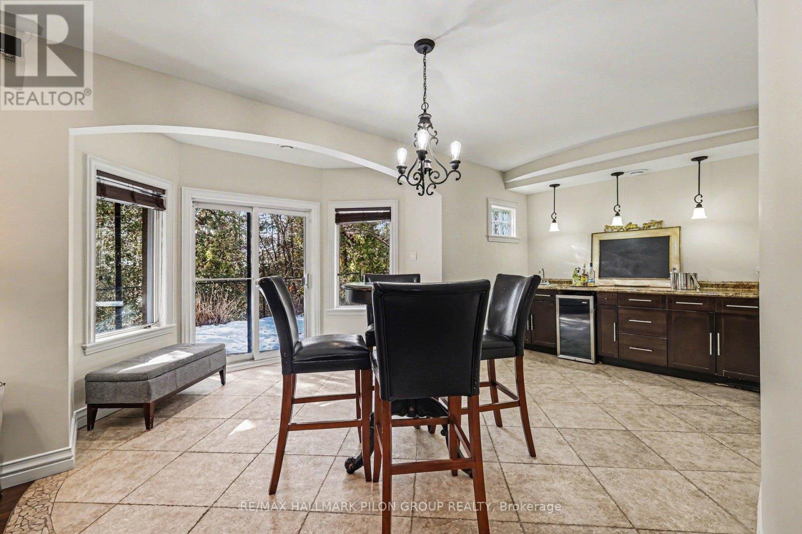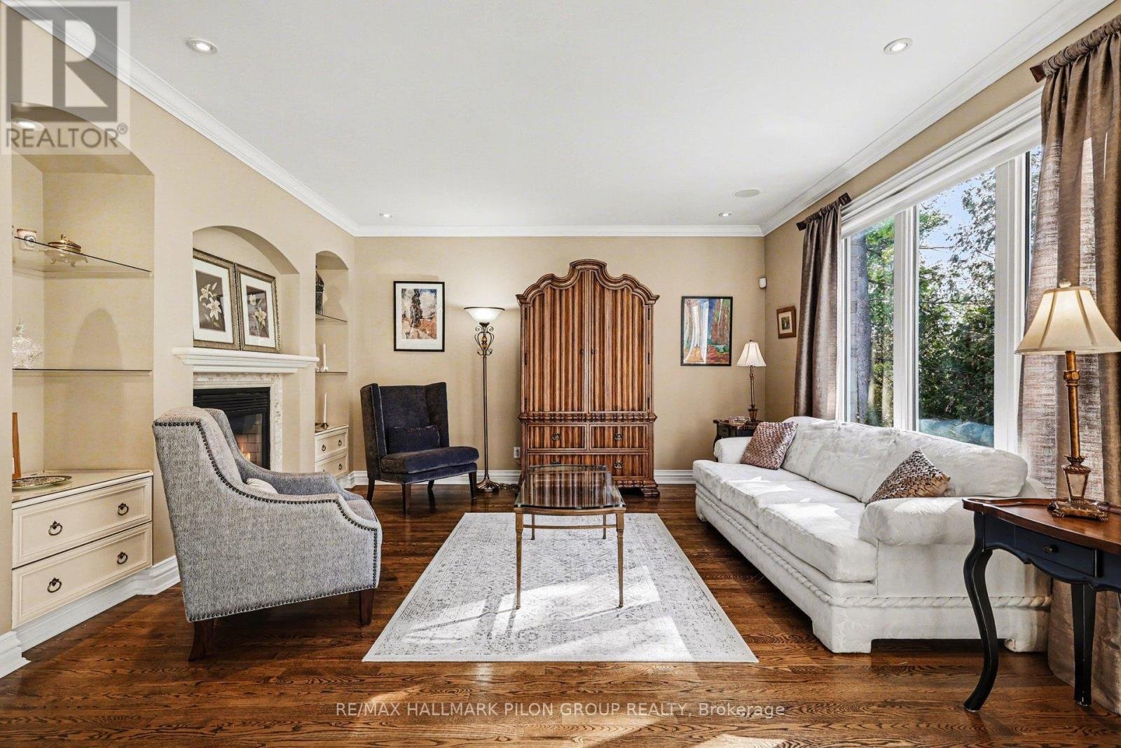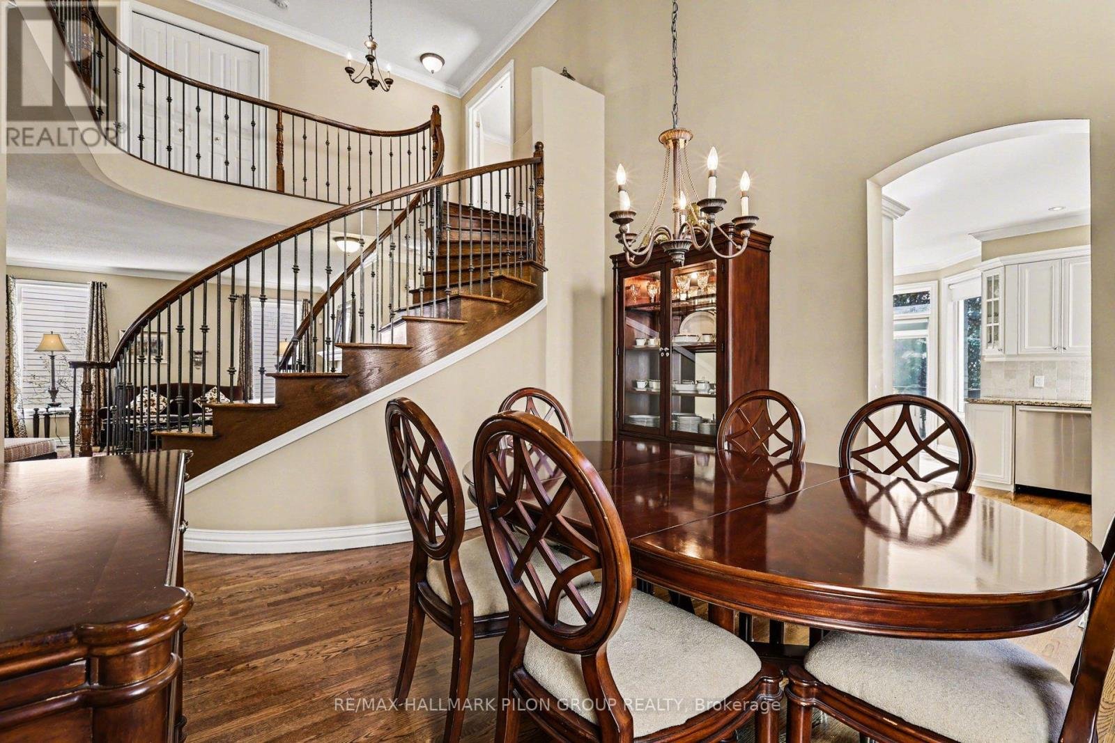 This impeccably maintained 4-bedroom home is completely turnkey & shows like a model home; welcome to 163 Copperwood St. Step into the spacious foyer, thoughtfully designed w/grand principal rooms & opulent finishes throughout. The formal living room is both elegant & inviting, highlighted by a 2-sided gas fireplace that also serves the family room. This warm and comfortable gathering space features gorgeous built-in shelving flanking the fireplace & large window overlooking the private backyard. The formal dining room is perfectly positioned next to the kitchen & reflects the sophistication of the home with its soaring 2-storey ceiling. The eat-in kitchen is sure to impress any home chef, offering magazine-worthy finishes including rich cabinetry, luxurious granite countertops, sleek stainless-steel appliances, an oversized island, & bonus desk space. A curved hardwood staircase leads to the 2nd floor, where the expansive primary retreat truly lives up to its name. This spacious suite can easily accommodate any size bedroom set and features an oversized walk-in closet along with access to the luxurious 5pc ensuite w/double sinks, glass shower, & oversized soaker tub. Hardwood stairs continue to the fully finished walk-out basement, an exceptional extension of the living space that is ideal for a teenage retreat, visiting guests, or multigenerational living. This level features a dedicated area perfect for a bedroom complete w/2 closets, a full bathroom, and a fantastic rec room anchored by a second gas fireplace w/elegant stone surround & custom built-in shelving. A beautiful wet bar & dining area make entertaining effortless, while 2 separate storage rooms provide an abundance of practical storage space. Patio doors from this level lead to the private & serene backyard. With no rear neighbours, this outdoor space offers wonderful privacy & an inviting setting to enjoy the warmer months, whether relaxing on the stone patio or entertaining family & friends.