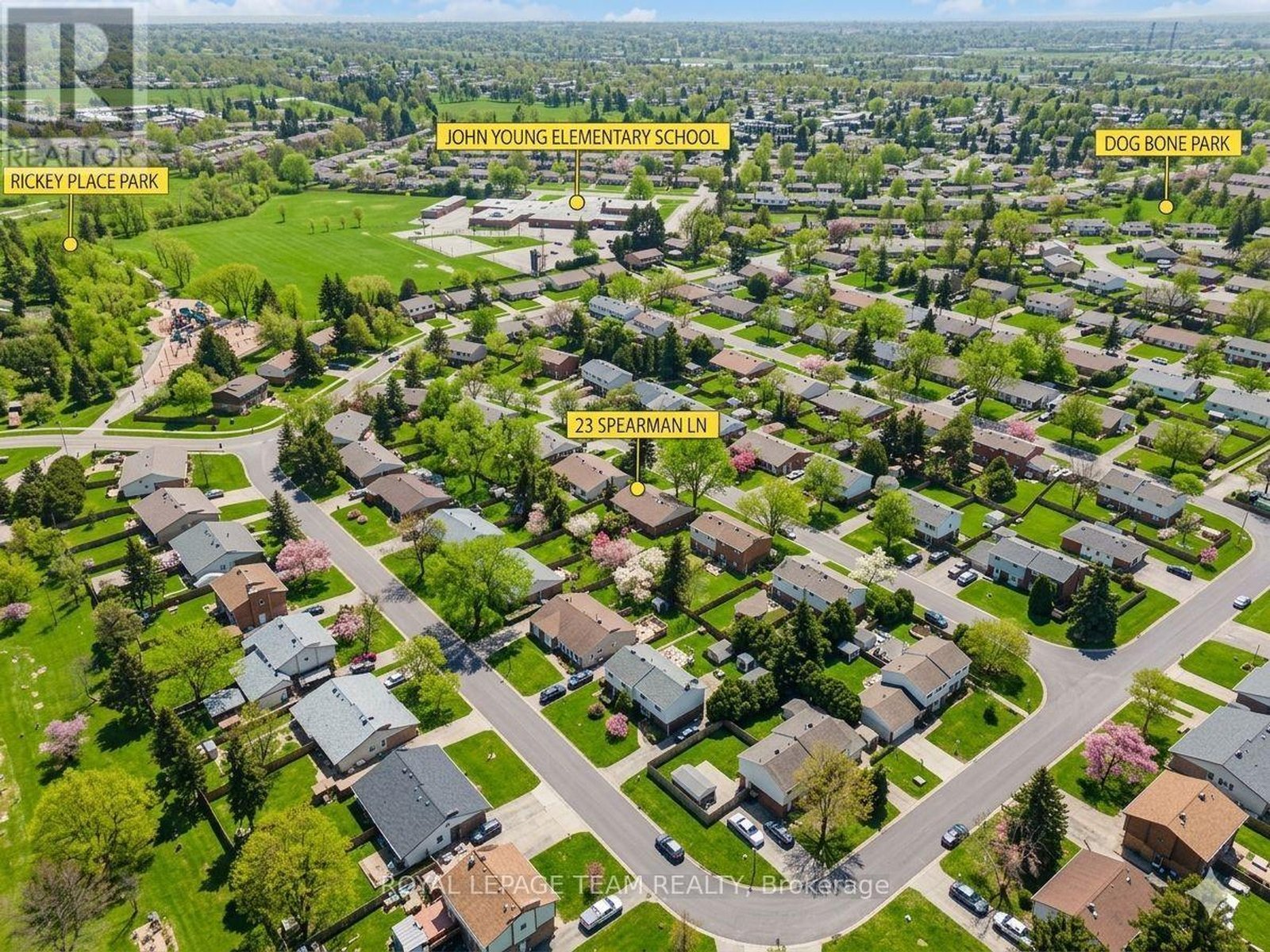OPEN HOUSE THIS SUNDAY 2-4! Welcome to 23 Spearman, an all-brick semi-detached bungalow situated on a quiet street in the highly desirable Glen Cairn community. This home balances classic character with modern convenience, making it an ideal choice for 1st time buyers or those looking to downsize. Upon entry, a bright foyer and a double coat closet lead into an expansive living room. A large picture window anchors this space, flooding the room with natural light and highlighting the hardwood floors. The heart of the home is the eat-in kitchen which features quartz countertops, a stylish tile backsplash & newer lower cabinetry. The space flows into a dedicated eating area with updated flooring, creating a functional environment. The main level also includes three spacious bedrooms & an updated main bathroom. The lower level expands the home's footprint, offering a large recreation room and a versatile hobby room. You will also find a functional laundry area and abundant storage space throughout. Step outside to an oversized, fenced, private backyard featuring a seating area & gazebo and a garden shed that provides ample room for outdoor activities. Brand-new deck boards were just installed on both the front and back porches, enhancing the home's functionality and providing a fresh look. With significant mechanical and structural updates-including the roof, furnace, and eavestroughs in 2020, AC in 2021, an upgraded electrical panel in 2012-this home offers peace of mind. Located within walking distance to great schools and scenic green spaces like Abbottsville Trail and Dog Bone Park, 23 Spearman offers an accessible lifestyle in a vibrant neighborhood. Visit the property website for full video tours. Please note that some photos have been virtually enhanced.