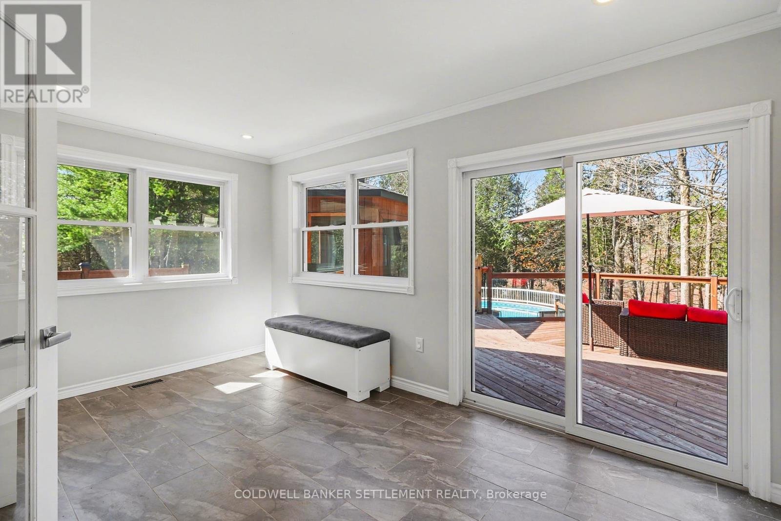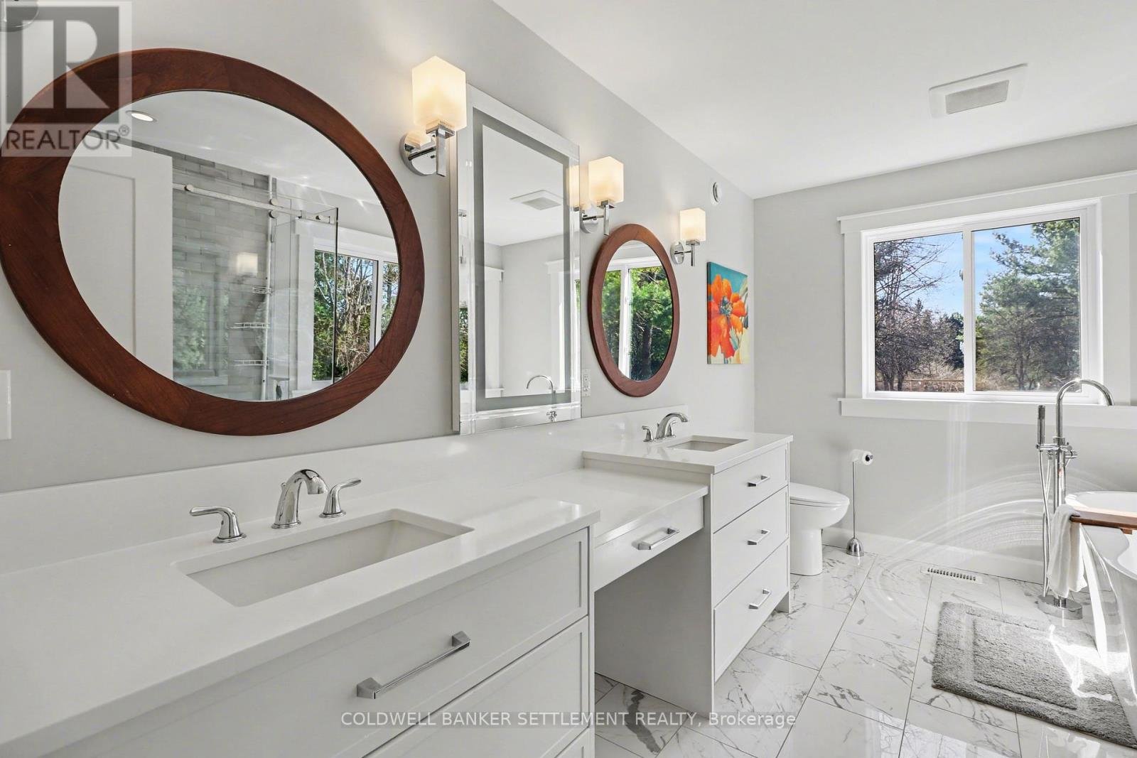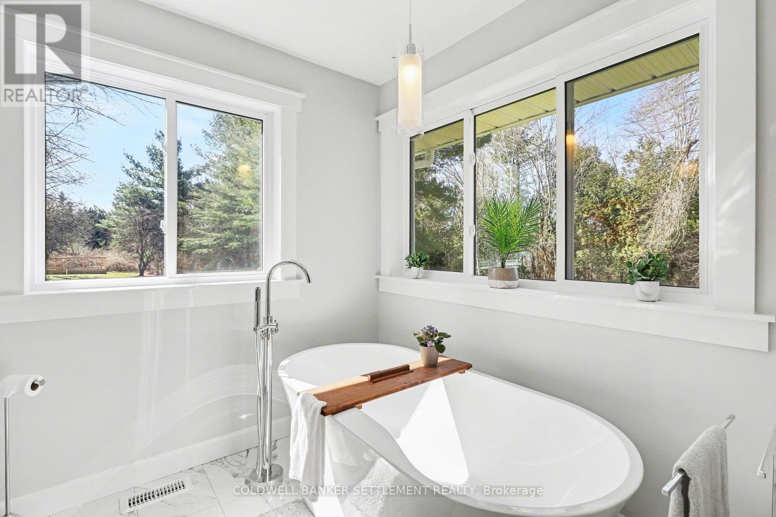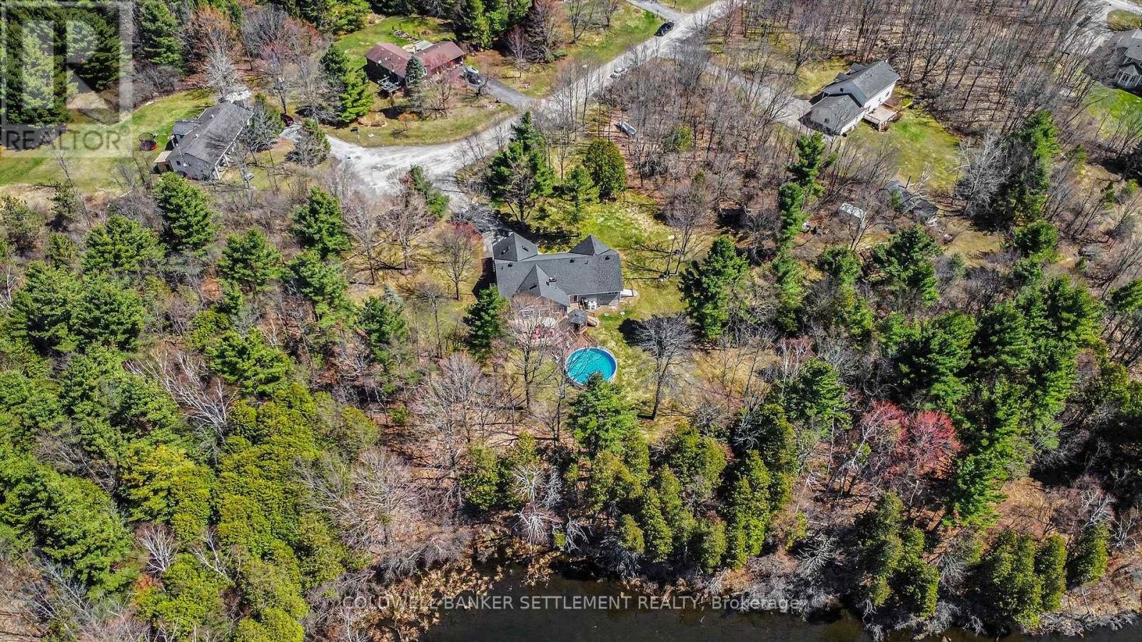 Discover the sought-after community of Elmsley Acres - one of the most desirable rural subdivisions in the Perth area - where this stunning 5-bedroom, 4-bathroom bungalow offers the perfect blend of privacy and convenience just 4.3 kms from town. Set on a picturesque 3+ acres at the end of a cul-de-sac, surrounded by mature trees and backing onto Jebbs Creek, this home is perfect for the nature lover who enjoys exploring by kayak or canoe. From the moment you open the front door, the gorgeous open-concept kitchen with quartz counters, island, & custom cabinetry, open to both the dining room and living room with stone surround gas fireplace, will inspire you. A view from every window brings the beauty of nature indoors filling the space with natural light from the bonus sun room that would make a great play room or home office, to the spacious primary bedroom with patio doors opening onto the back deck, and boasting an incredible custom walk-in closet that opens onto a beautiful spa like 5-piece ensuite with quartz double vanity, soaker tub, and glass & tile shower. The wonderful layout also features a spacious loft bedroom with its own 4-piece bathroom - ideal for guests, teens or a home studio. Well thought out, the main floor also includes a fantastic laundry/coat room, and an expansive finished basement complete with bedroom, bathroom, spacious family room with cozy wood stove, wet bar, workshop, exercise room with convenient walk-up outdoor access, cold room, and storage room. Last but not least is the on-ground heated pool overlooking the beautiful yard and creek behind. Truly an exceptional home in an exceptional location. Book your private showing today.