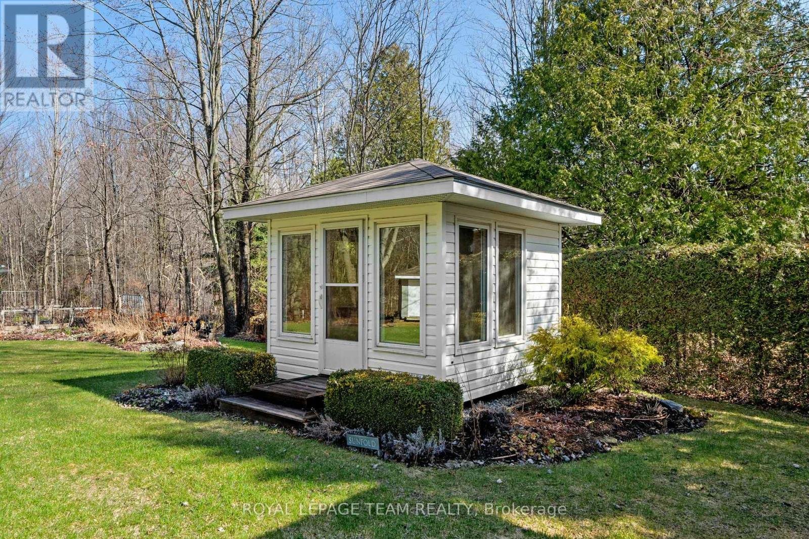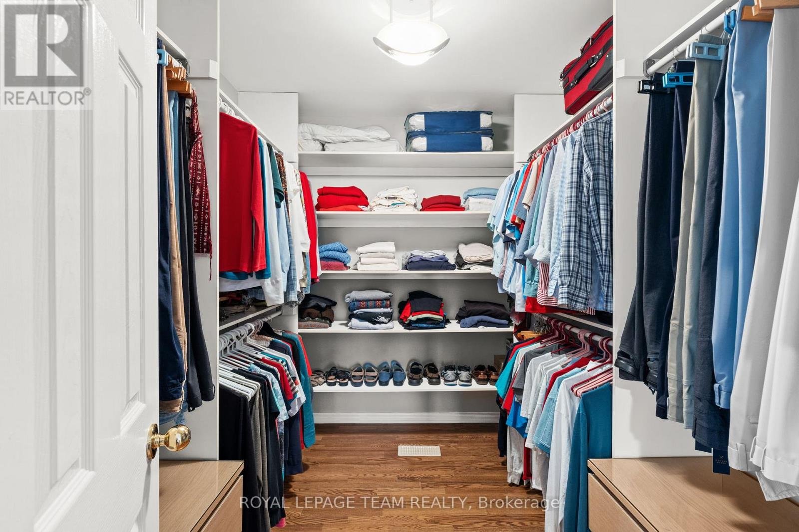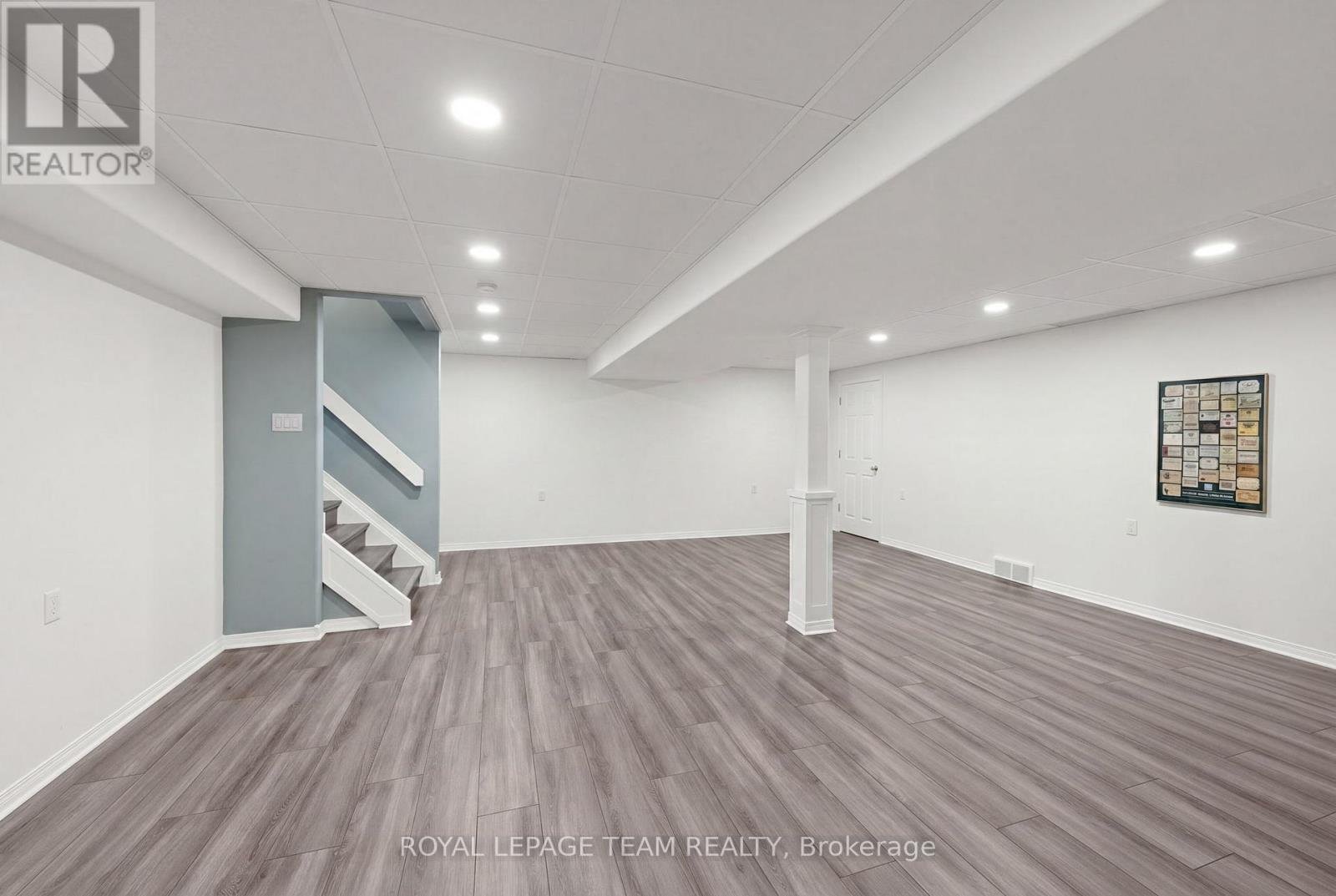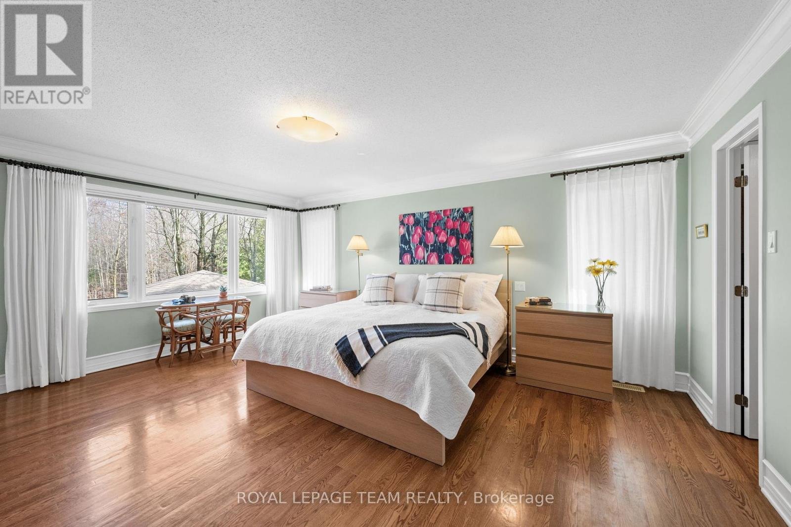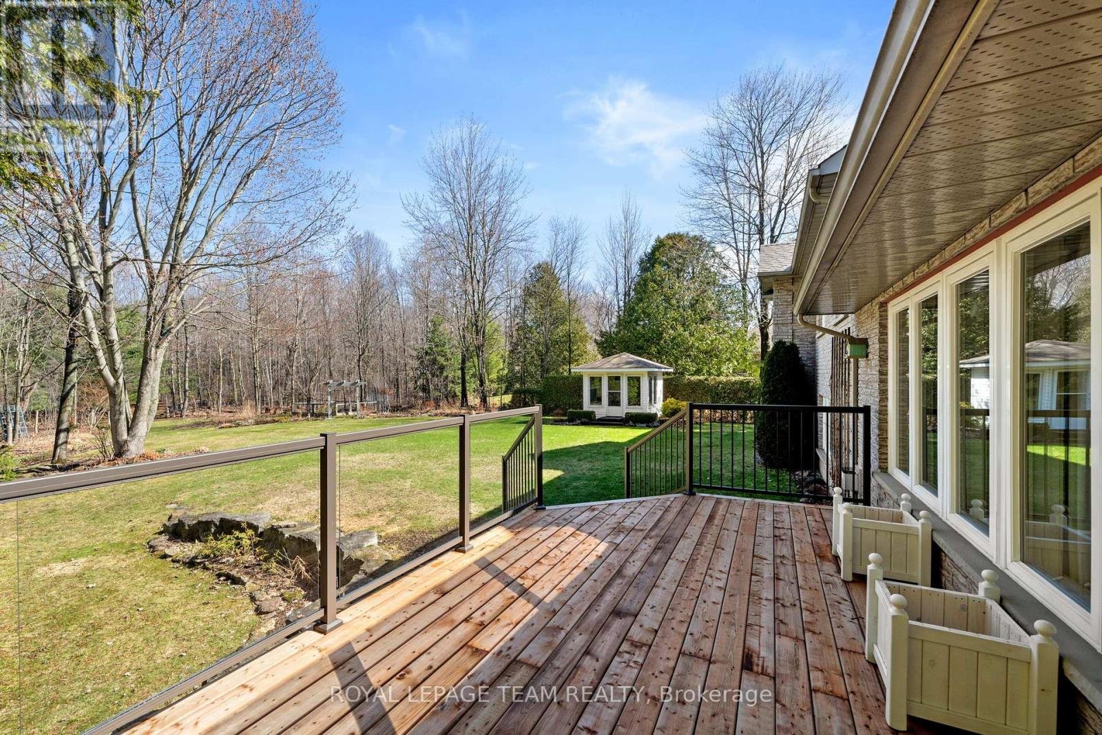 Nestled on a beautifully treed 0.96-acre lot in an established Greely neighbourhood, this custom-built property by John Gerard Homes offers timeless curb appeal with a brick façade, interlock walkway, and landscaped gardens that create an inviting first impression. Inside, a formal dining room with wainscoting sets an elegant tone, flowing into an open-concept main floor filled with natural light. Cathedral ceilings enhance the sense of space and openness throughout, while large windows capture views of the surrounding landscape. The kitchen features crisp white cabinetry, recently updated quartz countertops, and a centre island designed for casual dining. It opens seamlessly to the breakfast room and family room, highlighted by skylights and a natural gas fireplace. A living room currently serves as a private main floor office providing a quiet workspace. The primary bedroom is located on the upper level and features a spacious walk-in closet and a five-piece ensuite. Two additional bedrooms and a full bathroom complete this level. A few steps down from the main level, a generous recreation room provides additional living space. The finished lower level includes a versatile flex room with a spacious closet. Also, leading from this flex room there is a wine cellar / cold room. Outdoors, the backyard is framed by mature trees and cedars, creating a private setting to enjoy throughout the seasons. A raised deck and gardens complete the outdoor setting.