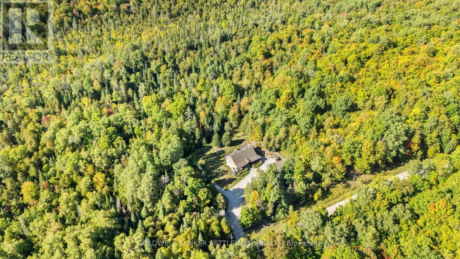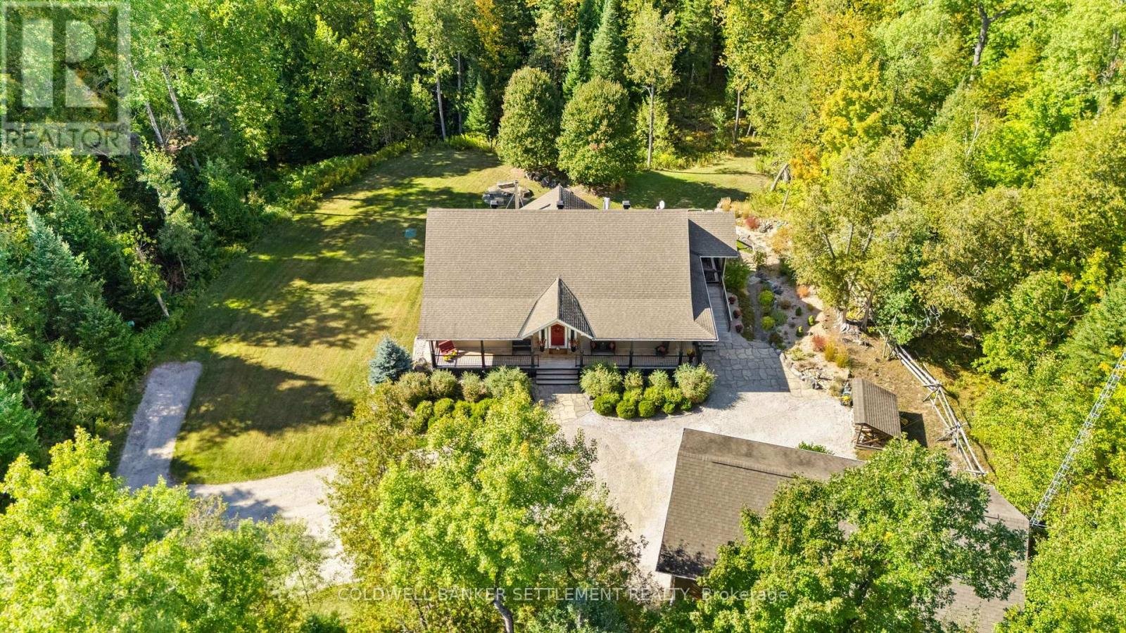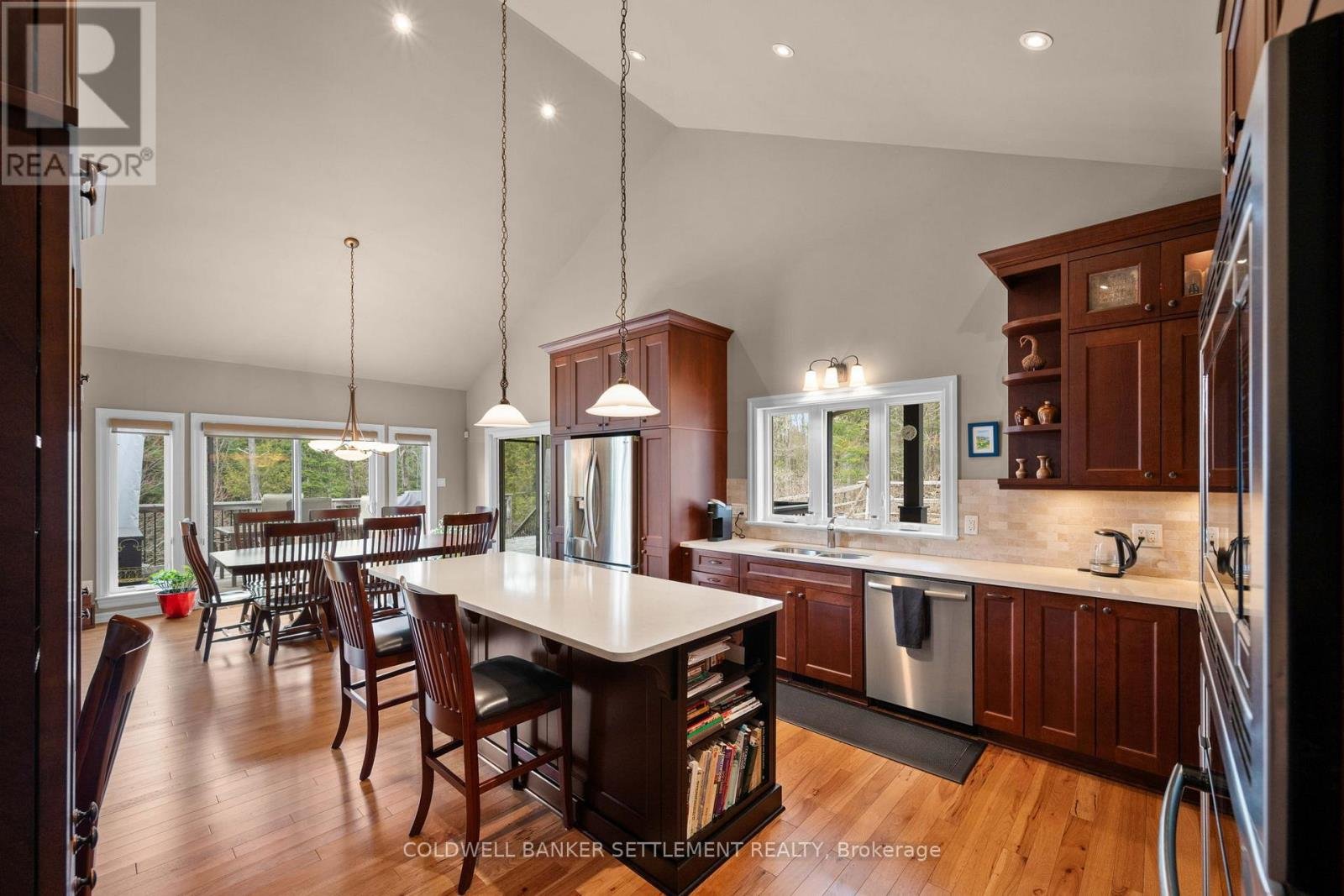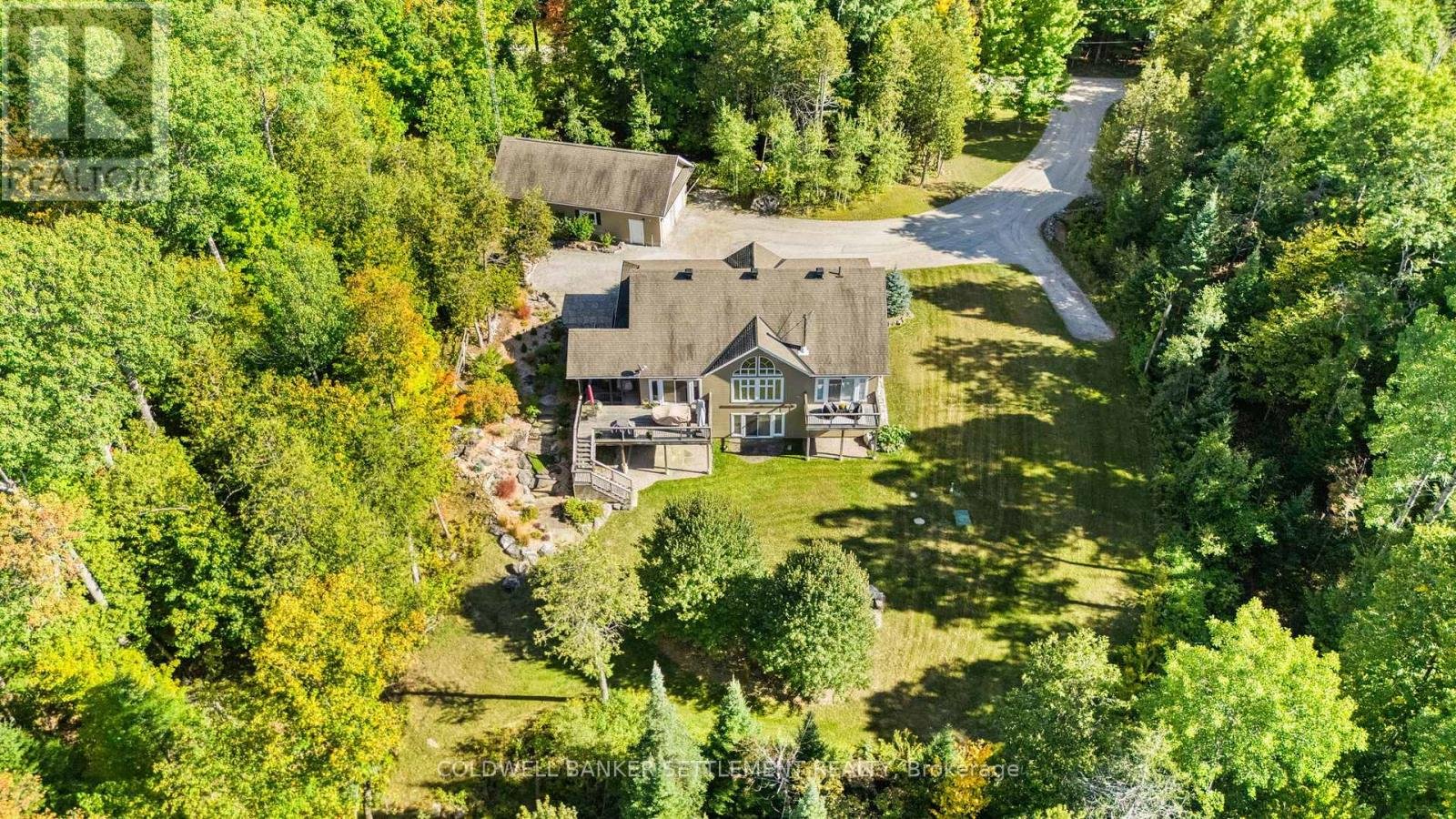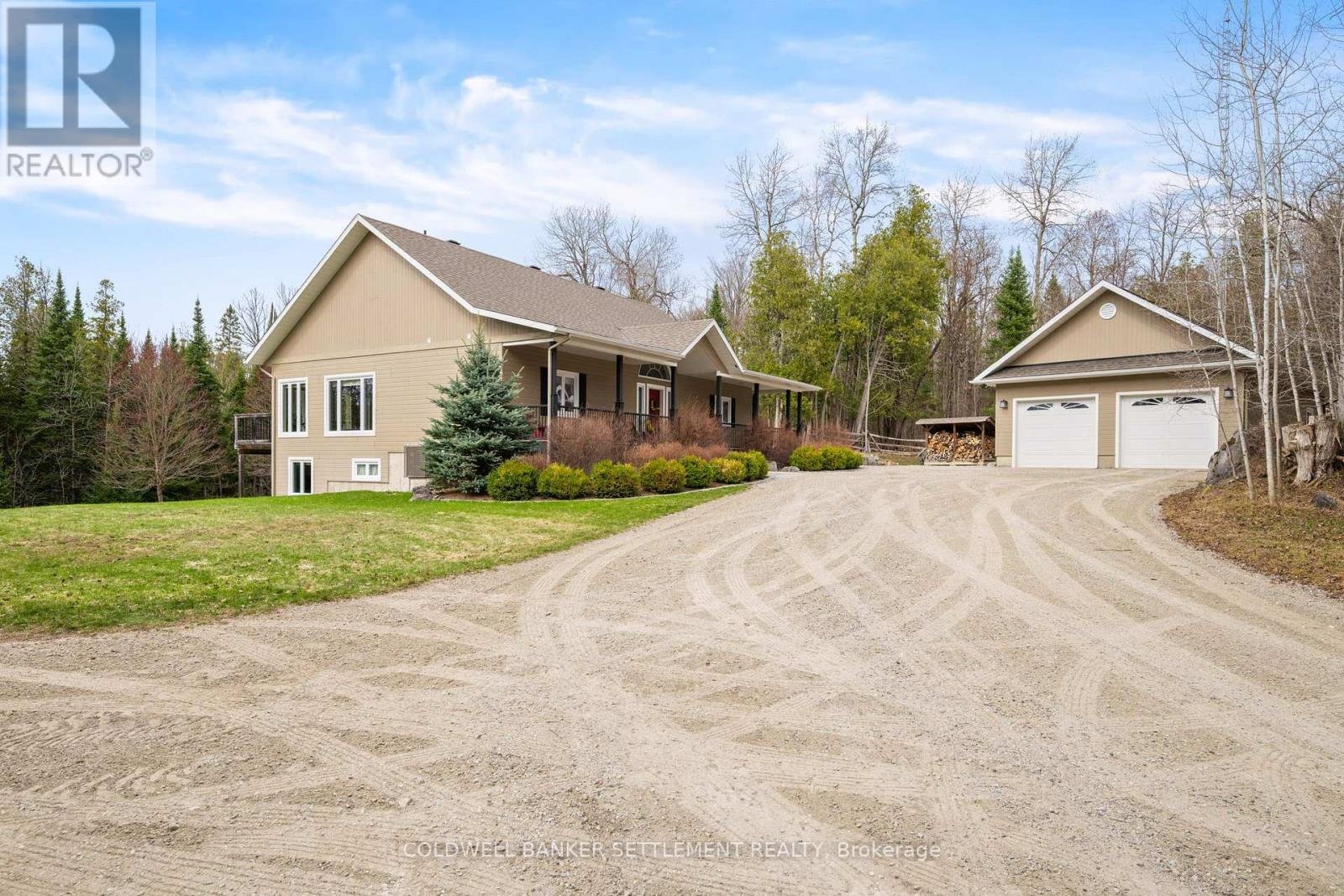 Perfect privacy! Imagine owning your own personal 100-acre forest. Only minutes to Lanark Village and 15 minutes to historic Perth. The owners created with Evergreen Construction a beautiful, efficient, easy care, comfy home where they love to relax and entertain. So many special details and features make this home quietly elegant but country casual at the same time. It was designed for energy efficiency and to make life simple, quiet, easy, and fun. Custom kitchen by Ottawa Valley Kitchens with cherry cabinets, quartz counters, top quality stainless appliances, pot filler, drink fridge, plus there is a large pantry for storing smaller appliances. Open concept with cathedral ceilings, standout lighting from Hubbardton Forge, gorgeous hickory flooring. Oversize windows galore for views of the great outdoors and you will love the coziness of the wood burning corner stone fireplace in the living room. Main floor laundry, mudroom, covered porch, wrap around decks. Primary bedroom suite with sitting/reading nook and door to personal deck, 9 foot coffered ceiling, large walk-in shower plus soaker tub in the ensuite, walk- in closet plus additional closet. 2 bedrooms on the walkout lower level plus family room, office, craft room, utility area., and loads of storage! We are not done yet - 2 double garages! One is insulated and drywalled with 10.5' ceilings (24x24) with adjoining heated workshop (20x24) and the other designed for storage of equipment, etc. (24x24) Trails through the trees - a map will be made available. An exceptional home and property - come see!