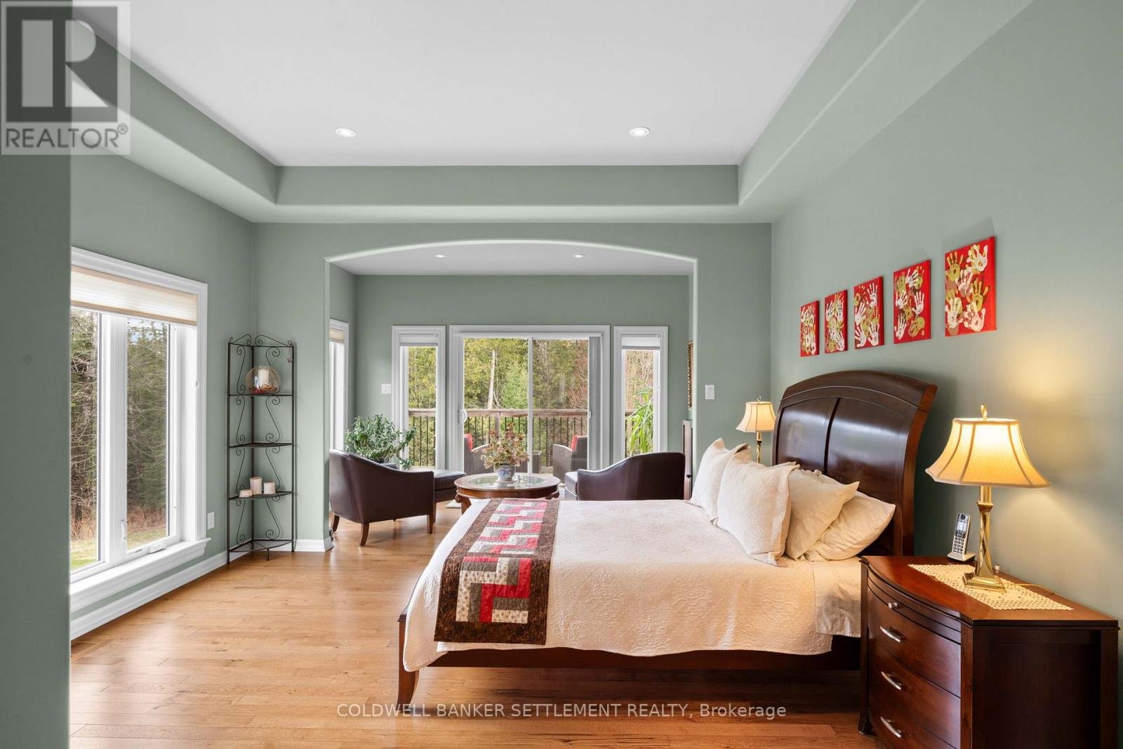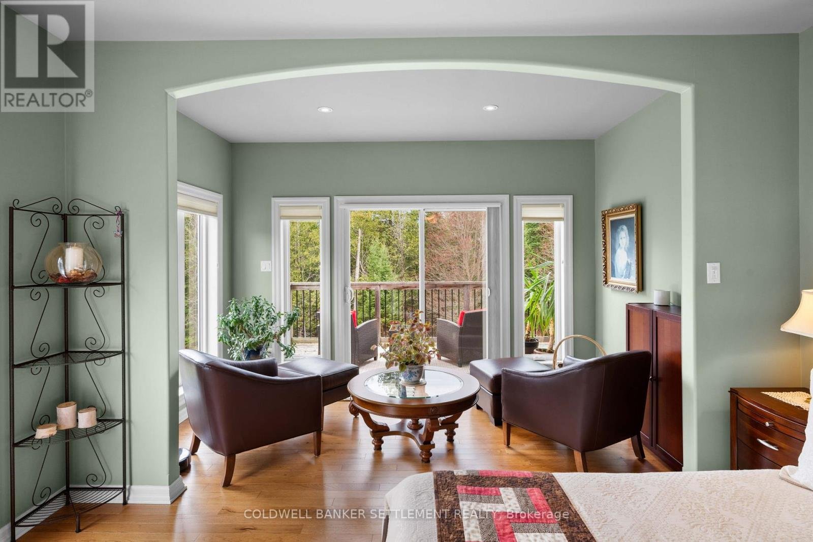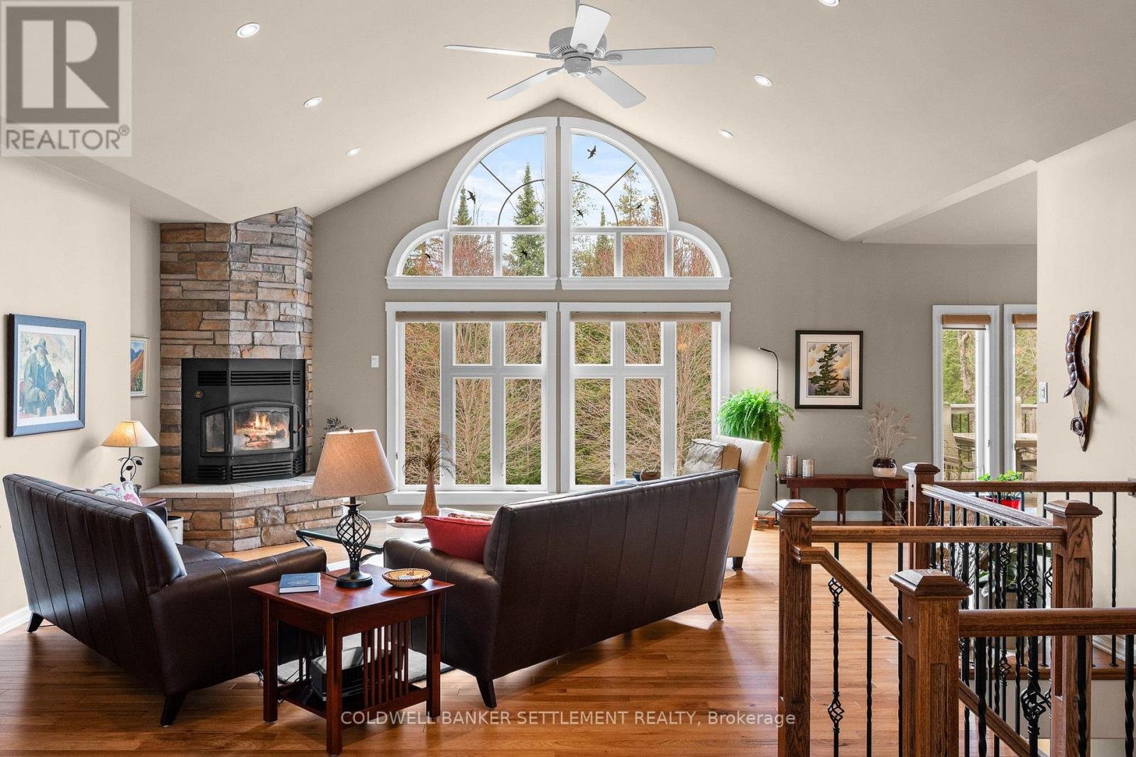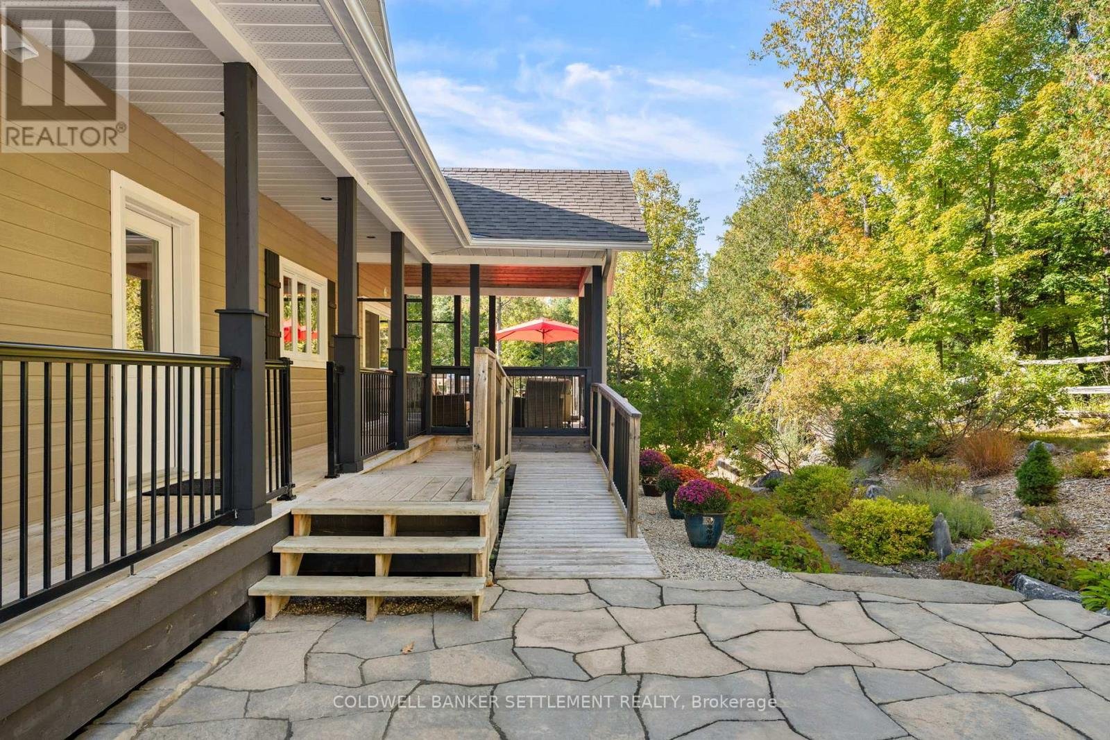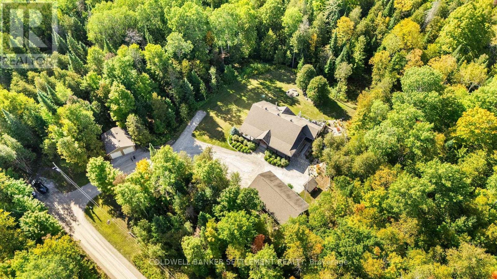 Perfect privacy! Imagine owning your own personal 100-acre forest. Only minutes to Lanark Village and 15 minutes to historic Perth. The owners created with Evergreen Construction a beautiful, efficient, easy care, comfy home where they love to relax and entertain. So many special details and features make this home quietly elegant but country casual at the same time. It was designed for energy efficiency and to make life simple, quiet, easy, and fun. Custom kitchen by Ottawa Valley Kitchens with cherry cabinets, quartz counters, top quality stainless appliances, pot filler, drink fridge, plus there is a large pantry for storing smaller appliances. Open concept with cathedral ceilings, standout lighting from Hubbardton Forge, gorgeous hickory flooring. Oversize windows galore for views of the great outdoors and you will love the coziness of the wood burning corner stone fireplace in the living room. Main floor laundry, mudroom, covered porch, wrap around decks. Primary bedroom suite with sitting/reading nook and door to personal deck, 9 foot coffered ceiling, large walk-in shower plus soaker tub in the ensuite, walk- in closet plus additional closet. 2 bedrooms on the walkout lower level plus family room, office, craft room, utility area., and loads of storage! We are not done yet - 2 double garages! One is insulated and drywalled with 10.5' ceilings (24x24) with adjoining heated workshop (20x24) and the other designed for storage of equipment, etc. (24x24) Trails through the trees - a map will be made available. An exceptional home and property - come see!