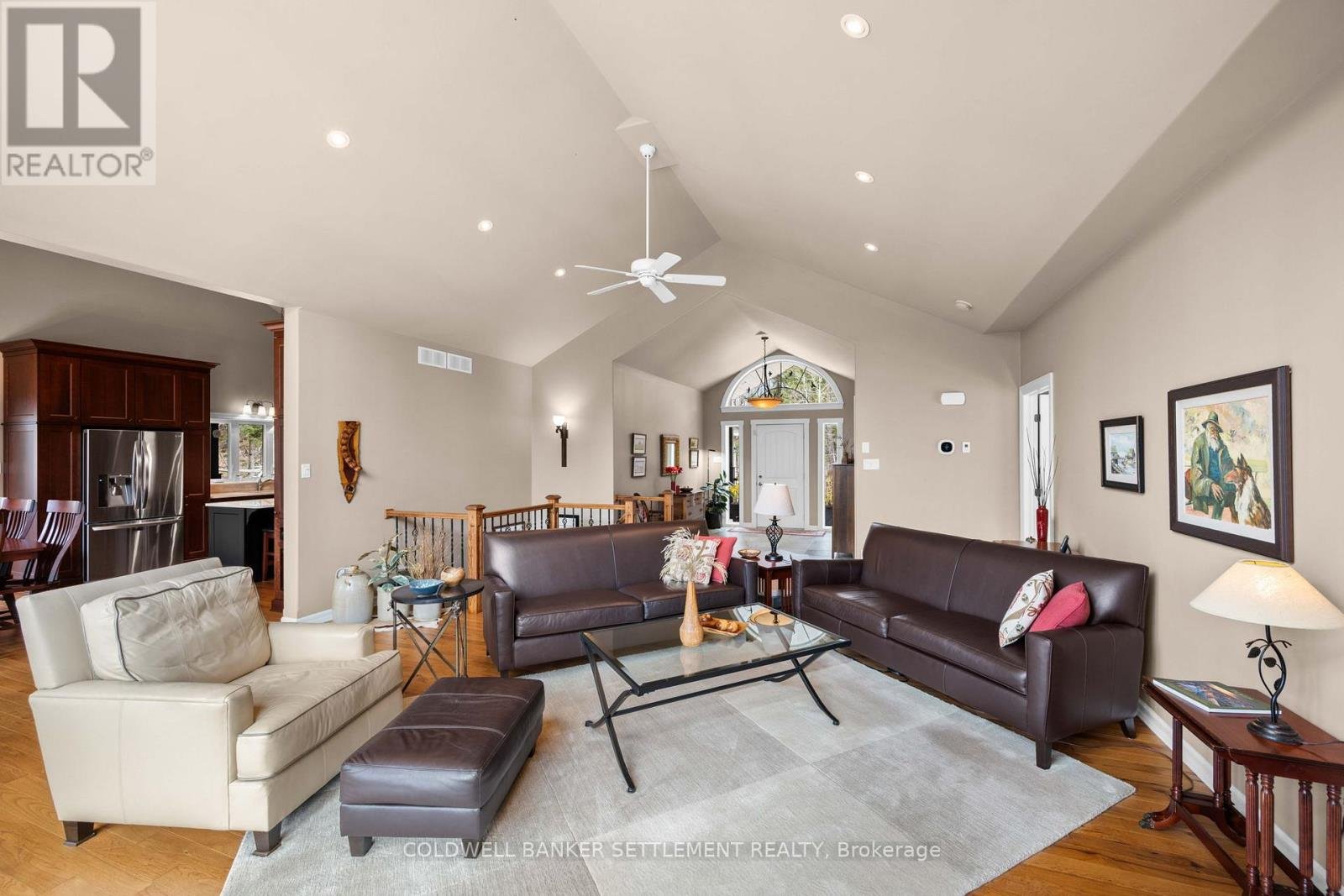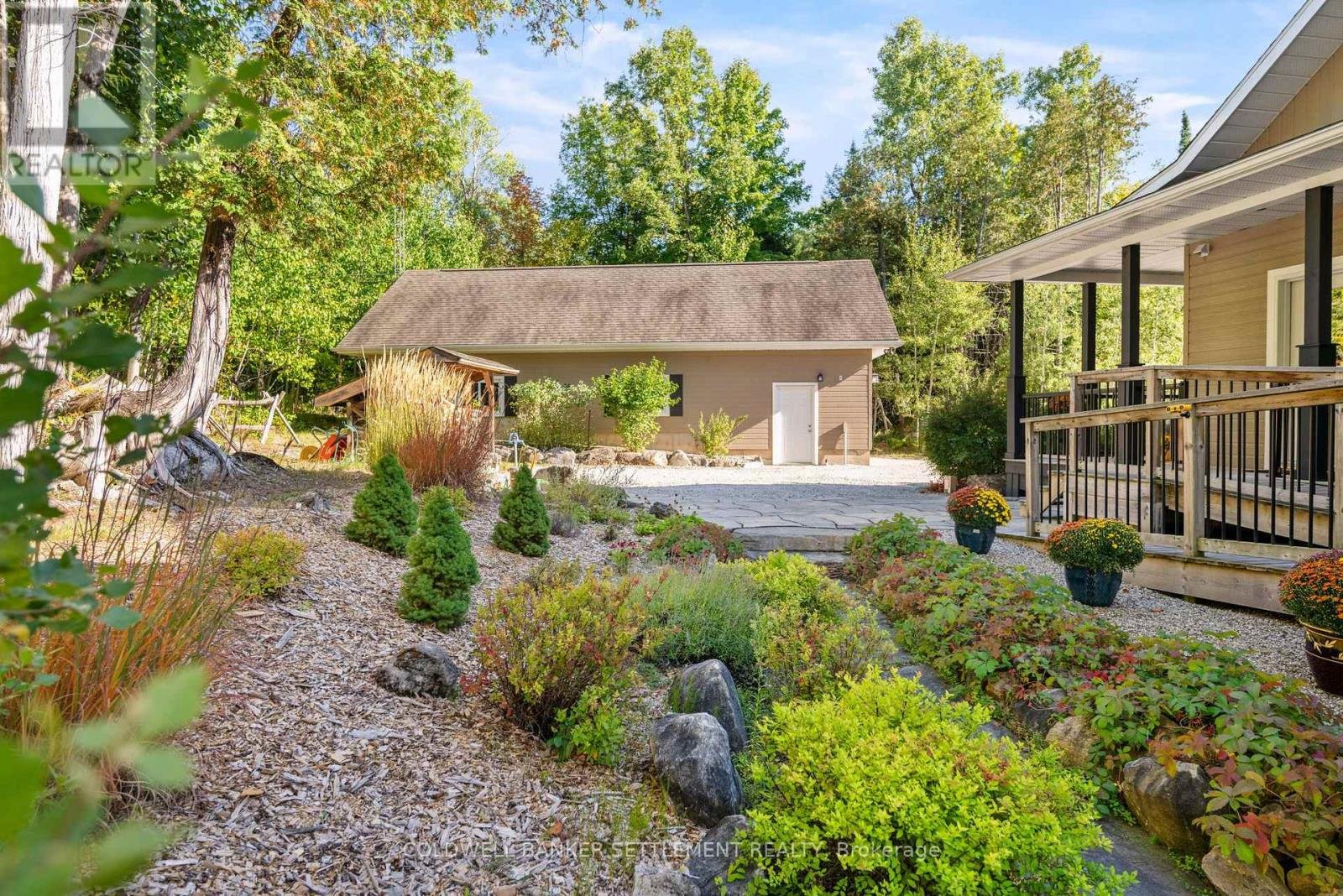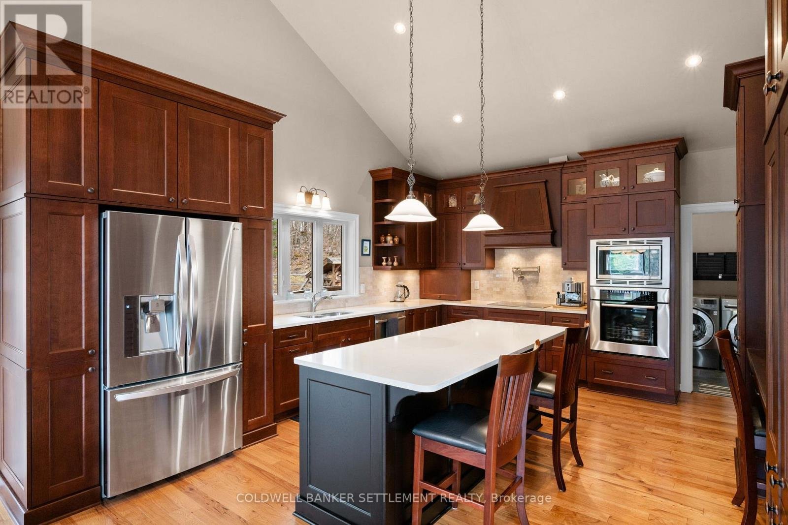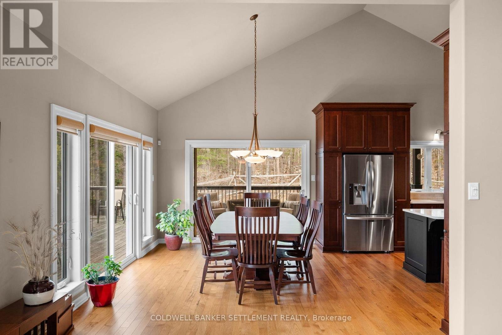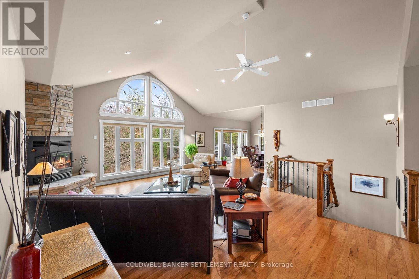 Perfect privacy! Imagine owning your own personal 100-acre forest. Only minutes to Lanark Village and 15 minutes to historic Perth. The owners created with Evergreen Construction a beautiful, efficient, easy care, comfy home where they love to relax and entertain. So many special details and features make this home quietly elegant but country casual at the same time. It was designed for energy efficiency and to make life simple, quiet, easy, and fun. Custom kitchen by Ottawa Valley Kitchens with cherry cabinets, quartz counters, top quality stainless appliances, pot filler, drink fridge, plus there is a large pantry for storing smaller appliances. Open concept with cathedral ceilings, standout lighting from Hubbardton Forge, gorgeous hickory flooring. Oversize windows galore for views of the great outdoors and you will love the coziness of the wood burning corner stone fireplace in the living room. Main floor laundry, mudroom, covered porch, wrap around decks. Primary bedroom suite with sitting/reading nook and door to personal deck, 9 foot coffered ceiling, large walk-in shower plus soaker tub in the ensuite, walk- in closet plus additional closet. 2 bedrooms on the walkout lower level plus family room, office, craft room, utility area., and loads of storage! We are not done yet - 2 double garages! One is insulated and drywalled with 10.5' ceilings (24x24) with adjoining heated workshop (20x24) and the other designed for storage of equipment, etc. (24x24) Trails through the trees - a map will be made available. An exceptional home and property - come see!