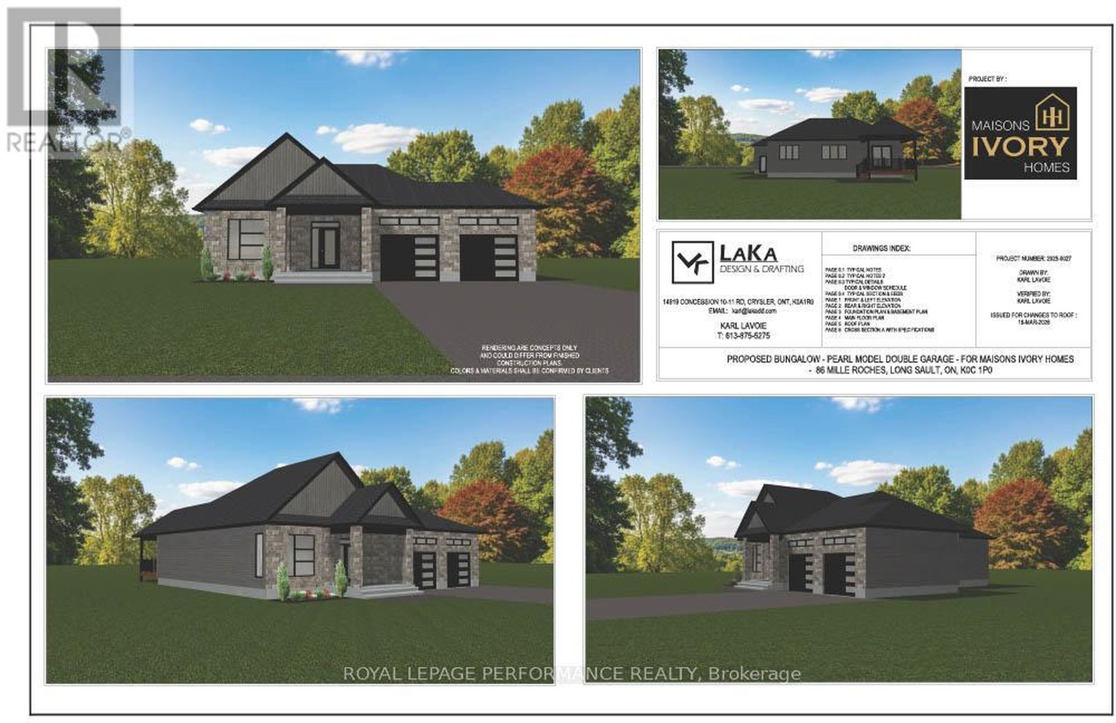 Introducing 86 Mille Roches Rd, in Long Sault! This exceptional to-be-built custom bungalow is located in one of Long Saults most sought-after neighborhoods. Thoughtfully designed with 1,441 sq. ft. of living space, this home offers a bright and airy open-concept layout - perfect for both everyday living and entertaining. From the spacious entrance, you're welcomed into an inviting living, dining, and kitchen area. The kitchen is a true focal point, complete with an oversized island, walk-in pantry, and generous cabinetry - an ideal setup for any home chef. The main floor features 2 well-sized bedrooms and 2 full bathrooms. The primary suite is a peaceful retreat with a walk-in closet, and a luxurious private ensuite. Step outside to enjoy your 12'x12' covered rear deck, perfect for relaxing or hosting guests. The exterior will be beautifully finished with a spacious 2-car garage, an asphalt driveway, front yard sod, and seeding in the side and rear yards. This home comes loaded with upgrades throughout, ensuring quality, comfort, and style in every corner. Built with care and backed by the Tarion Warranty Program, you can move in with confidence and peace of mind. Don't miss this opportunity to own a beautifully upgraded home, in a thriving, family-friendly community. Home is to-be-built, construction starts mid-May, closing date approx Oct/Nov 2026. *Price shown is net of New Rebates, such New Rebates are subject to the enactment of federal and provincial legislation and the purchase price is at all times subject to the terms of any APS between the builder and the buyer.* Ground photos are of a similar model previously built. Price, specs & details may be subject to change.
