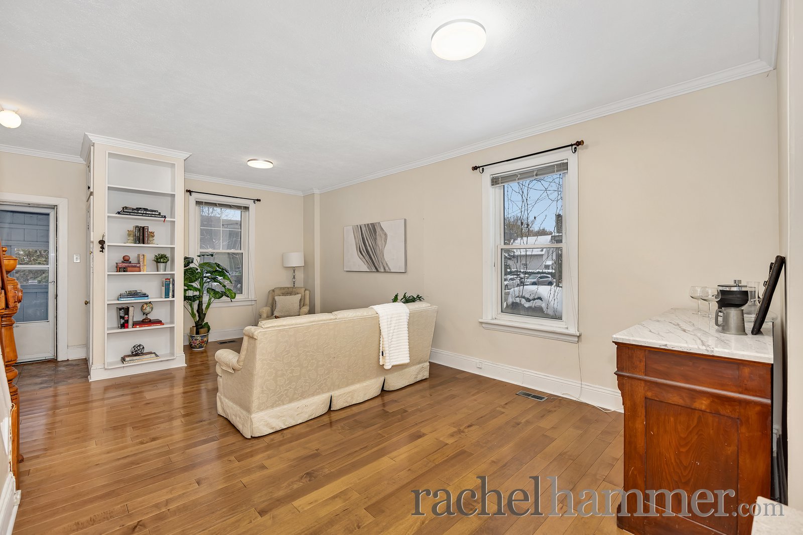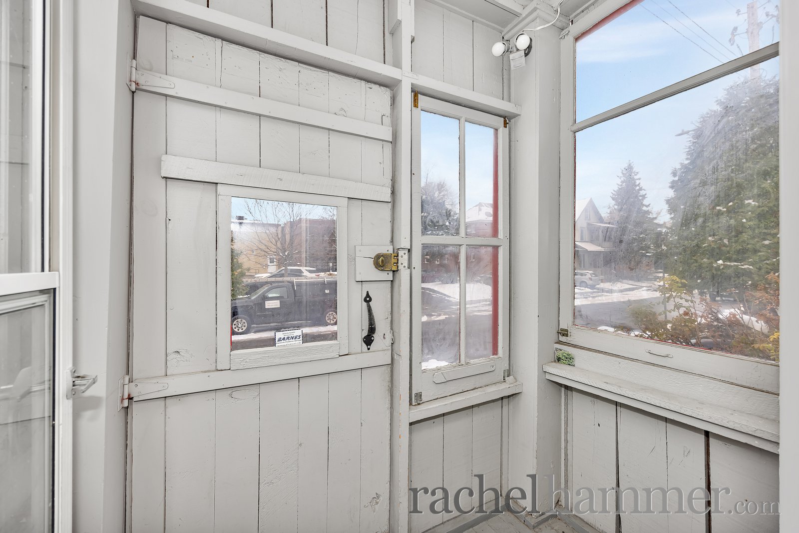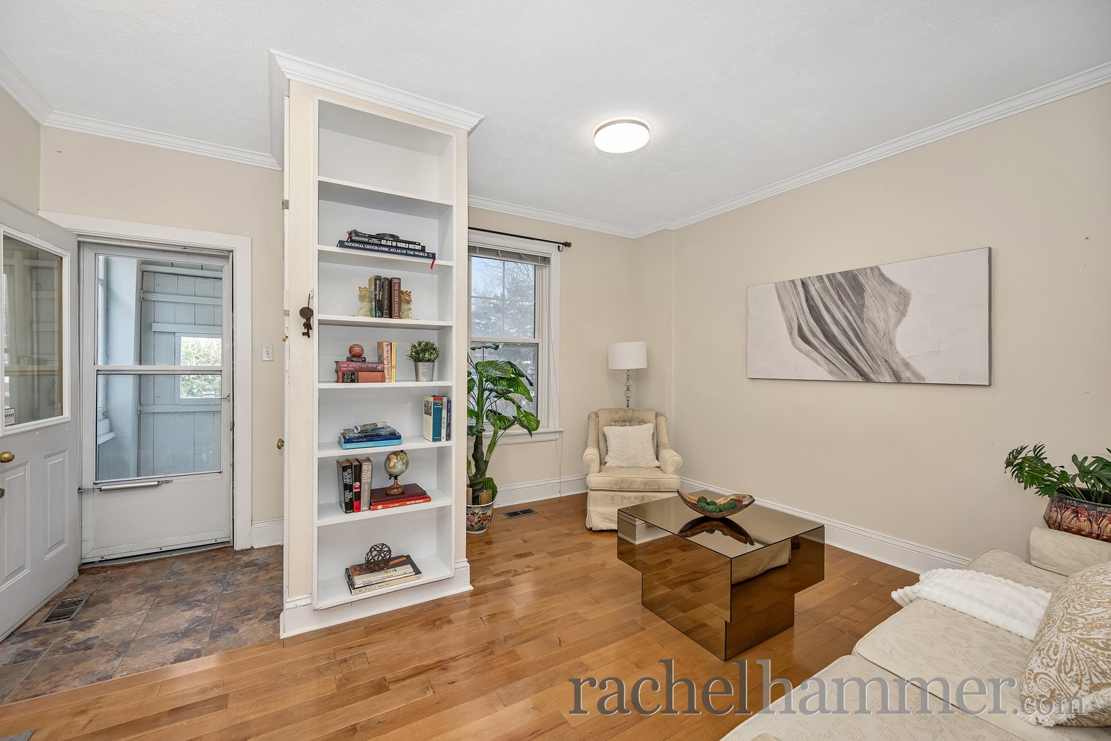 As we arrive at the home, you’re welcomed by a bright enclosed porch. It’s a wonderful transition space from outdoors to indoors. It sets the tone for the warmth and character you’ll find throughout the home.