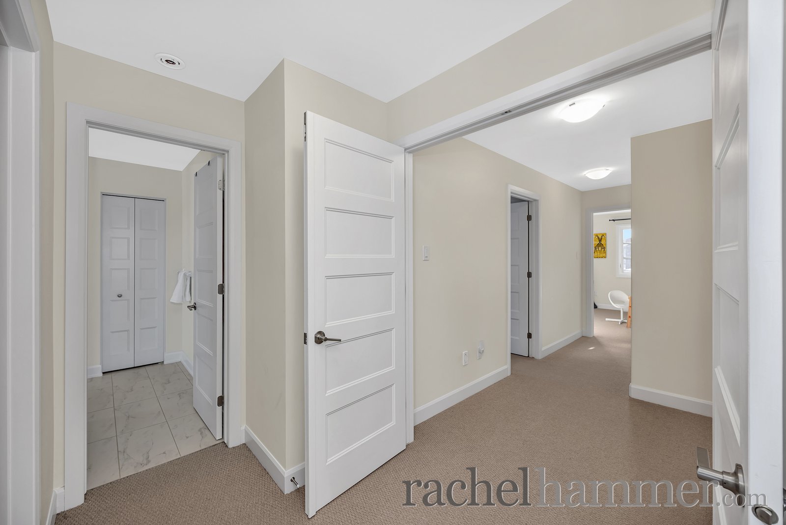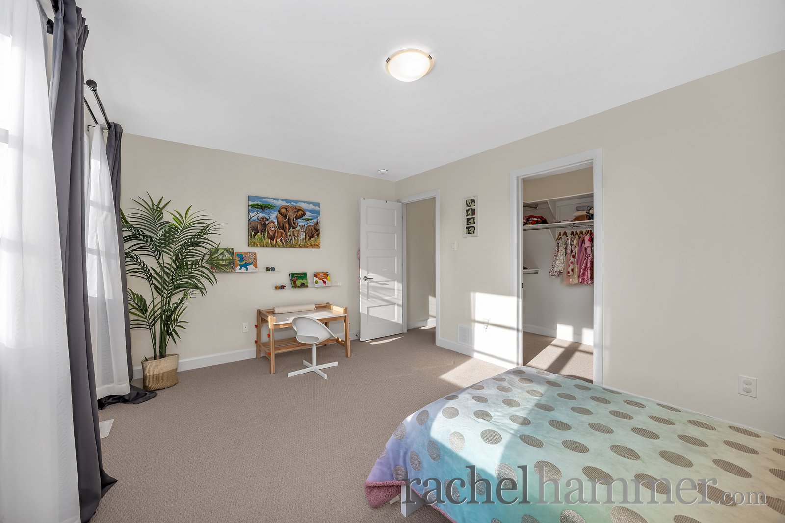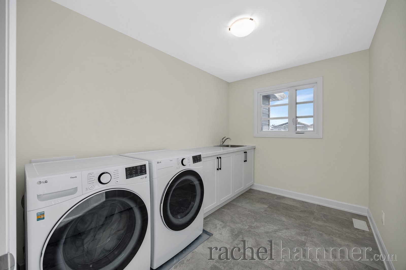 Upstairs, you’ll find four spacious bedrooms, each secondary bedroom complete with its own walk-in closet. The main bathroom features modern fixtures, a tiled floor, and a tub/shower combination. The full laundry room is thoughtfully designed with cabinetry, a sink, folding counters, and plenty of space for drying clothes.