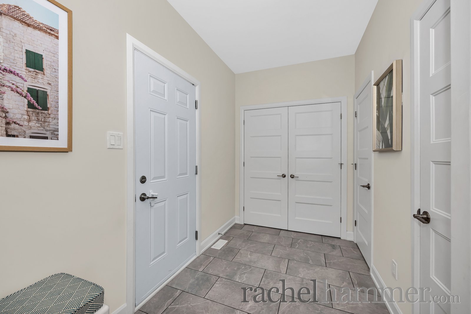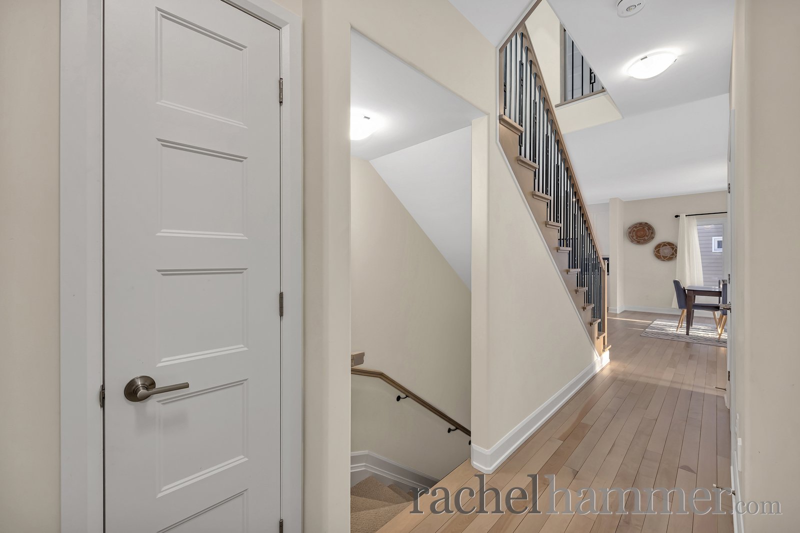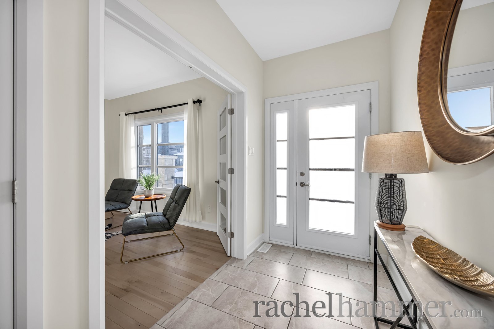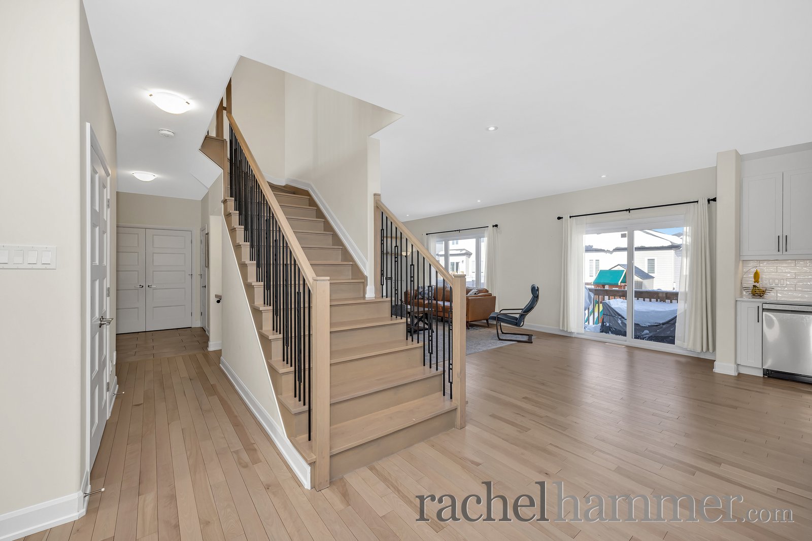 Step inside to a bright, tiled entrance that sets the tone for the elegant finishes throughout. The main floor features light hardwood flooring and an inviting layout, including a private office with glass French doors — perfect for working from home. A hardwood staircase with decorative metal railing adds a sophisticated architectural touch.