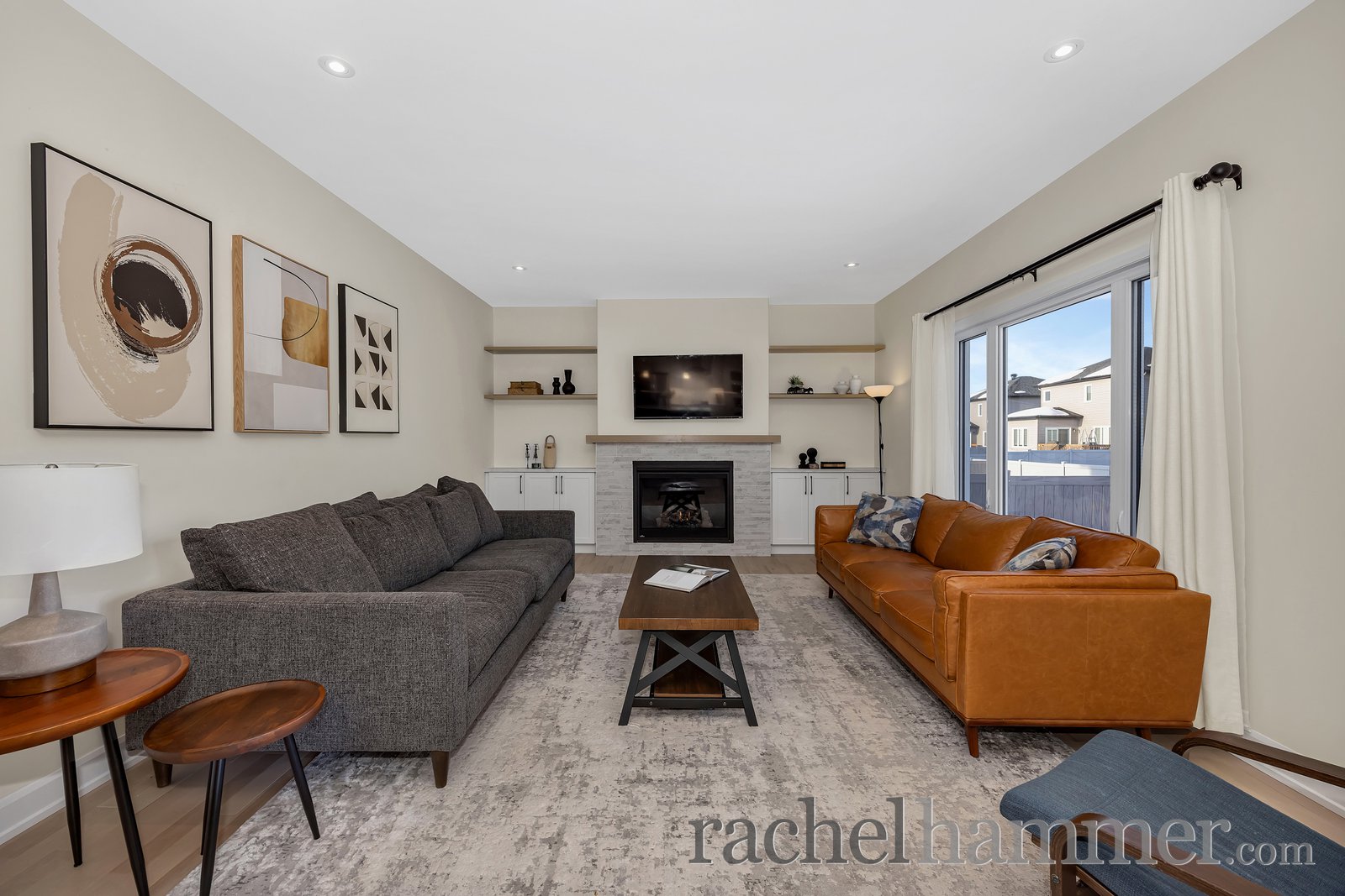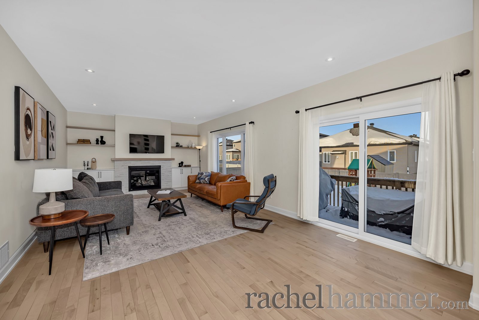 The extended living room provides extra room to gather and relax, featuring pot lights, custom built-in cabinetry, and a cozy natural gas fireplace with a beautiful stone surround. A convenient main-level powder room adds everyday practicality.