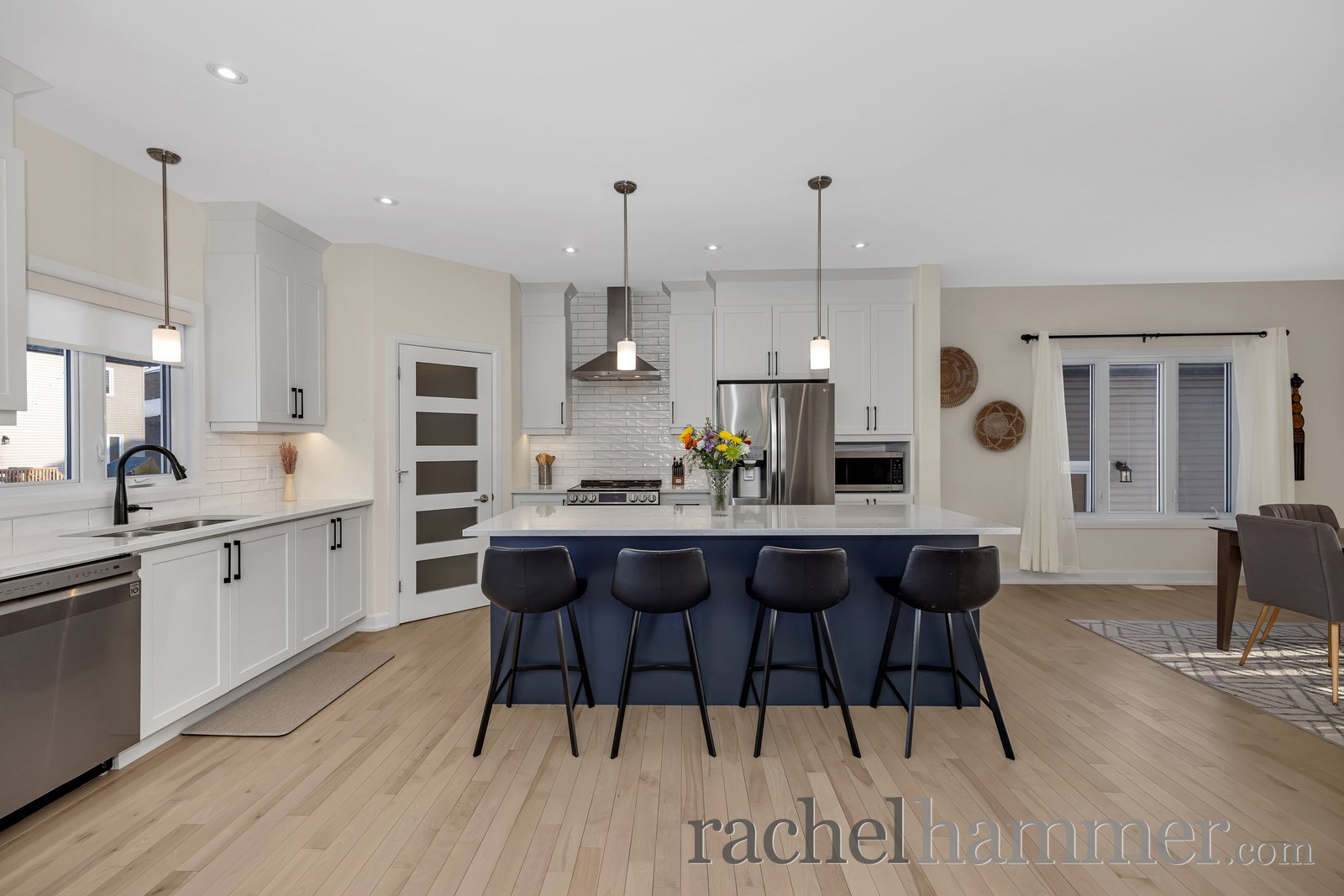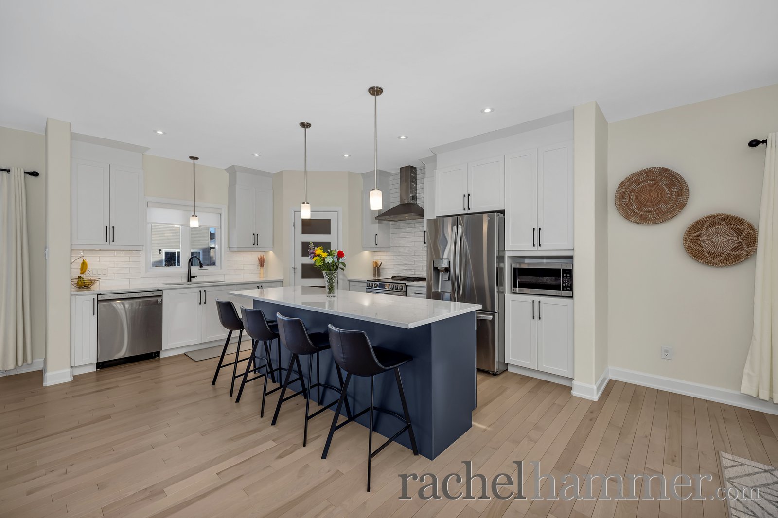 At the heart of the home is the show-stopping kitchen. Crisp white cabinetry is paired with quartz countertops and a subway tile backsplash for a timeless look. The large island showcases contrasting cabinetry and offers seating for four, making it ideal for casual meals and entertaining. Stainless steel appliances and a spacious walk-in pantry complete this functional and stylish space.