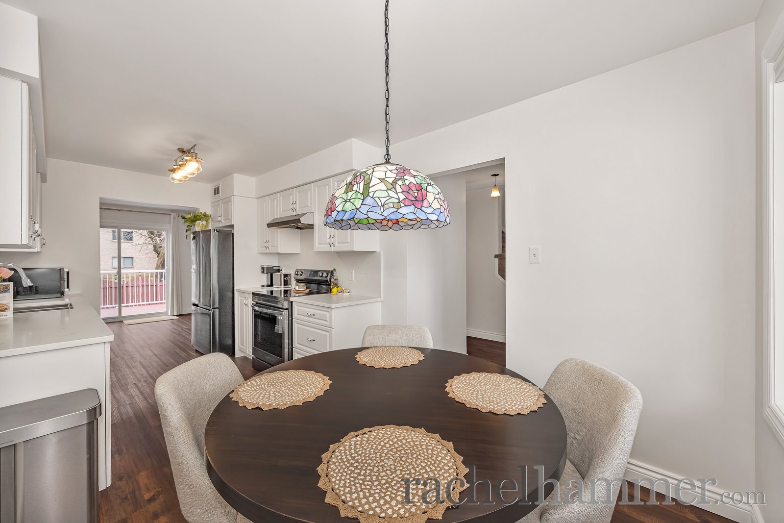 The main floor is bright and inviting, showcasing a seamless open-concept layout that’s perfect for both everyday living and entertaining. At the heart of the space is the fully redesigned kitchen with a convenient eat-in area, featuring new cabinetry, updated quartz countertops, and sleek black stainless steel appliances. The adjoining living and dining areas offer a warm, functional flow, enhanced by updated finishes and a new patio door that fills the space with natural light.